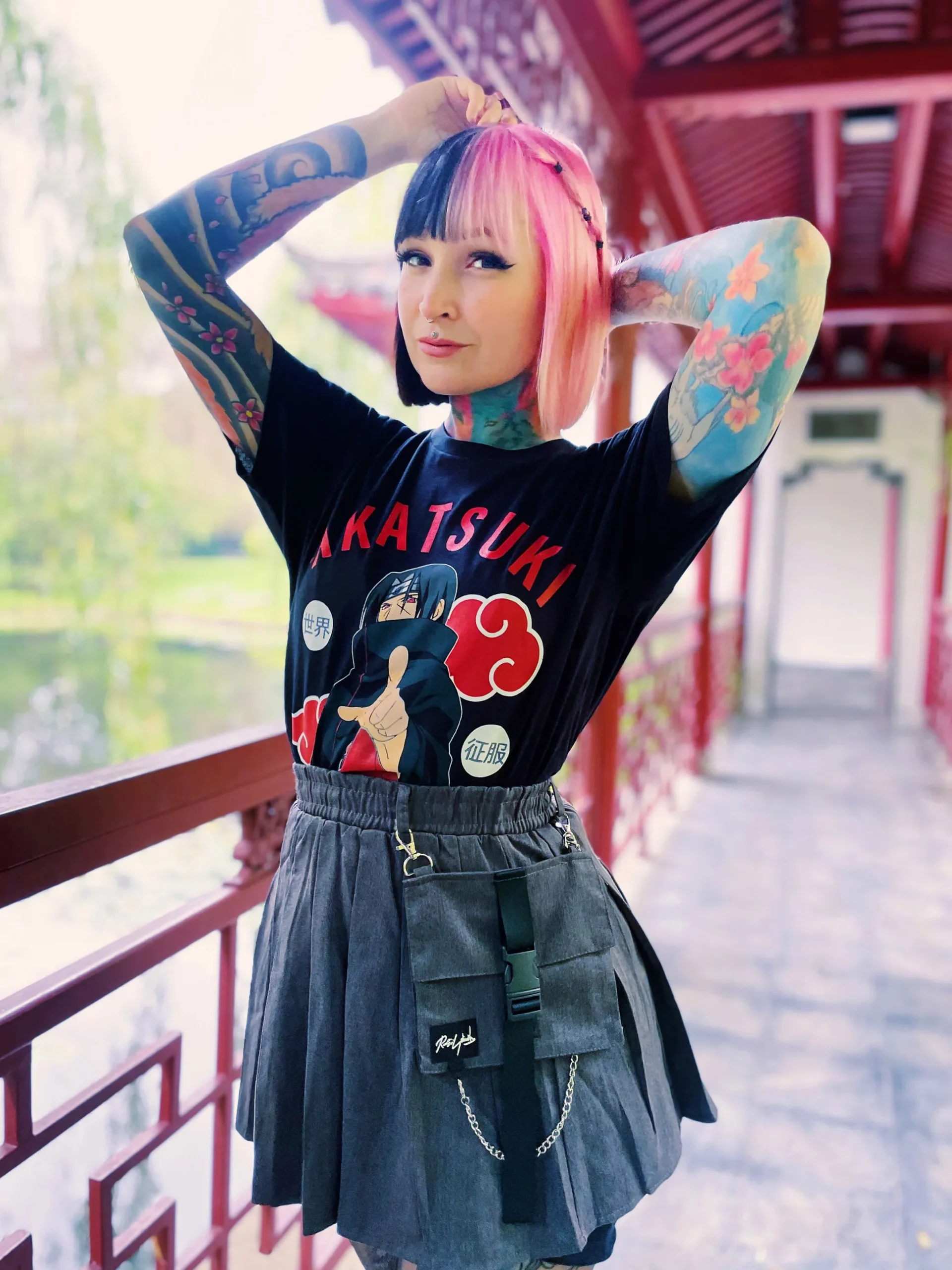 De grote print op de voorkant toont het Akatsuki-logo, Chinese tekens en Itachi Uchiha – klaar om elke ruimte met stoïcijnse flair binnen te stappen.