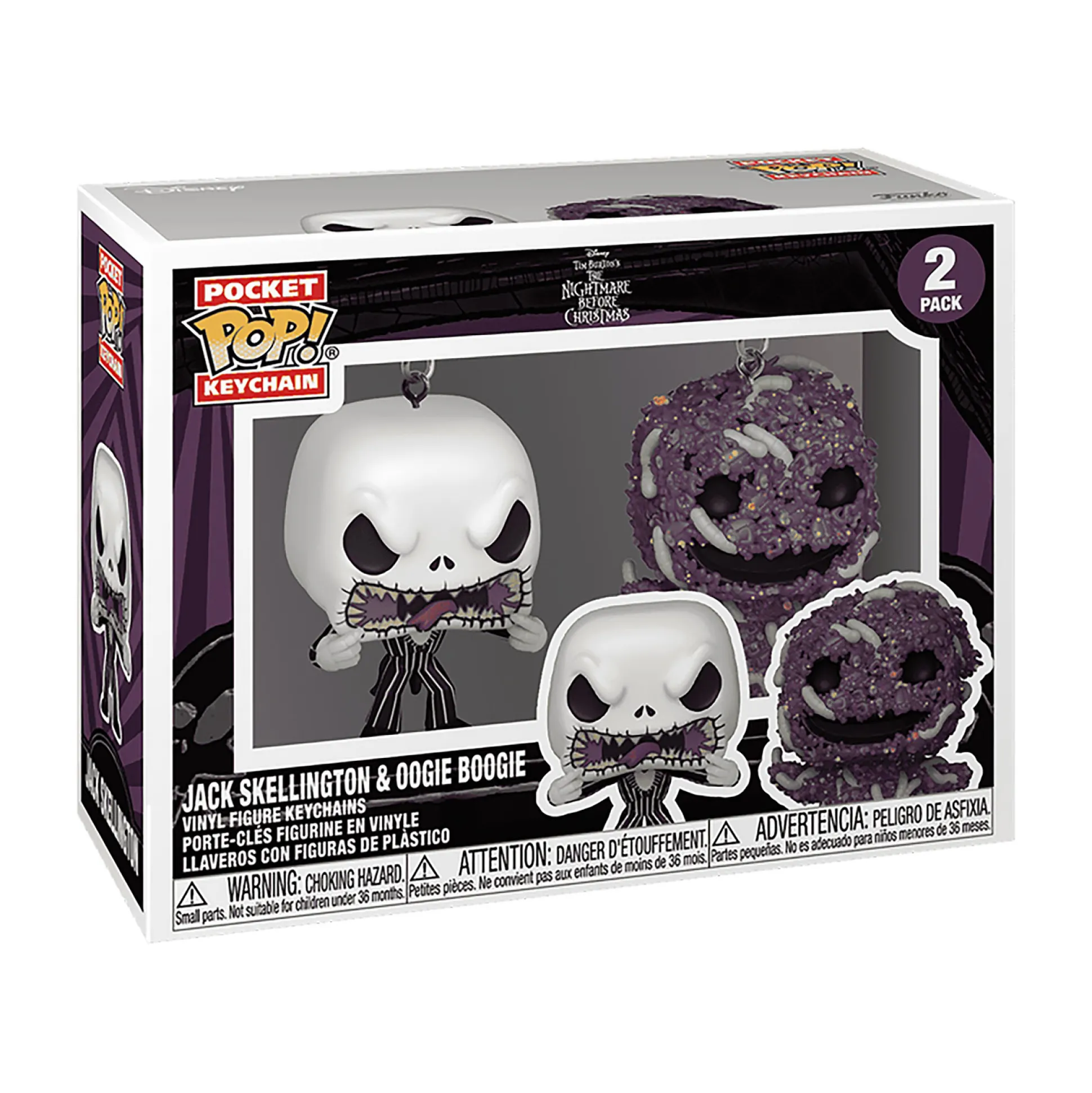 Neem Halloween-sfeer overal mee naartoe met deze officieel gelicentieerde Funko Pop! sleutelhanger 2-pack van Disney’s The Nightmare Before Christmas. Jack Skellington, de Pumpkin King, en zijn dobbelende aartsvijand Oogie Boogie komen als mini-vinyls aan je sleutelbos, je rugzak — of waar je ze maar aan wilt vastklikken.
