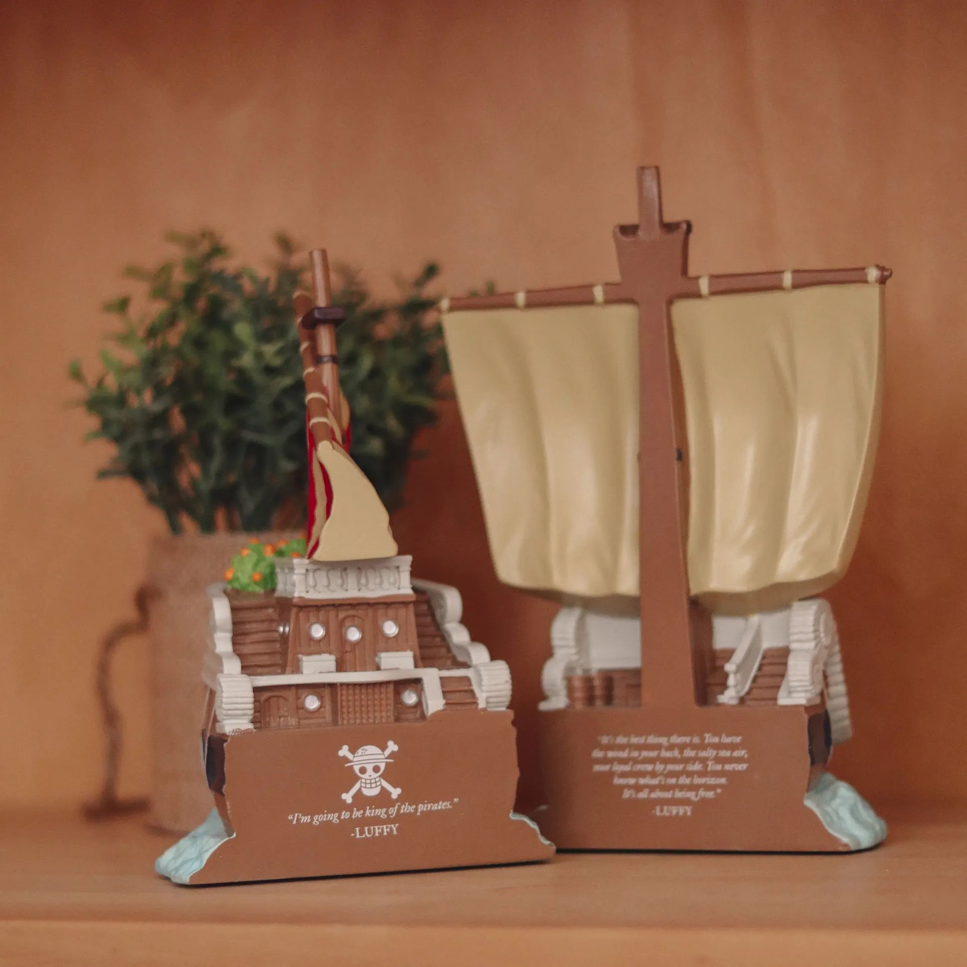 Aye aye! Zet je plank te water: met deze Going Merry boekensteunen blijft je bibliotheek op koers. Deze officieel gelicentieerde set van hoogwaardig kunsthars brengt het legendarische eerste schip van de Straw Hat Pirates rechtstreeks je huis in — vol met met de hand geschilderde details.