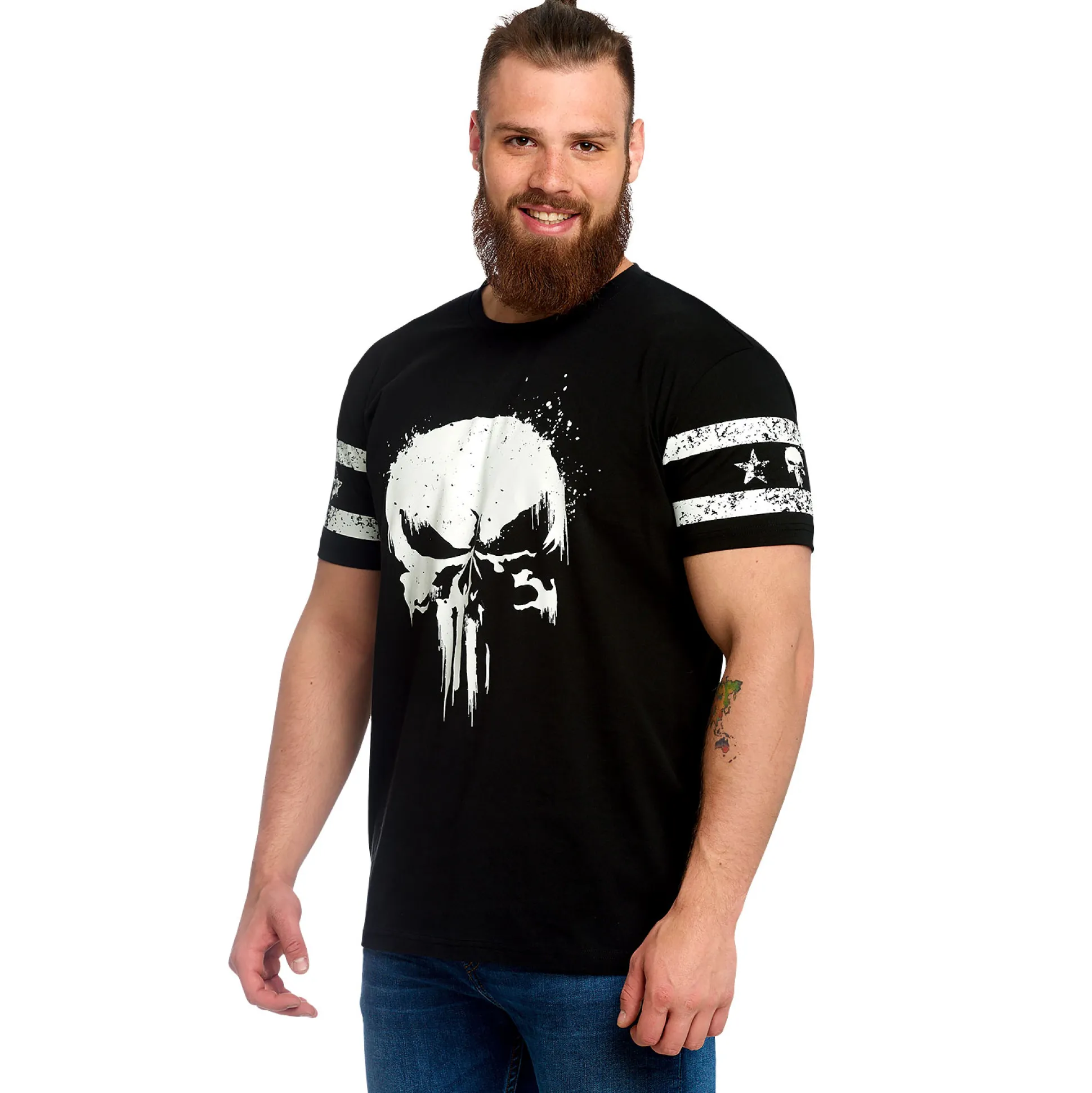 Tijd om je innerlijke antiheld te ontketenen, zonder meteen New York plat te gooien? Pak dan dit officieel gelicentieerde Marvel Punisher T-shirt! De iconische schedel siert de borst en de mouwprint verklapt: jij neemt recht in eigen hand. Zwart katoen, stoere prints aan de voorkant én op de mouw, relaxte rechte fit – klaar voor wraakacties richting koelkast. Voor fans, schurkenjagers en zij die het grijze gebied omarmen. Frank Castle zou je high-fiven.