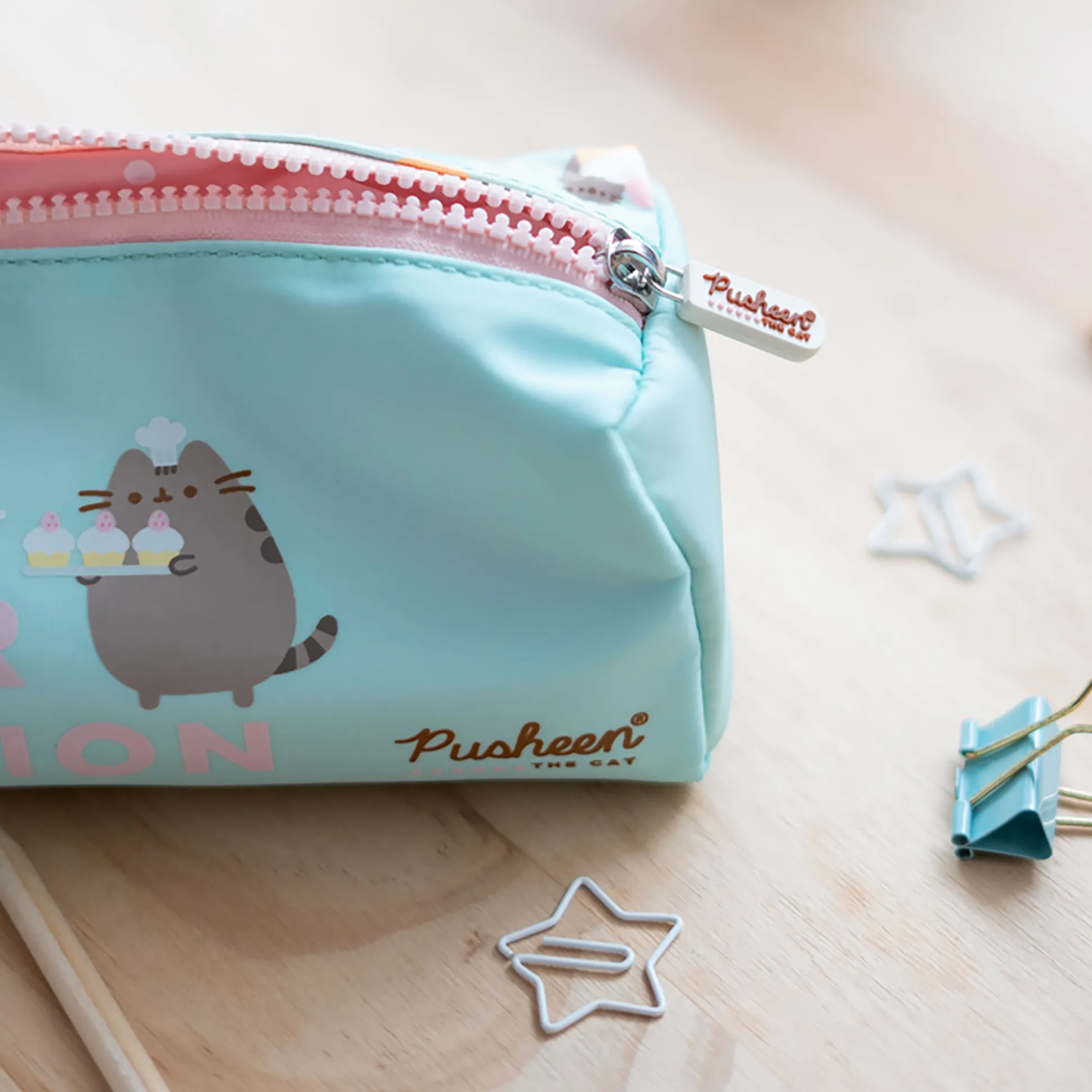 Zin in knapperige orde? Dit officieel gelicenseerde Pusheen etui serveert het design “Pusheen – Baked to Purr Fection” vers op je bureau. In groen en roze lijkt het op een zoete snack, maar is verrassend ruim: met rits und draaglus is er plek voor pennen, een puntenslijper en zelfs een schaar. Geen pennen nodig? Het werkt net zo goed als make-uptasje of kleine toilettas. Afmetingen: 21,5 x 8 x 7,5 cm – ideaal voor school, uni, kantoor of een weekendtrip. Trakteer jezelf op een portie Pusheen-charme en maak van orde het toetje.