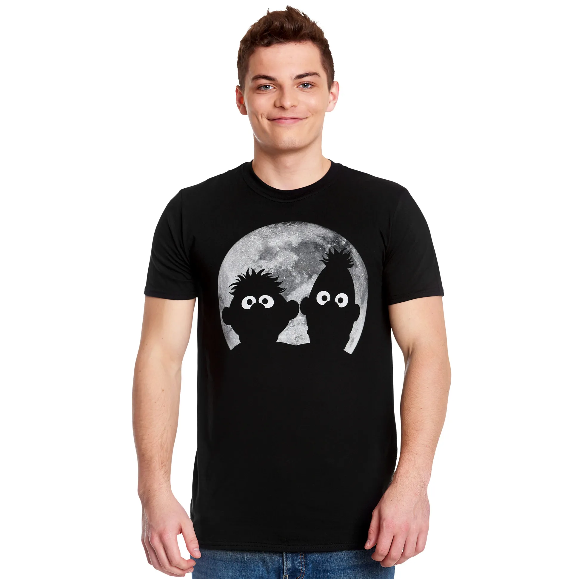 Ernie en Bert draaien de nachtdienst! Op dit officieel gelicentieerd Sesamstraat T-shirt schitteren de twee legendarische huisgenoten in het “Moonnight”-motief tegen zwart – perfect voor iedereen die bij maanlicht nog even rubberen eendjes telt. Comfortabel met rechte pasvorm en ronde hals matcht ’ie met jeans, joggers of die 2‑uur‑’s‑nachts tocht naar de koelkast. Zwarte kleur, sterk silhouet, discussie klaar: jouw statement voor bromance, huisgenotenfilosofie en iconische jeugdsentimenten. Pak de nachteditie van Ernie en Bert en draag ’m overal – Comic‑Con, bankmarathons of koekjesraids.