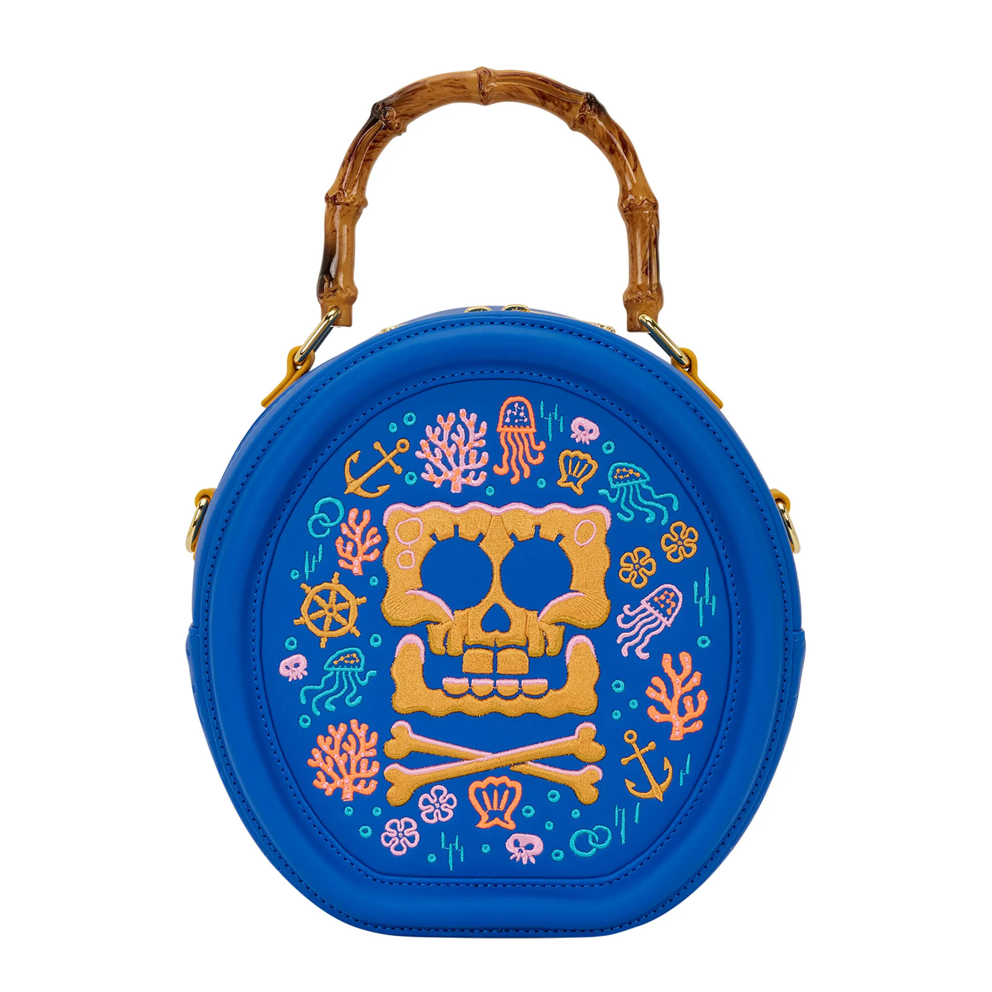 Op de voorkant prijkt een geborduurde SpongeBob schedel, plus kleine symbolen die duidelijk maken: deze tas is schattig, maar zeker niet te onderschatten. Binnenin wacht een ruim hoofdvak met bedrukte voering – perfect voor je telefoon, portemonnee, snacks en alles wat je nodig hebt voor je volgende onderwateravontuur (alsof: shoppen, college of een concert).