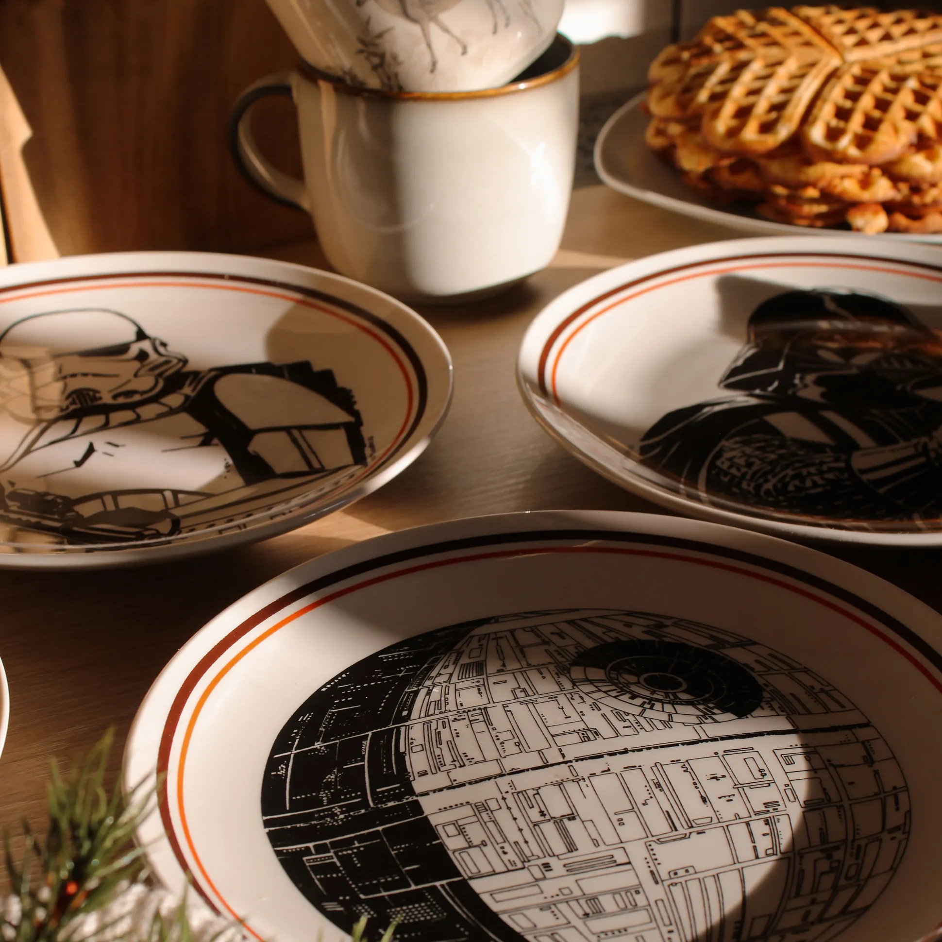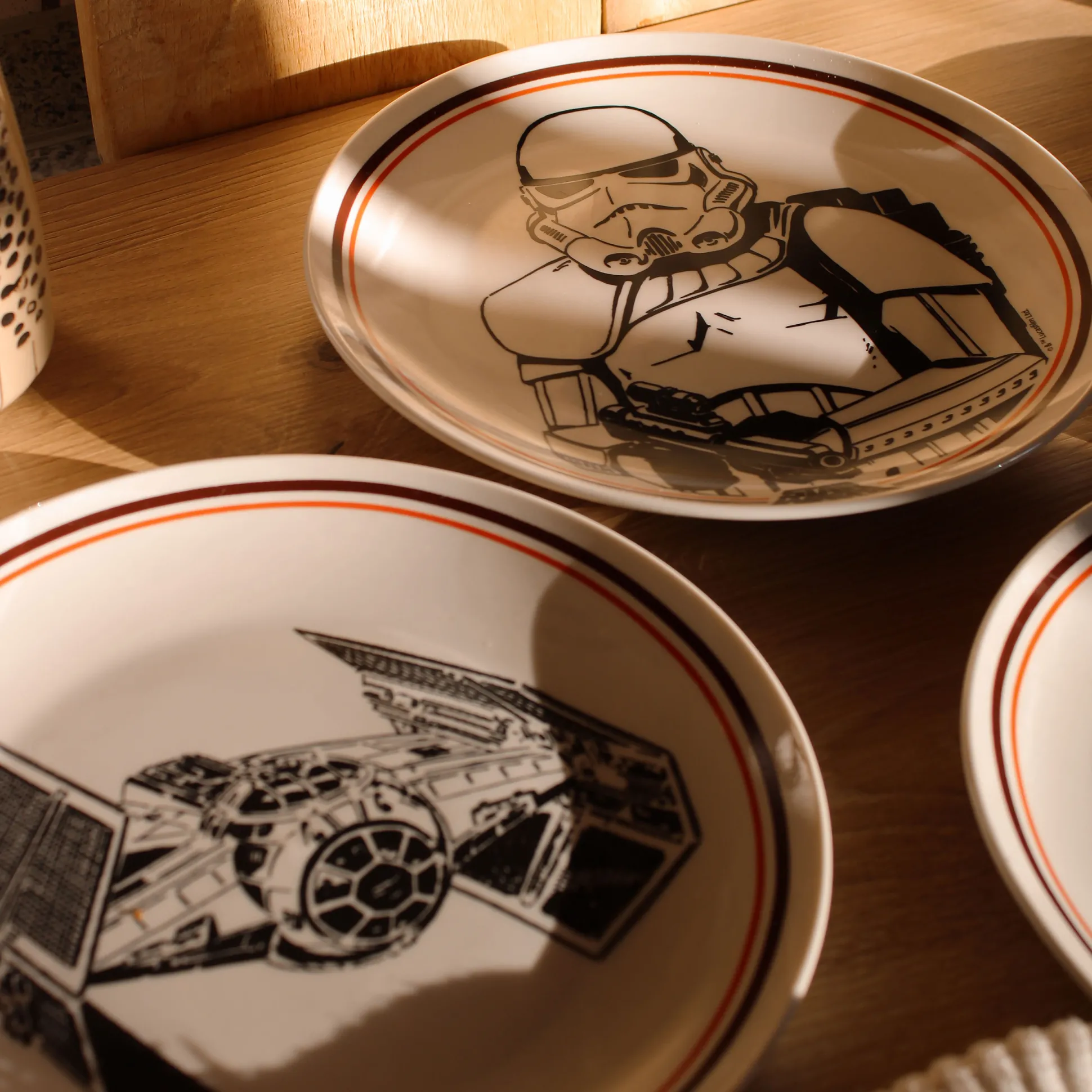 De trek slaat toe – en de Dark Side dekt de tafel. Deze officieel gelicentieerde Star Wars bordenset brengt vier iconische designs naar je keuken: Darth Vader, een Stormtrooper, de Death Star en Vaders TIE Advanced x1. Elk bord is 20 cm in diameter – perfect voor snacks, taart of pizzapunten tijdens je volgende saga-marathon. Vaatwasser- en magnetronbestendig, zodat jij kunt bingewatchen in plaats van boenen. Het perfecte cadeau voor iedereen die de Force niet kan weerstaan.