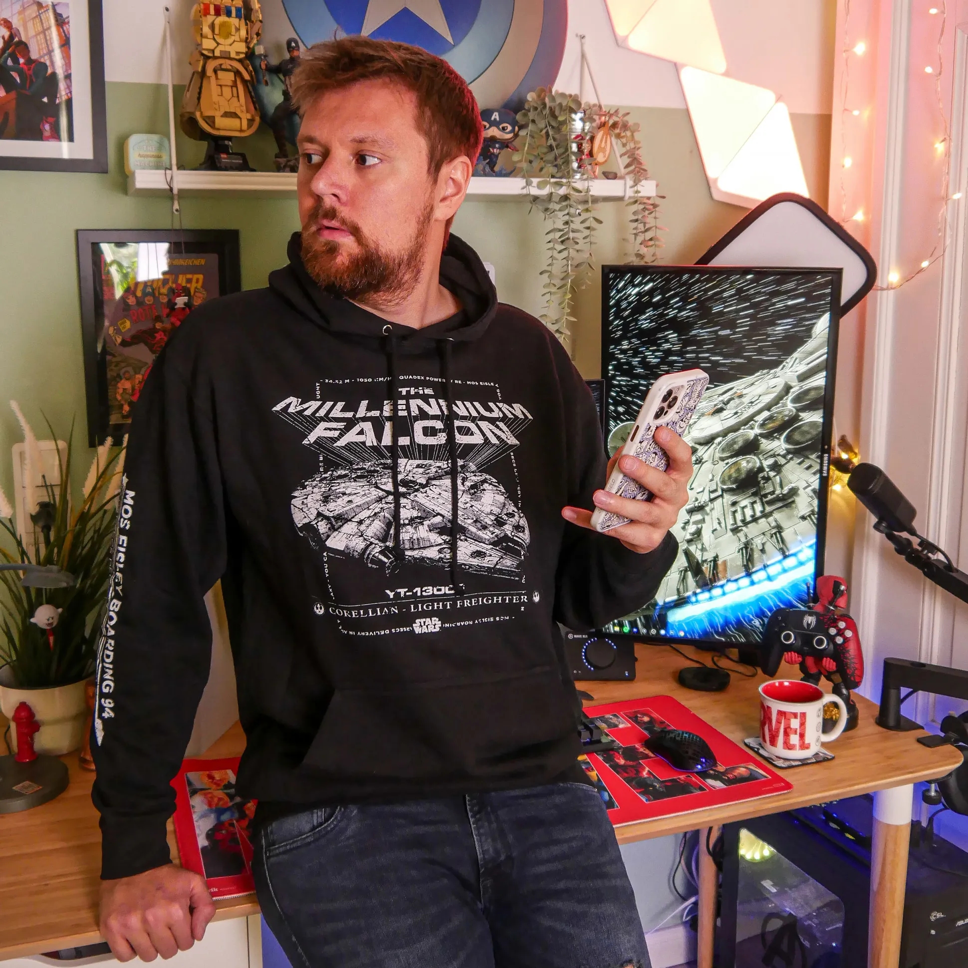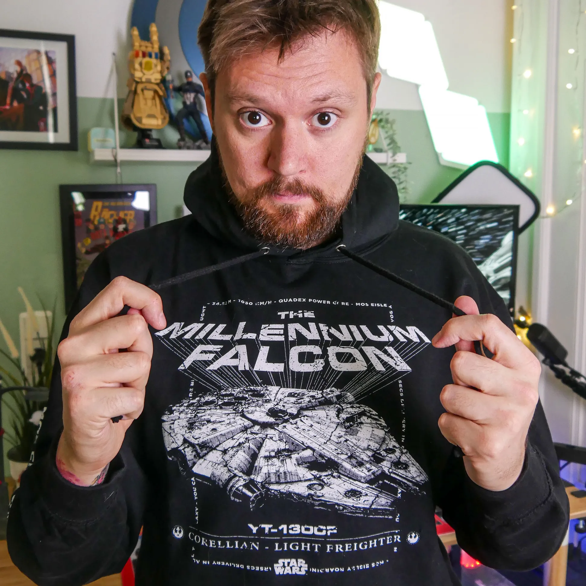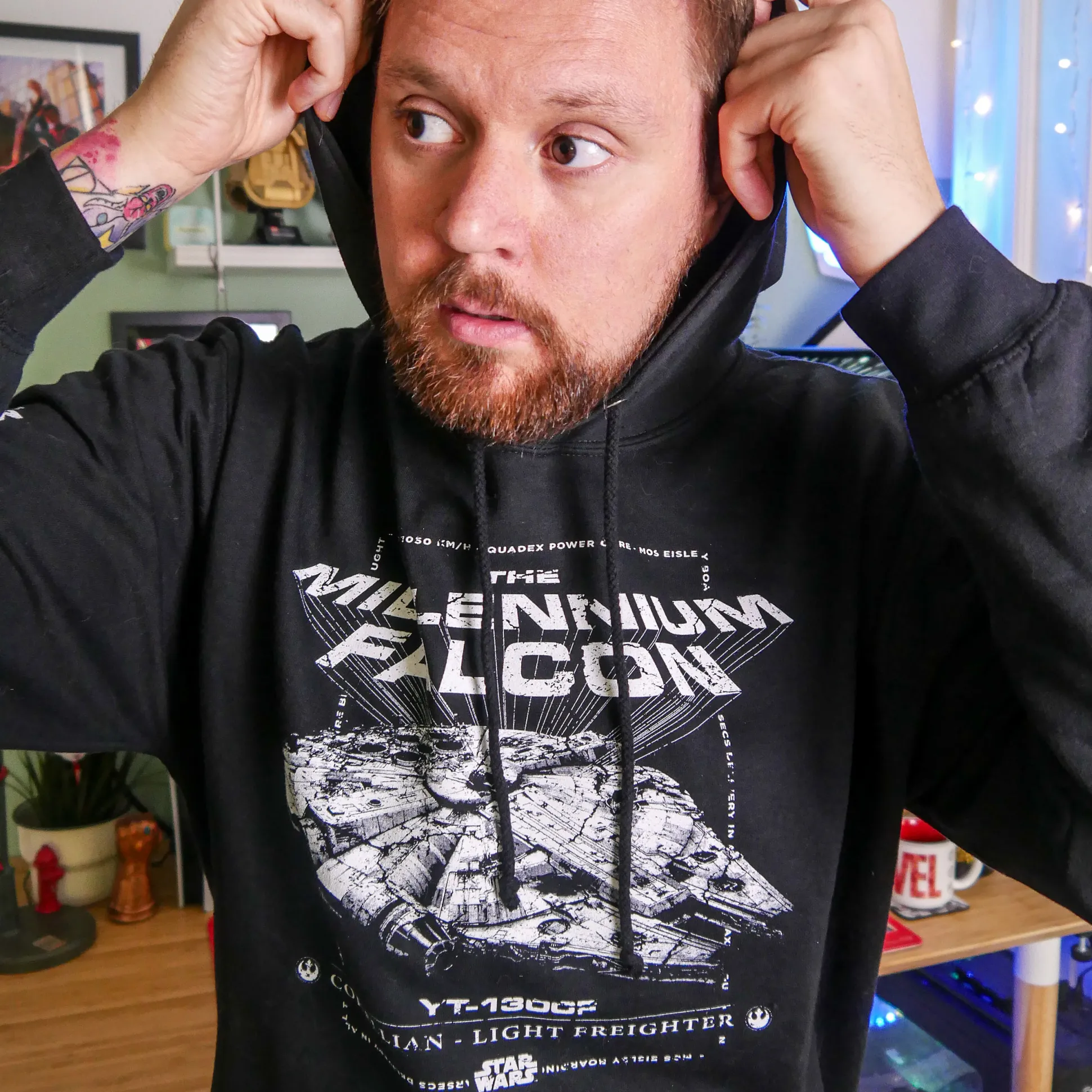 Grijp de snelste schroothoop van het heelal — nu als hoodie. Een grote Millennium Falcon-frontprint op diepzwart, klaar om op te stijgen vanaf Mos Eisley. Op de mouw staat “Mos Eisley Boarding 94” — een knipoog die alleen schurken herkennen. Zacht opgeruwd aan de binnenkant, stevige boorden, capuchon met trekkoord en een voorzak: officieel gelicentieerde Star Wars-hoodie die je warm houdt als Tatooine weer een zandstorm loslaat. Voor je volgende Kessel Run in minder dan 12 parsec, of gewoon elke dag: aantrekken en naar lightspeed.