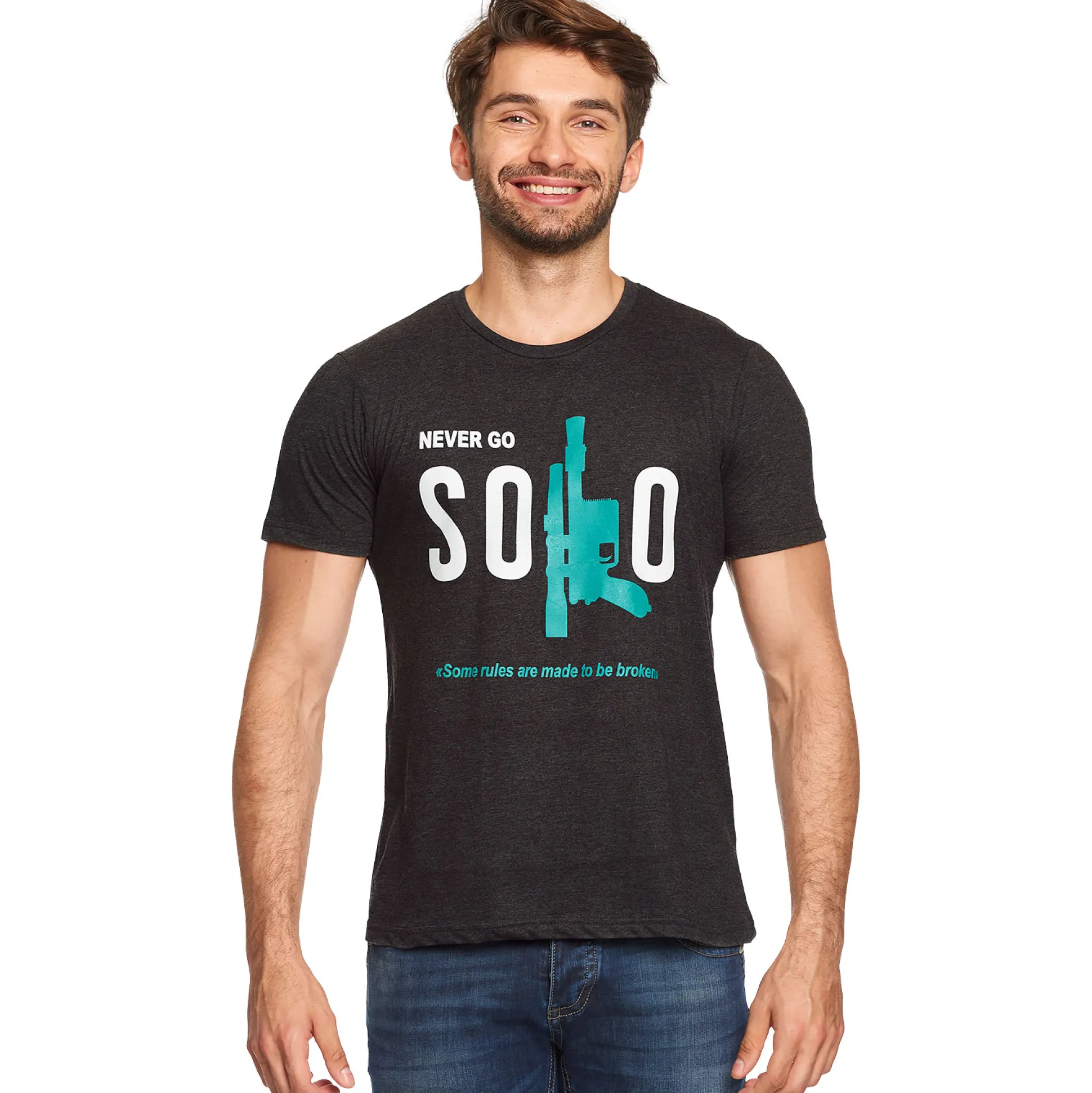 Voor iedereen die liever met rebellen proost dan in z’n eentje door het sterrenstelsel dwaalt: het officieel gelicentieerde Star Wars ‘Never Go Solo’ T-shirt is jouw perfecte maatje. Grote print aan de voorkant op donkergrijs, rechte pasvorm en klassieke ronde hals – laat zien dat je teamspirit belangrijker vindt dan solo-acties. Moge de stijl met je zijn!