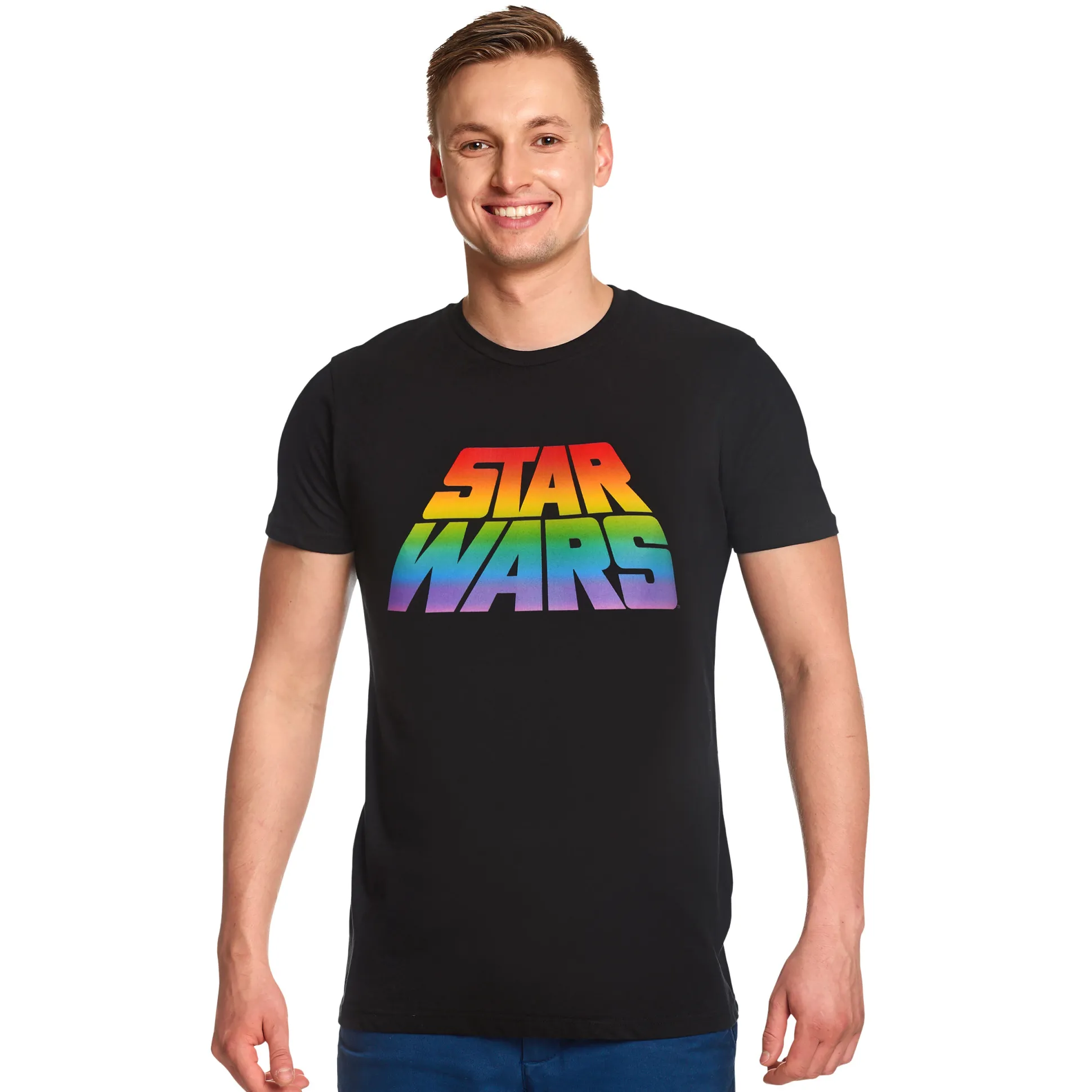 Dit is the Way — in alle kleuren! Met het officieel gelicentieerde Star Wars Pride T‑shirt laat je de hele melkweg zien waar jouw hart de hyperruimte van in schiet. Het iconische logo schittert in regenboogdesign en maakt op zwarte stof een statement dat zelfs stormtroopers niet kunnen missen. Perfect voor elke dag, cons of selfies. De pasvorm is recht, de ronde hals relaxed — aantrekken, goed voelen, kleuren tonen. Moge de Pride met je zijn!