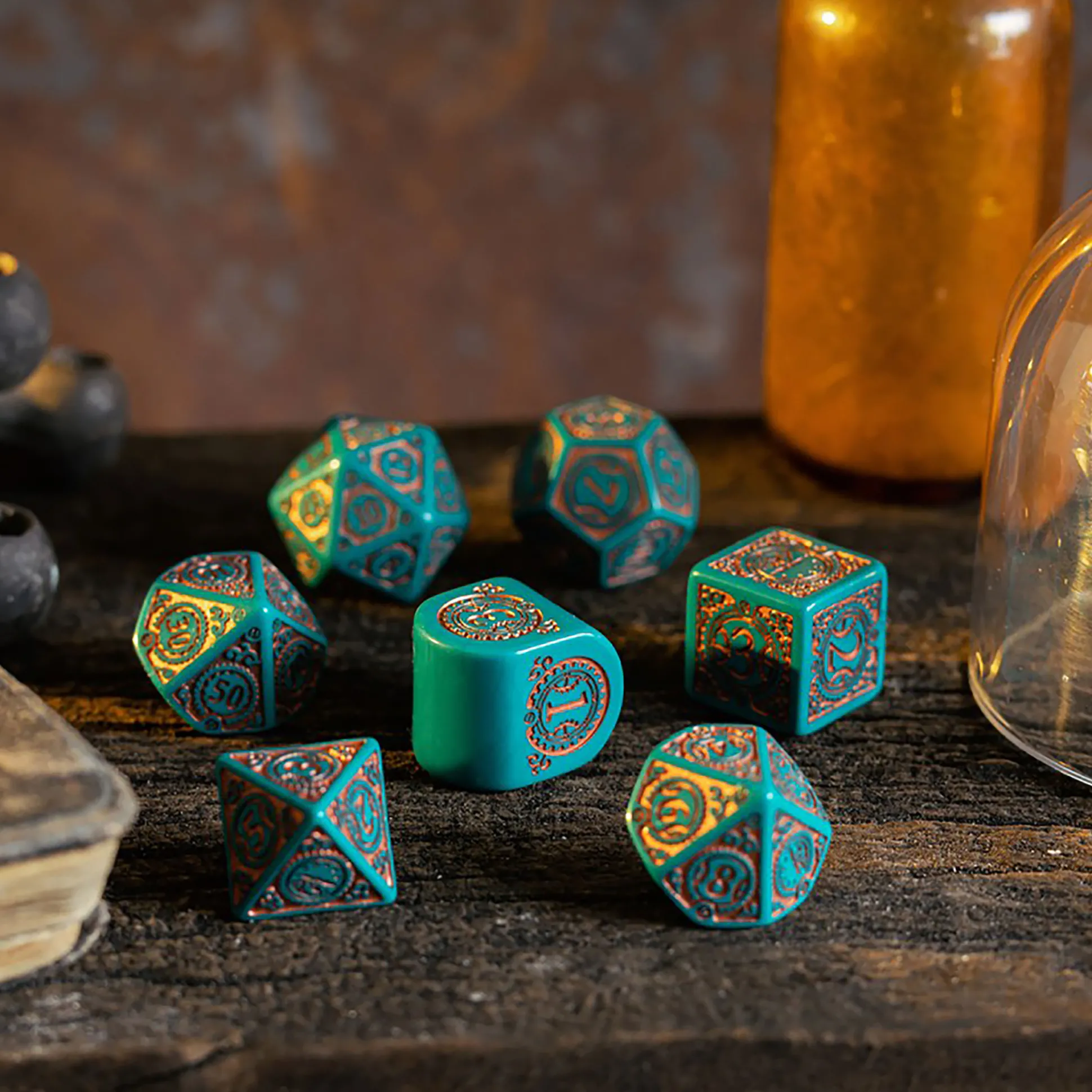 - Zijden met gegraveerde motieven, dobbelstenen met verschillende aantallen zijden