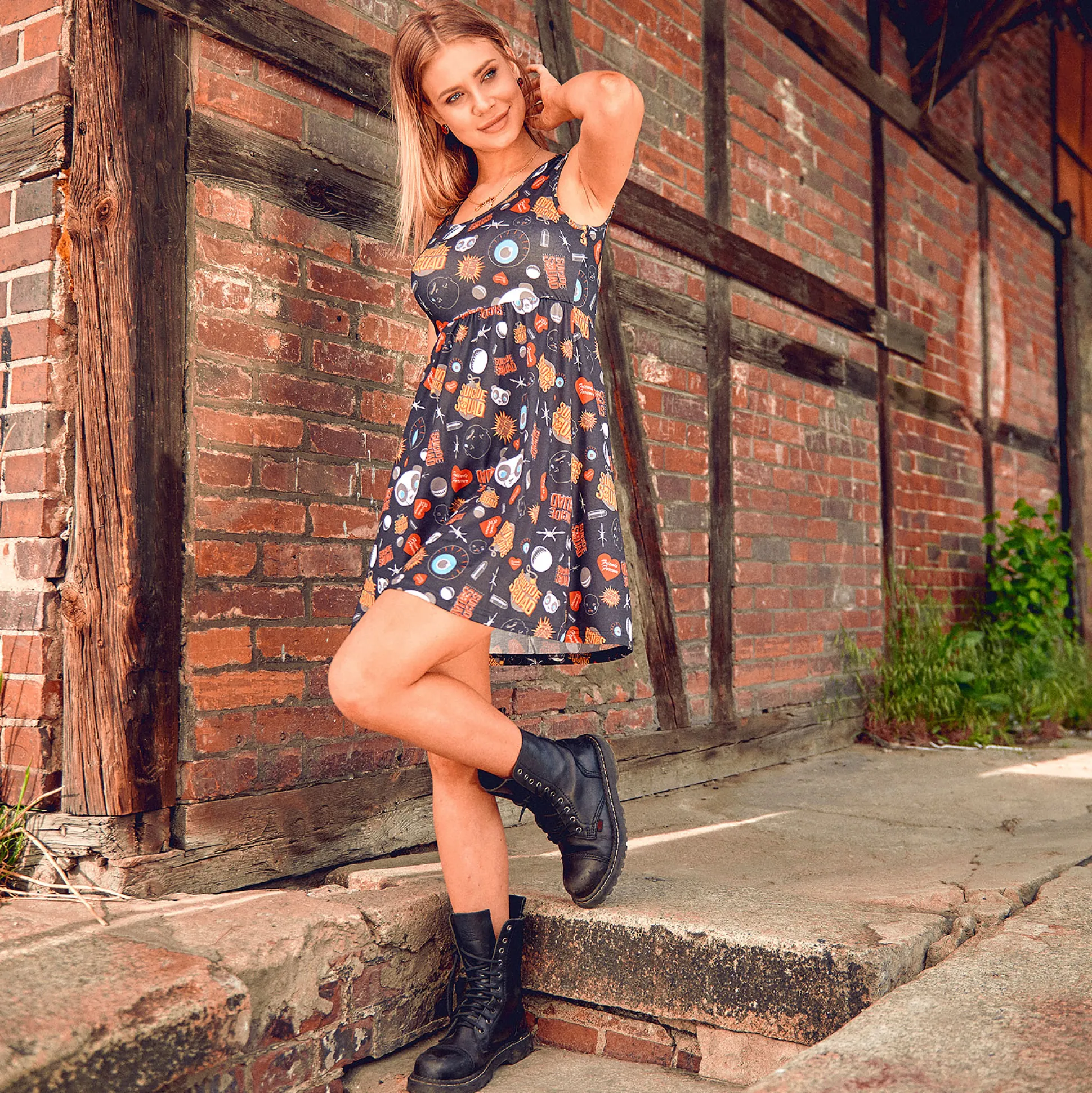 Ben je klaar met saaie outfits? Sluit je aan bij de Squad! Met deze exclusieve Suicide Squad mini-jurk maak jij direct duidelijk dat je stijl én gekte in huis hebt. De all-over Suicide Squad logo’s laten iedereen zien: hier loopt een echte fan! Het mouwloze, getailleerde model met elastische tailleband en zwierige rok zorgt voor ultiem draagcomfort én een opvallende look – of je nu de stad in gaat of richting de volgende con. Zwart voor de basis, kleurrijk voor de extra pit. Alleen bij Elbenwald – zo ziet ongekende coolheid eruit!