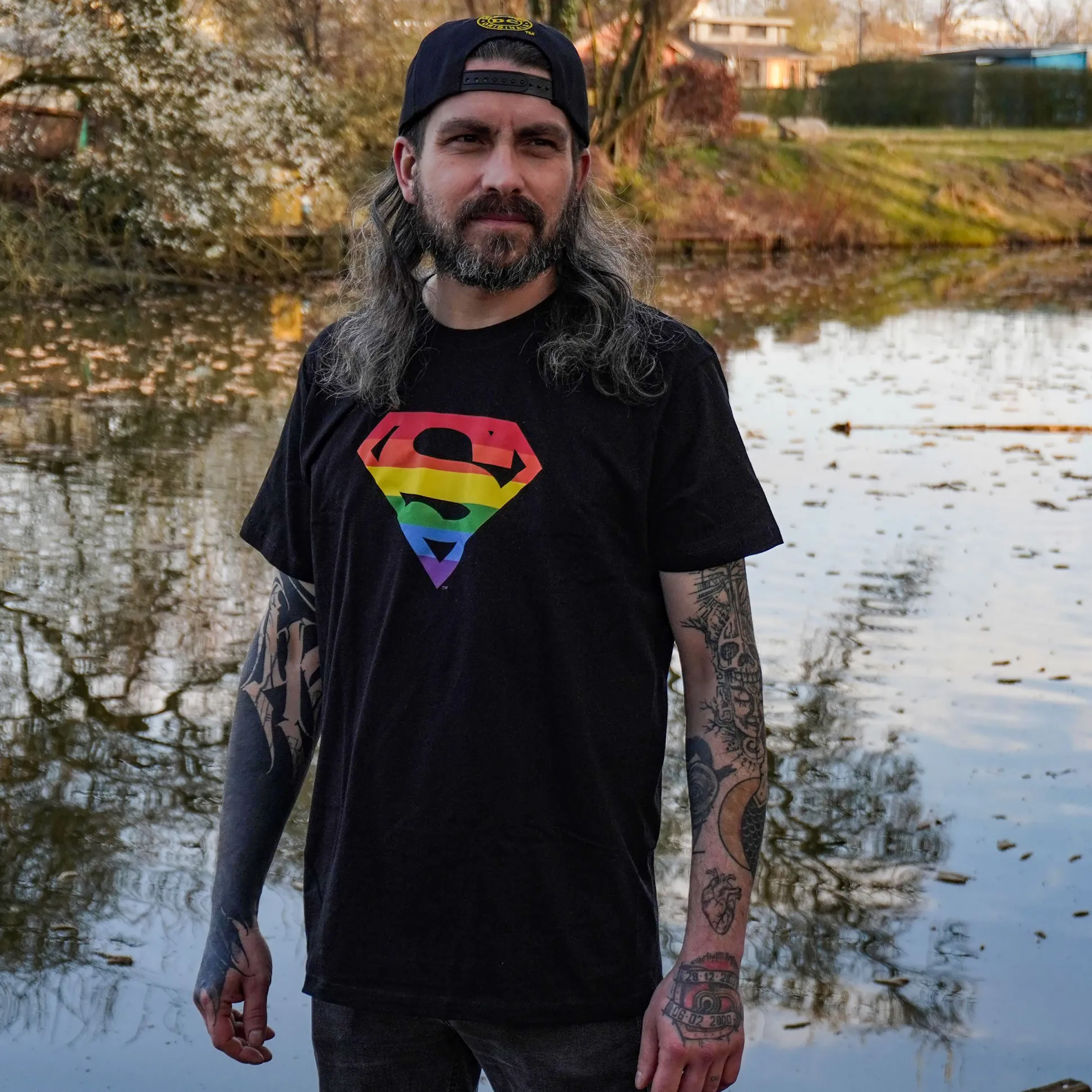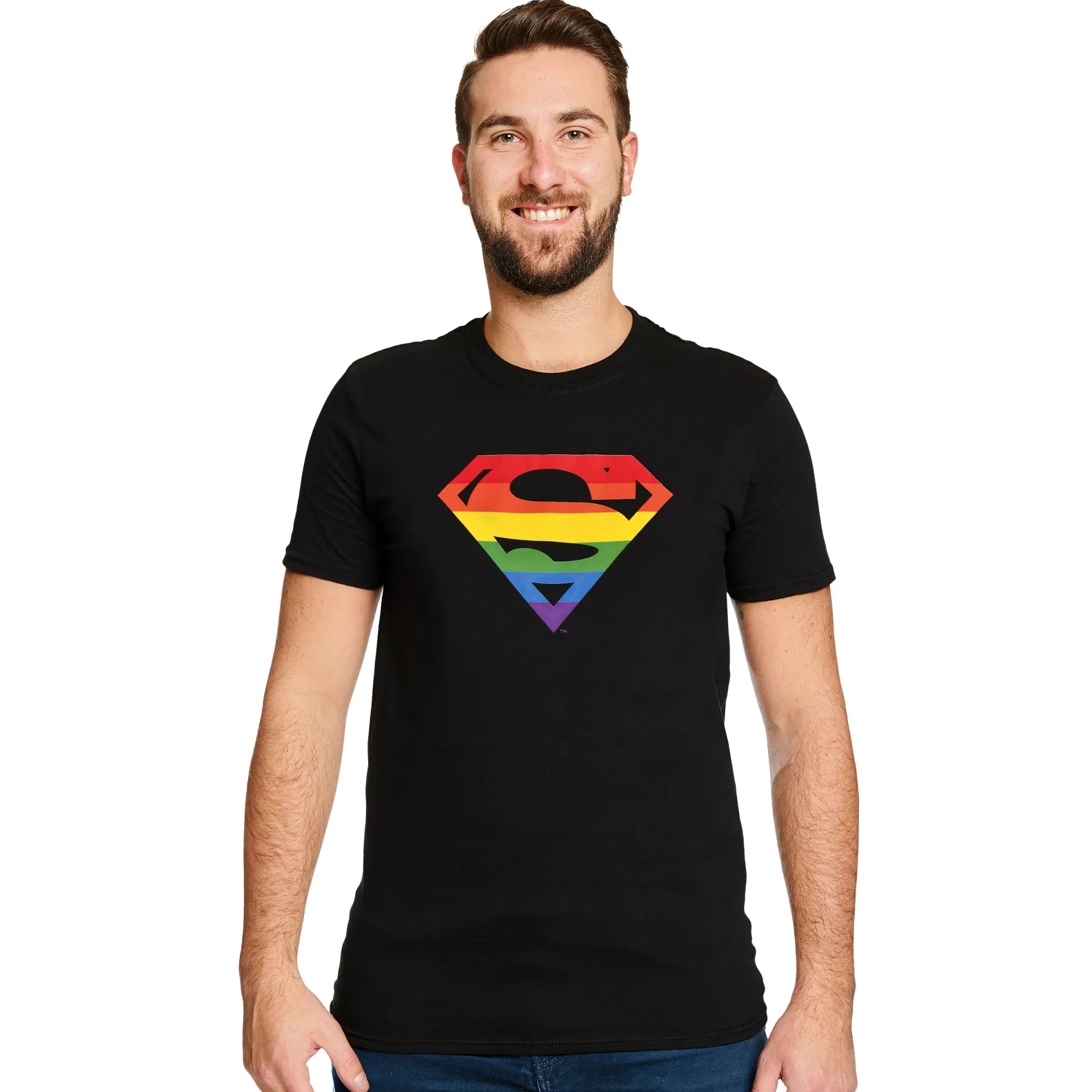 Metropolis? Leuk, maar dit gaat om Pride. Met dit officieel gelicenseerde DC Comics T-shirt draag je het iconische Superman-schild in knallende regenbooglook groot op je borst. Zwarte basis, grote frontprint: statement aan, cape optioneel.