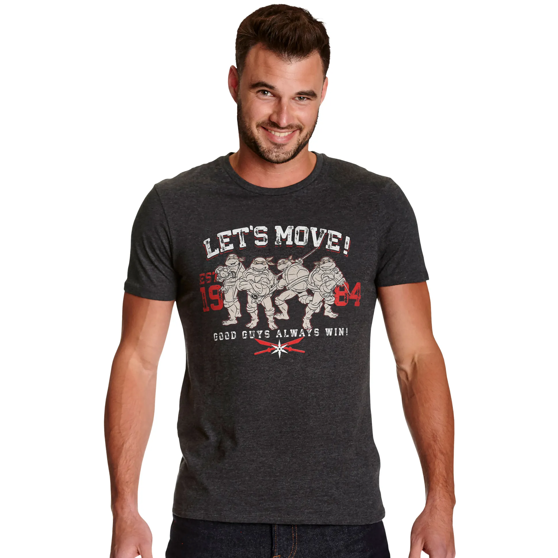 Klaar, set, putdeksel open: Let’s Move! Met Leonardo, Michelangelo, Donatello en Raphael op je borst ben je klaar voor elke missie – van boodschappen-ninja tot pizza-expeditie. Dit officieel gelicentieerde Teenage Mutant Ninja Turtles T-shirt heeft een grote print met de “Let’s Move!”-tekst, een rechte fit en een comfortabele ronde hals. De kleur is donker gemĂȘleerd grijs; matcht met alles, van jeans tot joggers, en laat de Turtles extra opvallen. Perfect voor trainen, chillen of je volgende nachtpatrouille. Haal wat sewer style in je dagelijks leven en laat zien: Cowabunga is geen kreet, maar een lifestyle.