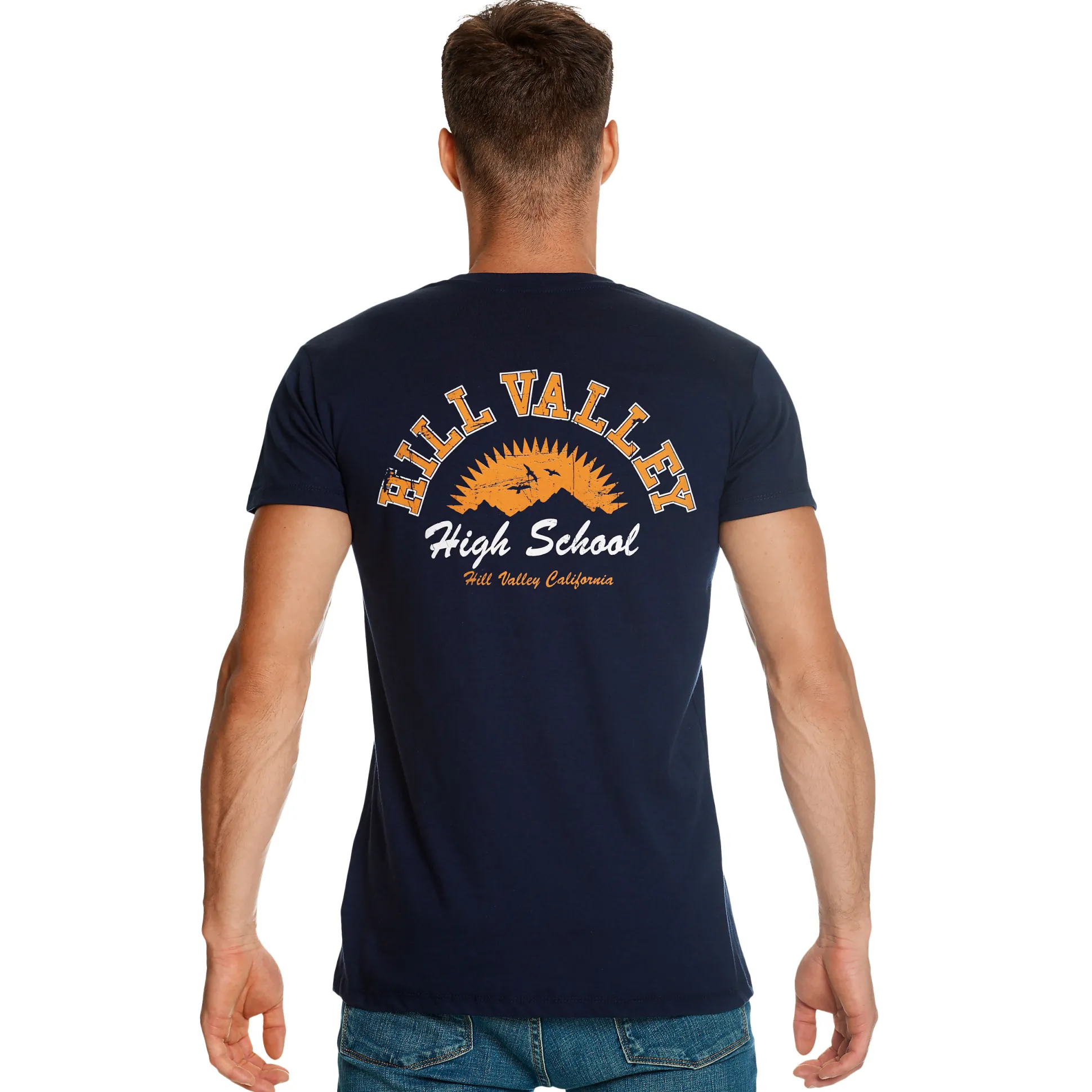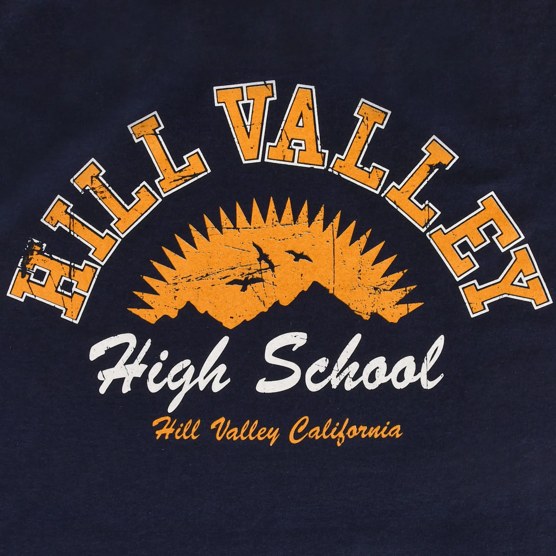 Geen tijdmachine nodig: dit blauwe Hill Valley T-shirt brengt pure Back to the Future vibes naar je kledingkast. Voorop een kleine Hill Valley, California borstprint; achterop een grote Hill Valley High School print – schoolspirit in Marty-stijl.