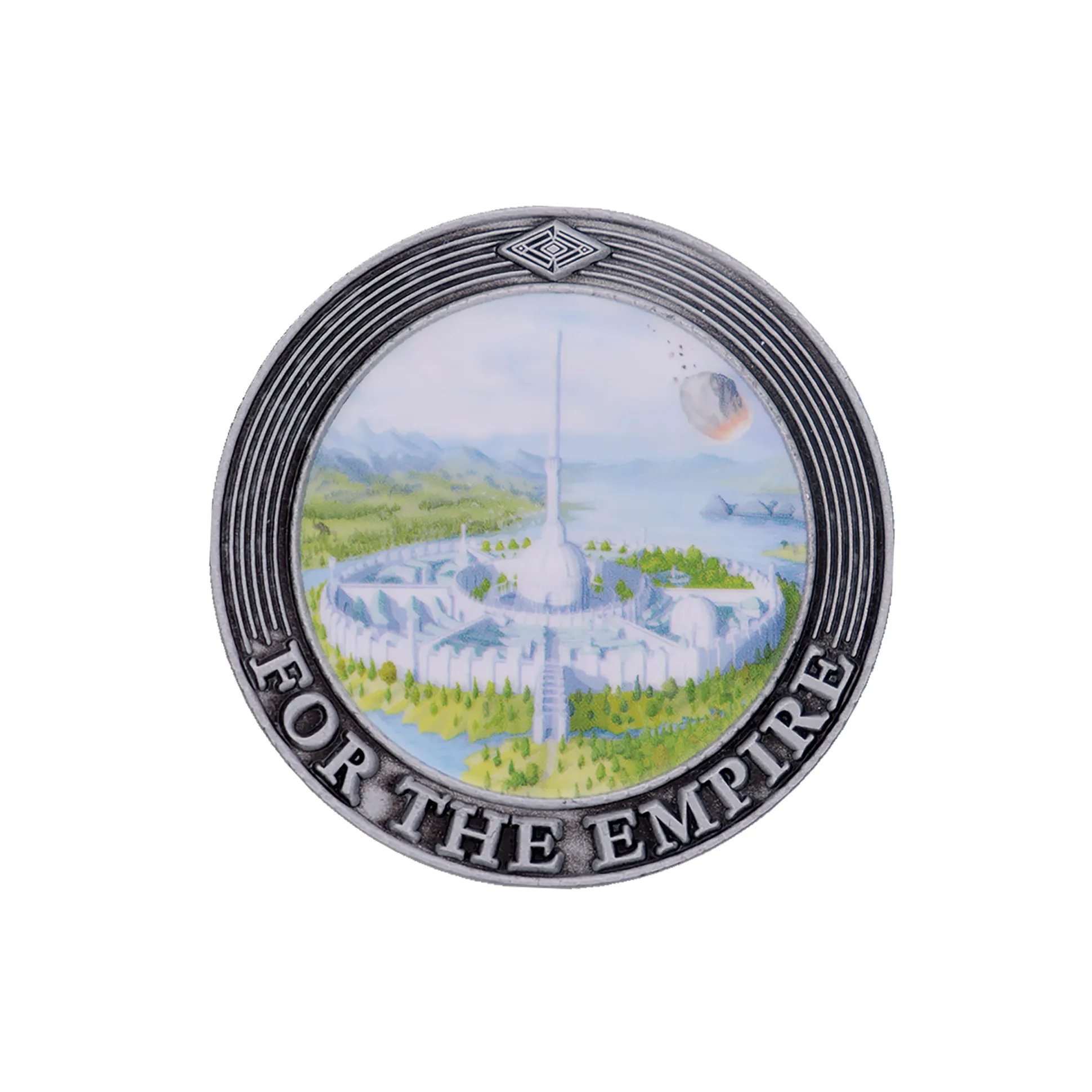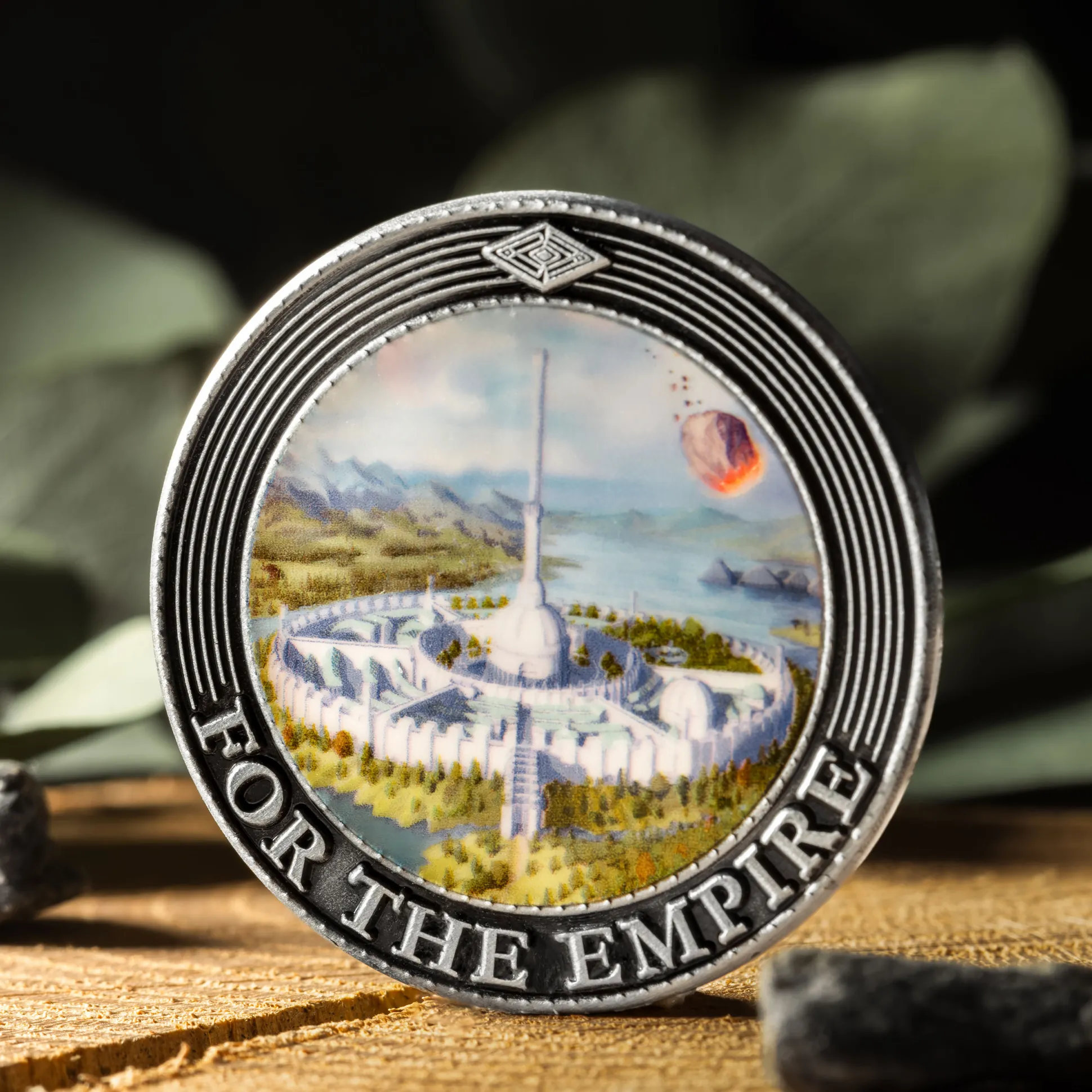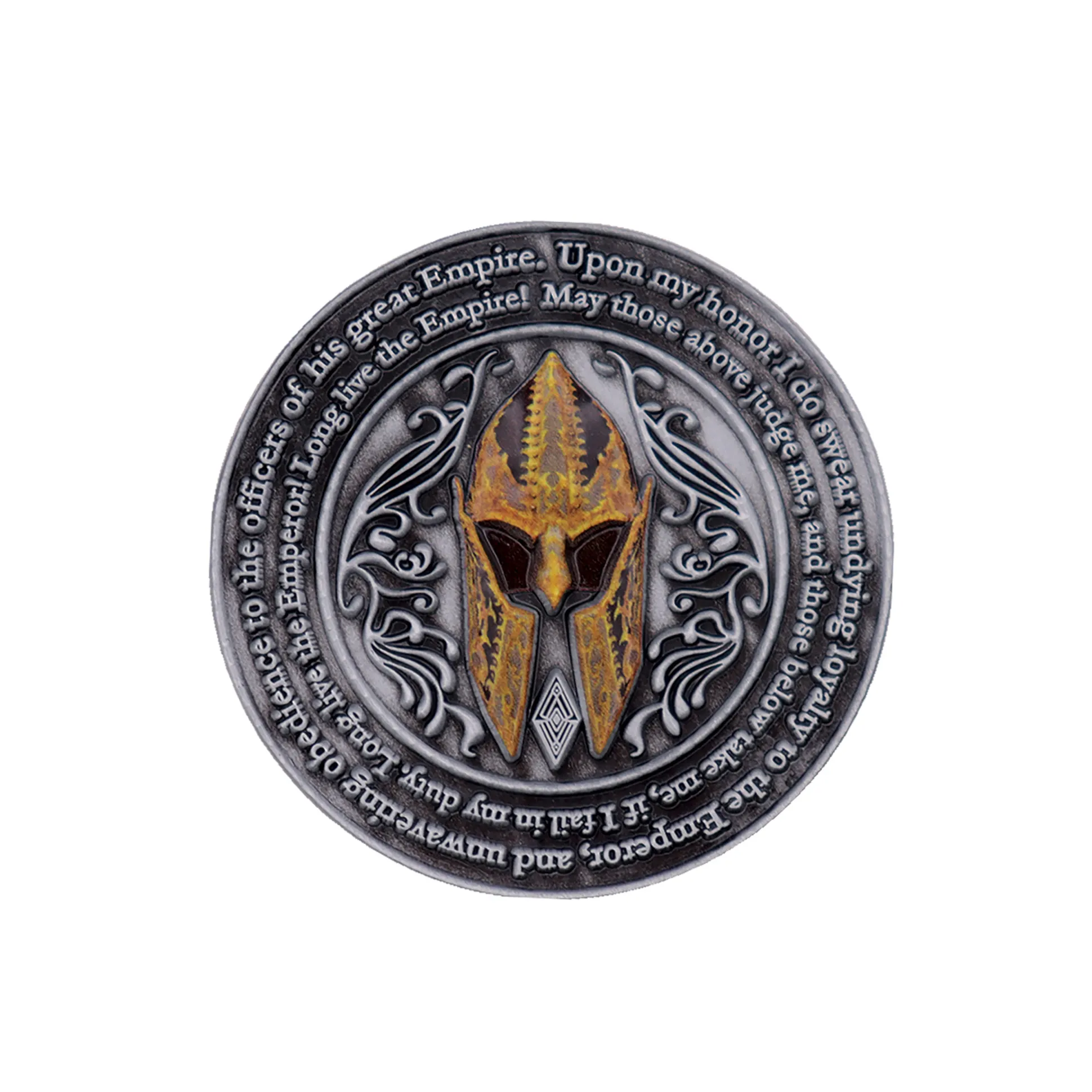 De Keizerlijke Stad altijd bij je? Met deze officieel gelicentieerde verzamelmunt van The Elder Scrolls IV: Oblivion haal je een stukje Cyrodiil zo je inventory in. Dubbelzijdig geslagen: het Keizerlijk Paleis aan de ene kant en een keizerlijke helm aan de andere—details waar elke smid jaloers op is.