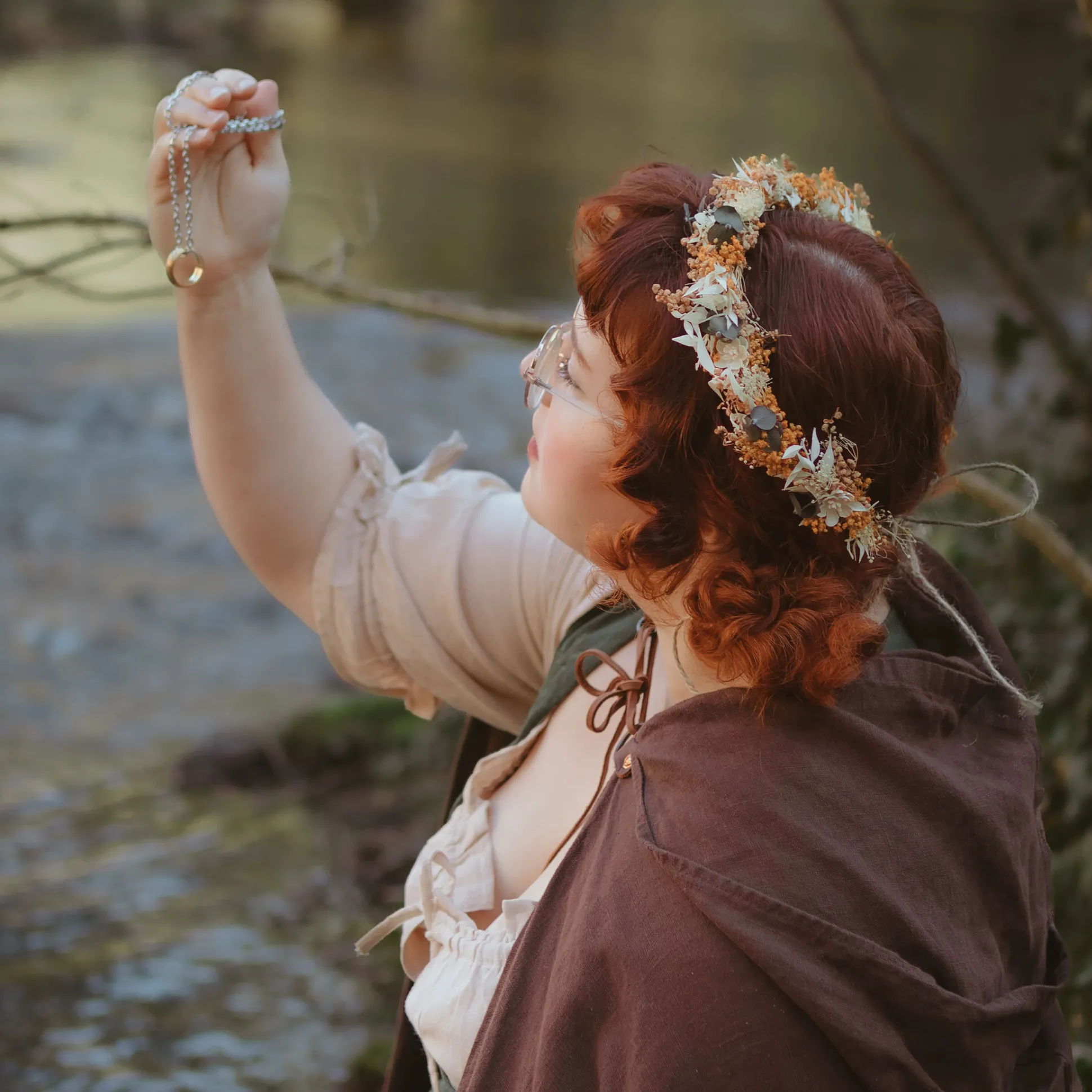 Met deze combinatie kun je de Ene Ring, gemaakt van verguld roestvrij staal, aan een 50 cm lange roestvrijstalen ketting elegant en representatief om je nek dragen.