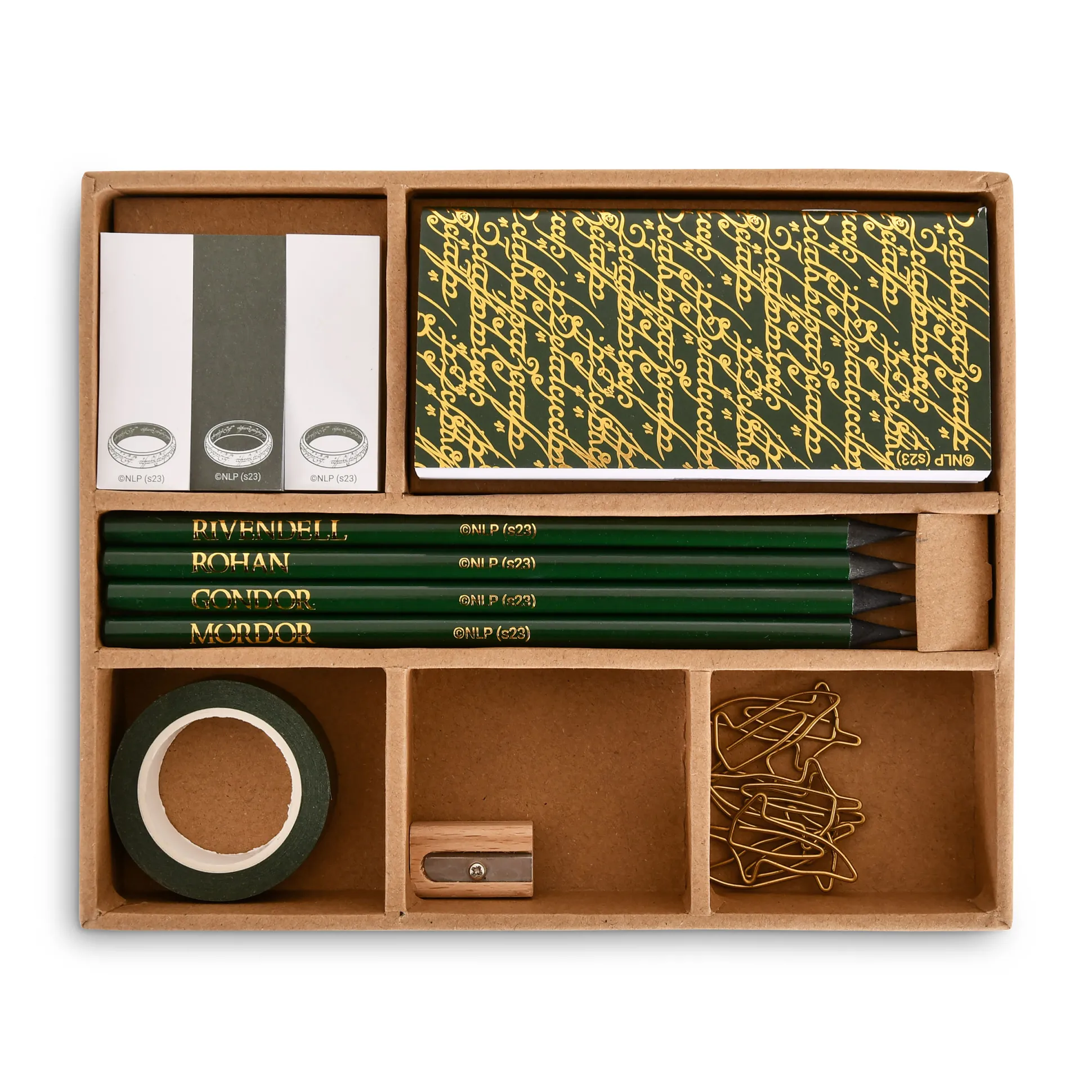 To-do’s, een geheime boodschap voor de Reisgenoten of een boodschappenlijstje uit Mordor — deze officieel gelicentieerde In de Ban van de Ring-schrijfset brengt Midden-aarde naar je bureau. Inhoud: 3 paginamarkeerders en een mini-notitieboekje in De Ene Ring-design; 4 potloden met de namen Rivendel, Rohan, Gondor en Mordor; een puntenslijper, tape en 6 paperclips in de vorm van de Lórien-bladbroche. Compacte afmeting 20 x 16,5 x 3 cm — perfect als cadeau voor fans of voor je volgende queeste door de kantoorjungle.