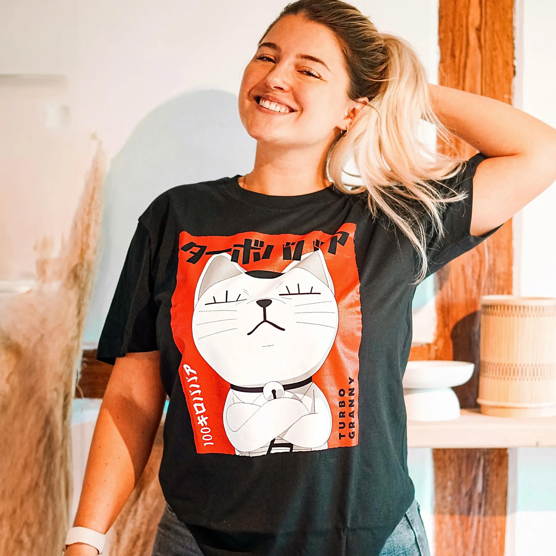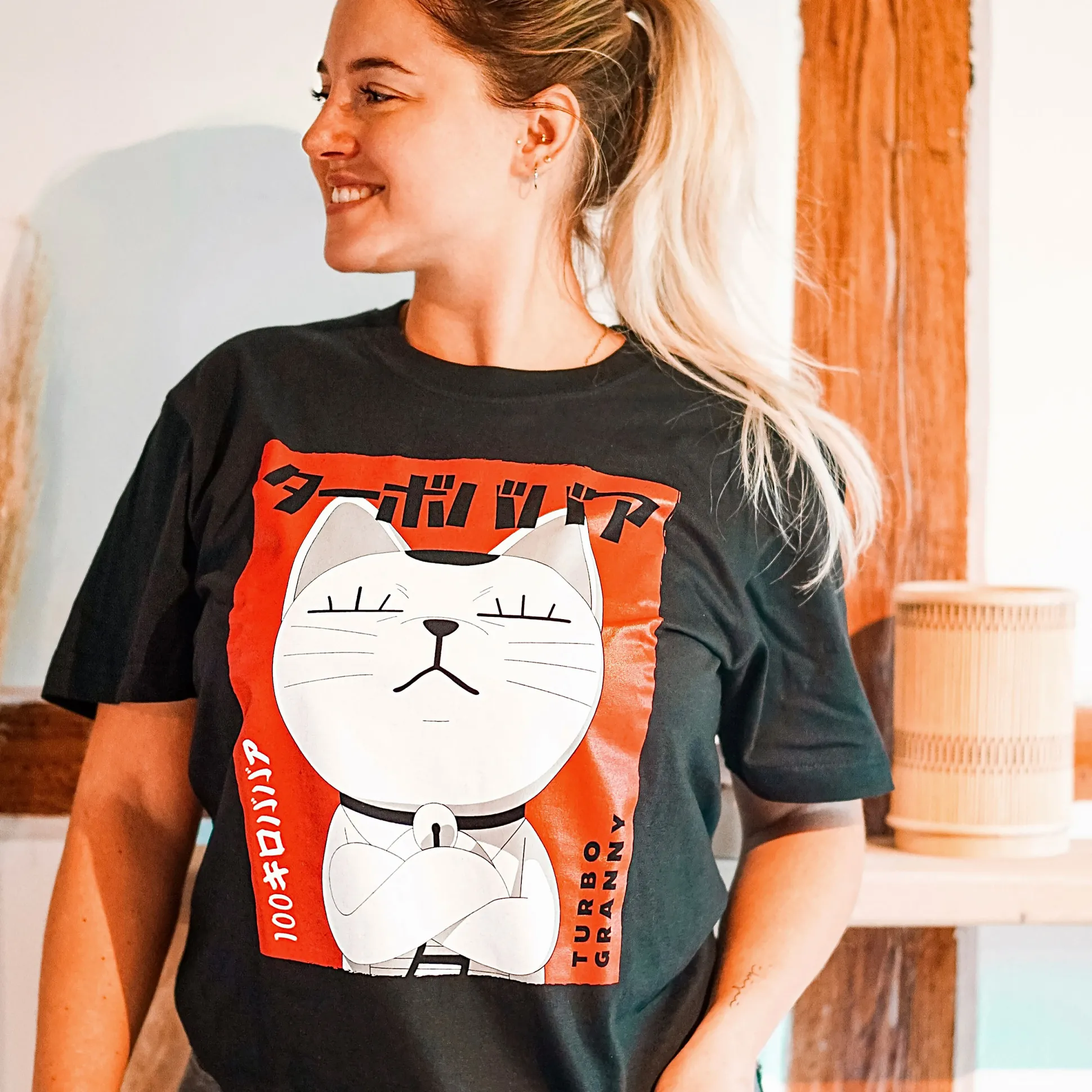 Turbo Granny in je nek? Zet de turbo liever op je borst. Dit Dandadan T‑shirt knalt een poster‑grote Turbo Granny‑frontprint erop – harder dan een yokai op topsnelheid. Rechte pasvorm, comfortabele ronde hals, diepzwart: makkelijk te stylen, moeilijk te negeren. Jouw dagelijkse power‑up voor alienjachten, snackruns en alles daartussen.
