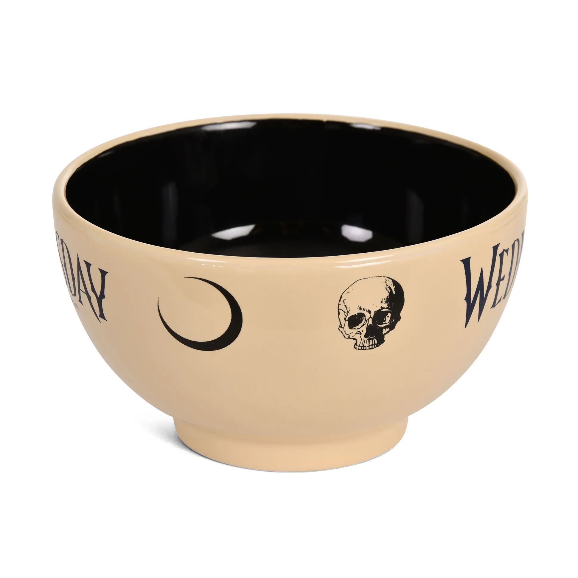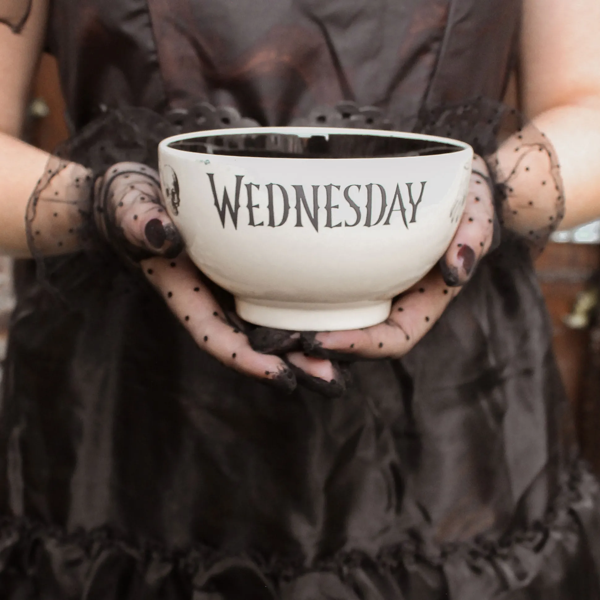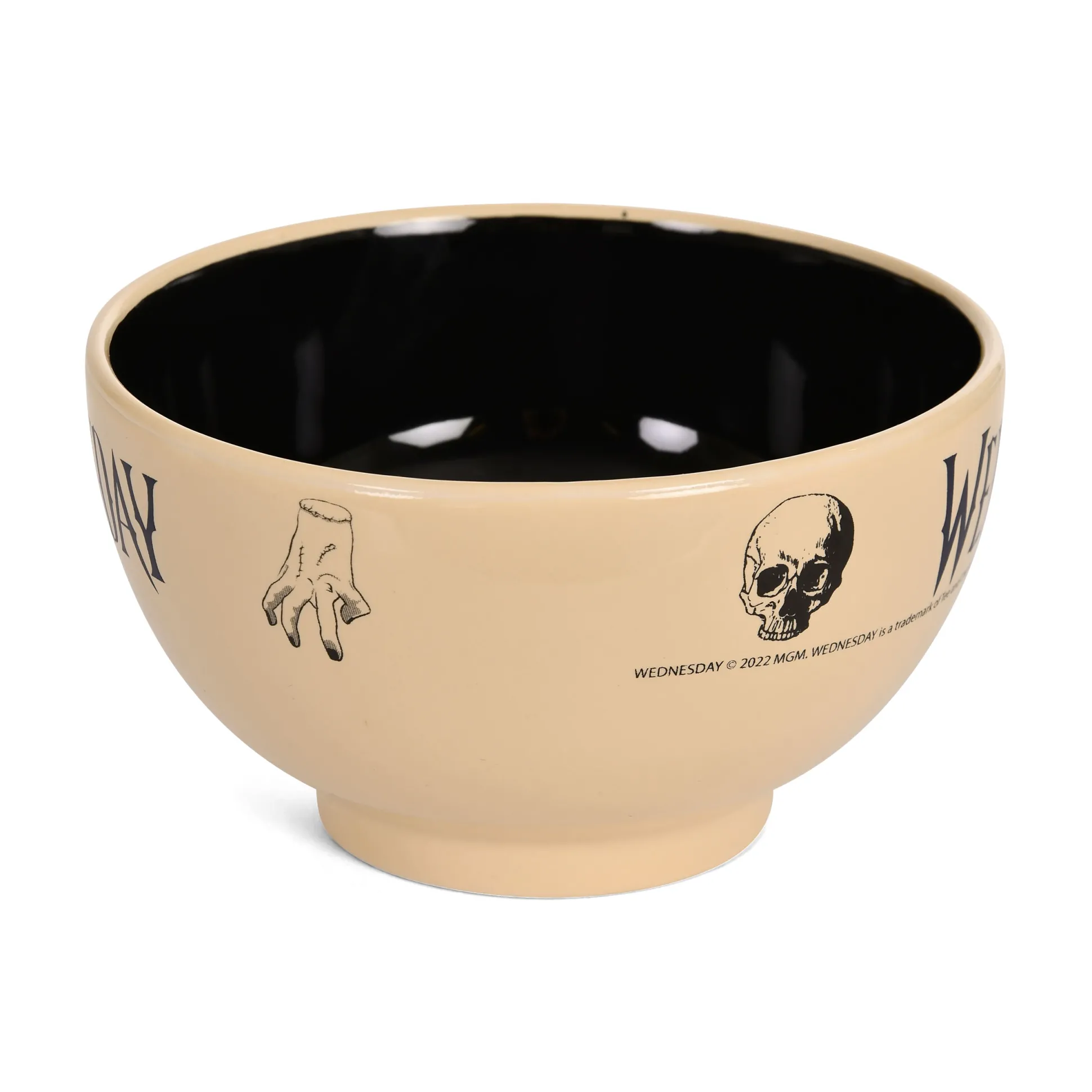 Maak je ontbijt zo heerlijk duister als de humor van Wednesday. Deze officieel gelicentieerde mueslikom is bedrukt met het logo en iconen — schedel, maan en natuurlijk Thing — en serveert bij elke hap een vleugje Nevermore‑vibes.