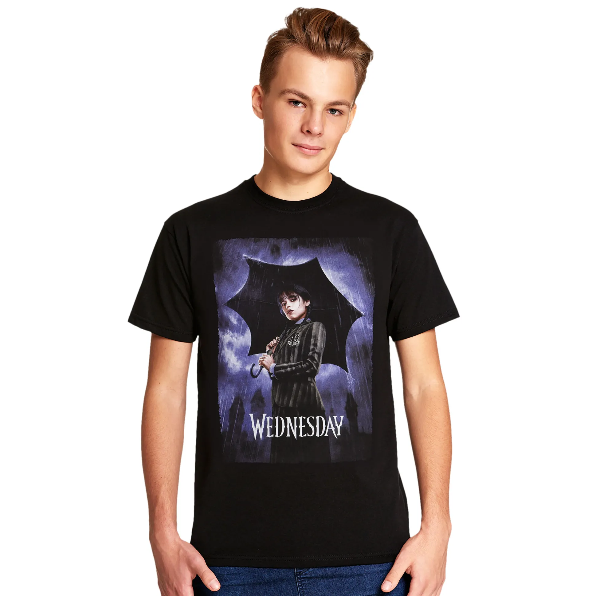Zwart als een raaf en twee keer zo iconisch: dit officieel gelicenseerde Wednesday T-shirt zet de teaserposter recht op je borst. Voorop staat het dramatische artwork met logo; de rechte pasvorm en ronde hals houden het comfortabel voor al je stoïcijnse vibes. Pikzwart, volle attitude — combineer met je pokerface en je bent klaar. Voor binges, cons of gewoon om de gang net wat grimmiger te maken: goedgekeurd door Wednesday (soort van).