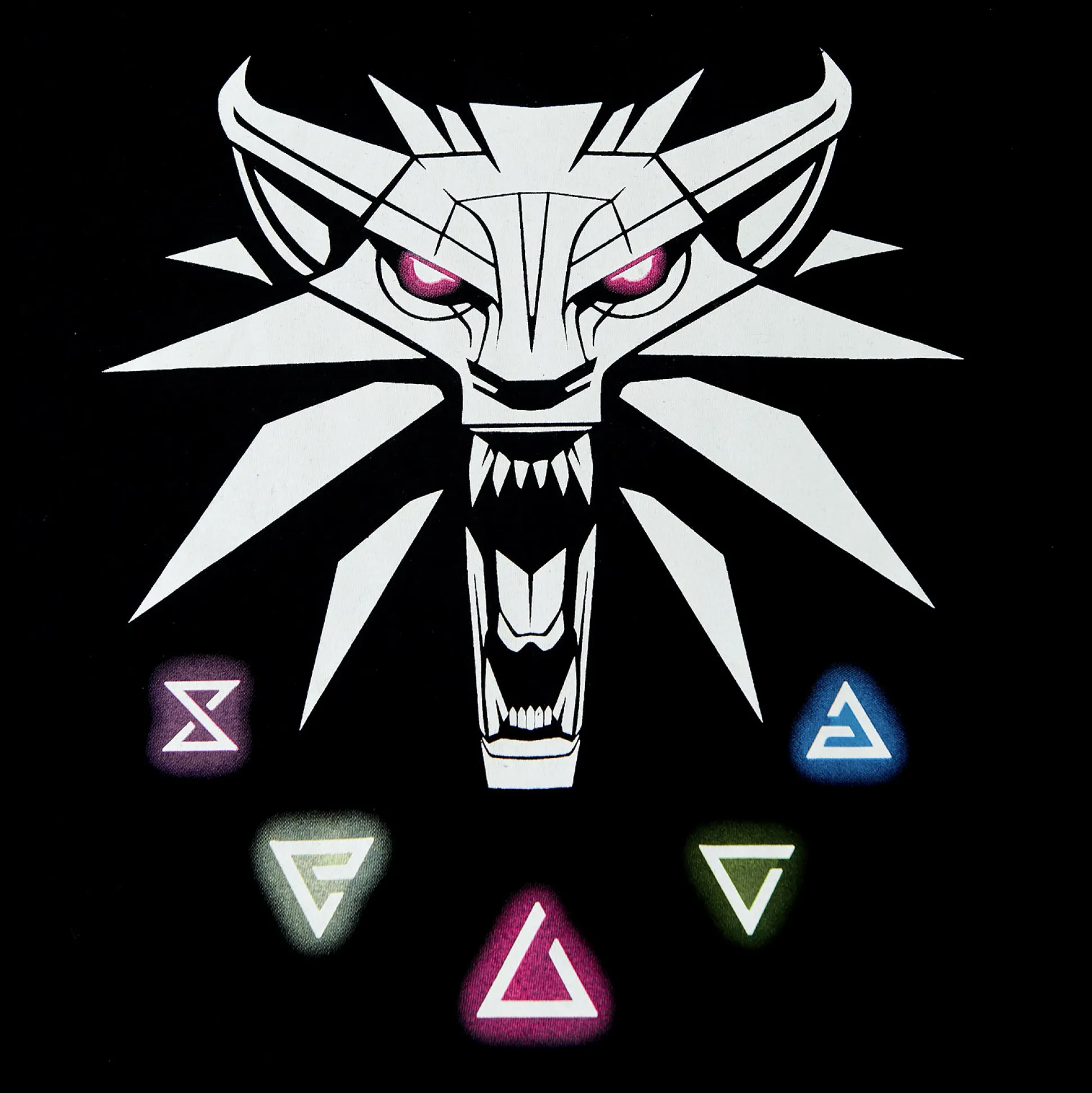 - met wolf medaillon en Hekser tekens Aard, Yrden, Igni, Quen en Axii