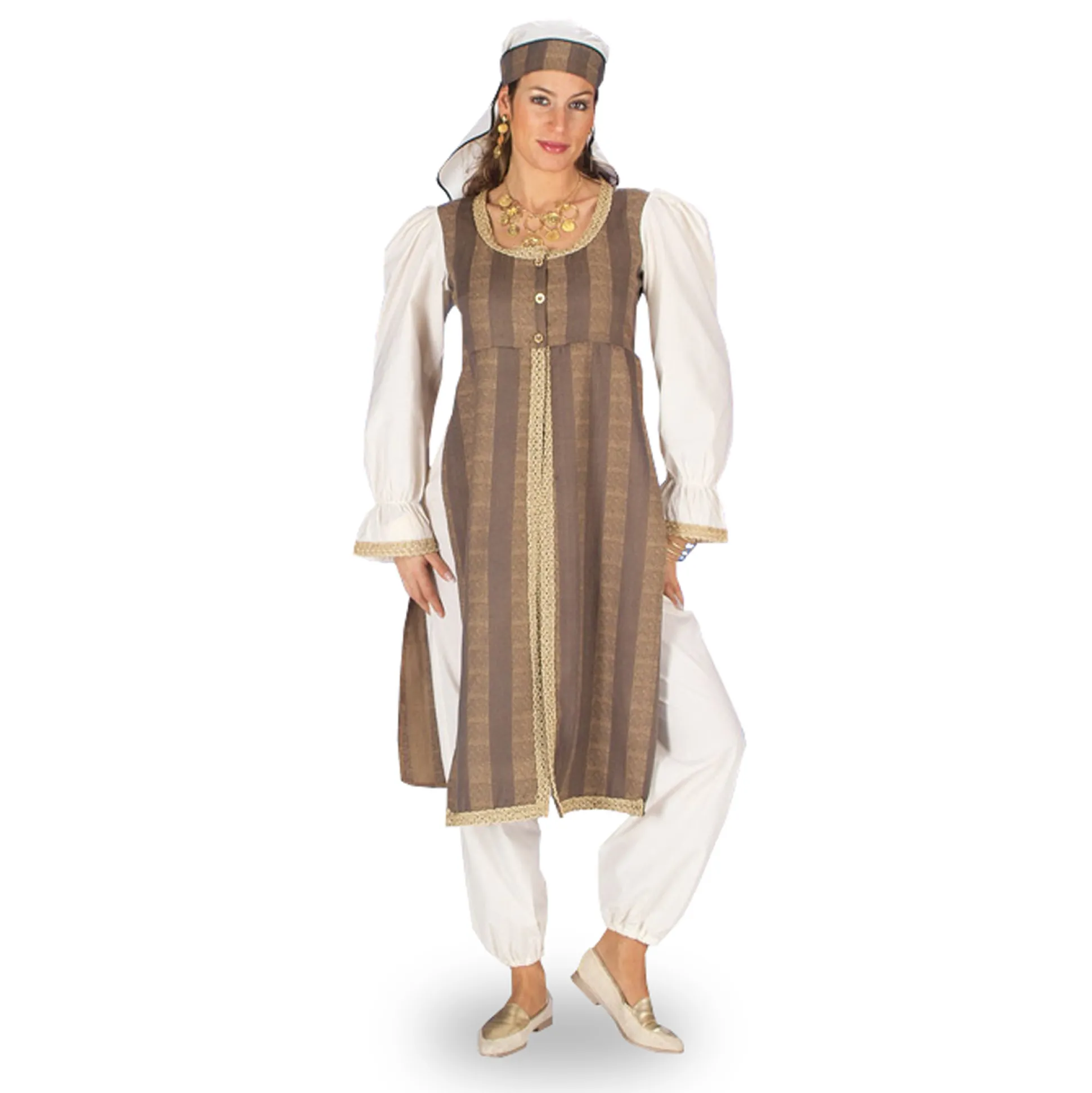 Met dit kostuum ben je perfect gekleed voor elke woestijntrip. Zelfs als de zon fel brandt, kun je afkoelen bij het drankbuffet 😉 Dit hoogwaardige kostuum bestaat uit een lange top, een broek en een hoofdbedekking.
