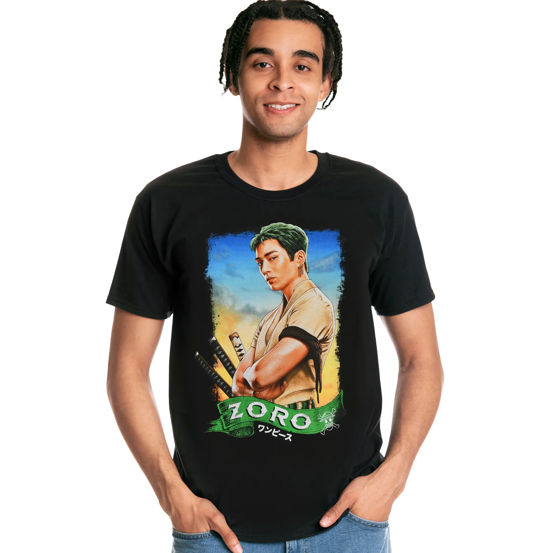 Officieel gelicenseerd T-shirt bij de Netflix-serie One Piece, met een grote Roronoa Zoro-print op de voorkant.