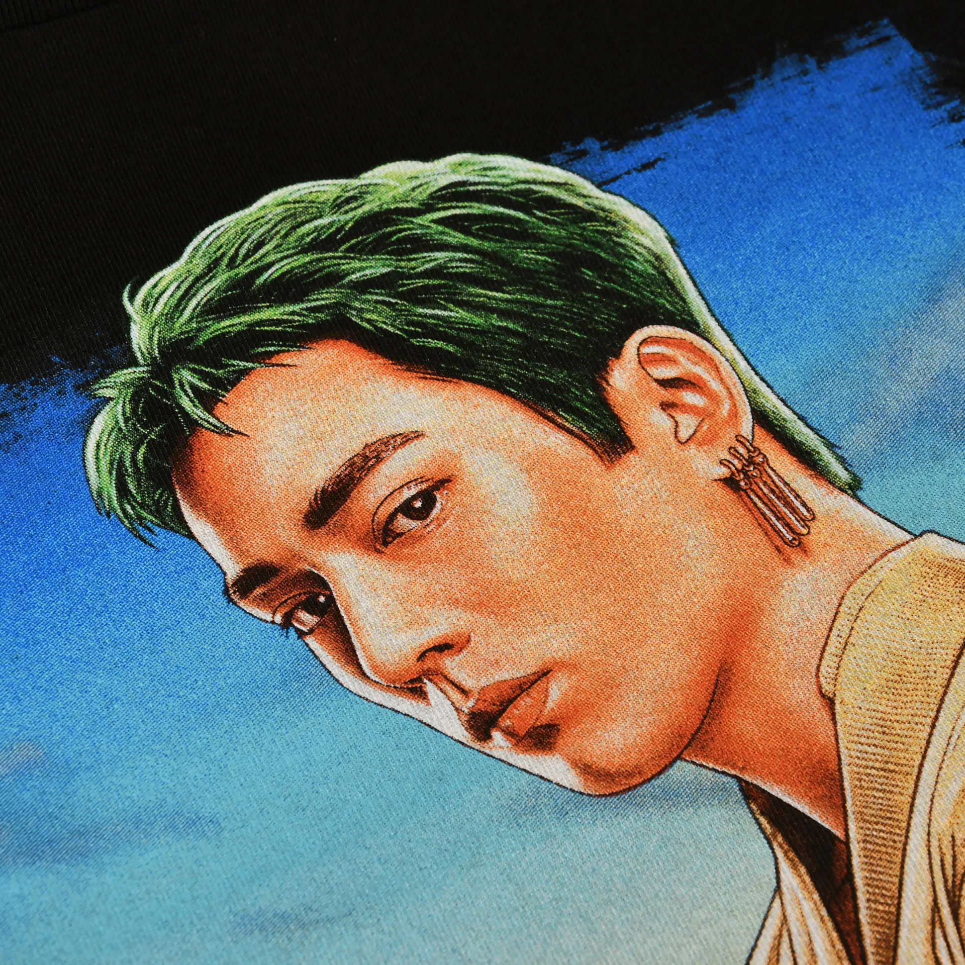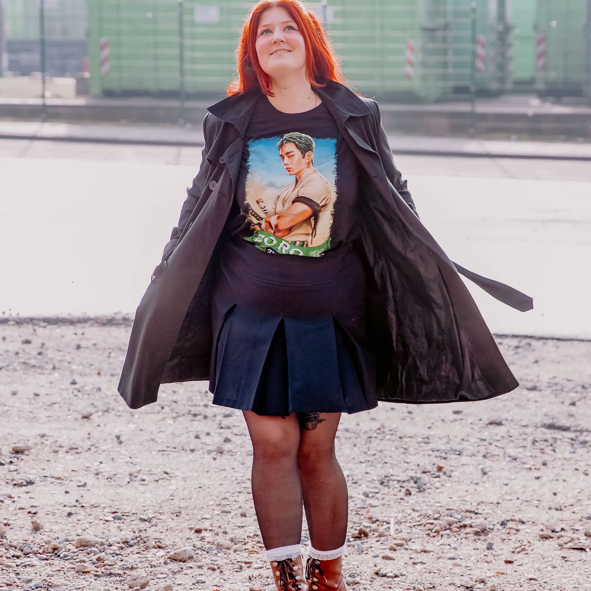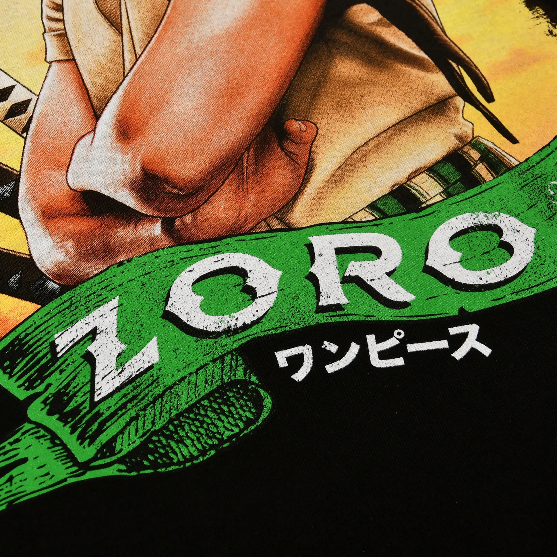 Je hebt geen drie zwaarden nodig om een statement te maken – dit zwarte Zoro T-shirt doet het voor je.