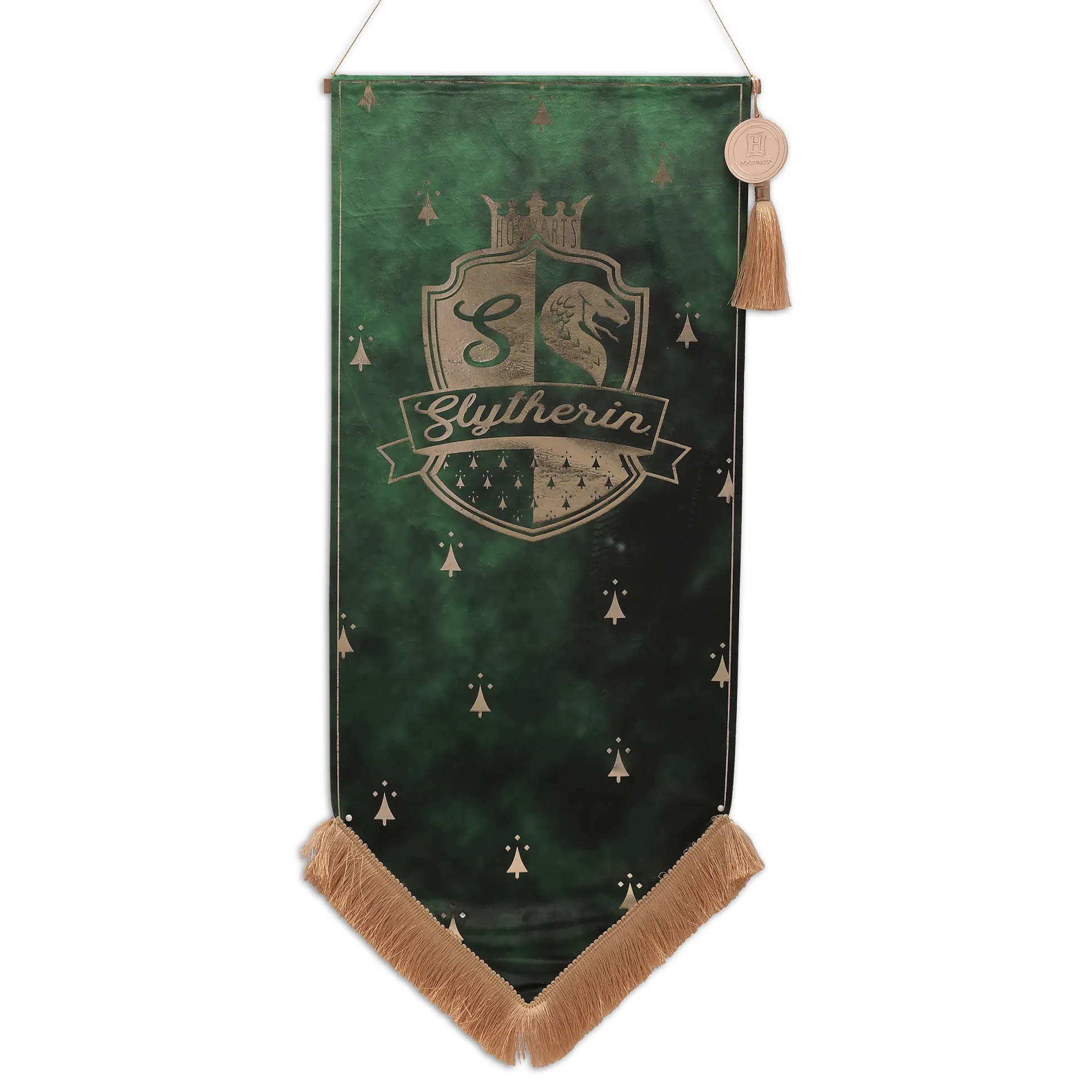 Ben je klaar om je trouw aan Zwadderich te tonen? Met onze officieel gelicentieerde Harry Potter Zwadderich-banner heb je de perfecte kans! Deze luxe, fluwelen banner met het verhoogde Zwadderich-wapen geeft je het gevoel dat je midden in de gangen van Hogwarts bent. Gemonteerd op een stevige houten paal en voorzien van een goudkleurige band om op te hangen, is deze banner een echte blikvanger. Maar dat is nog niet alles! Aan de uiteinden van de paal bevinden zich elegante kwasten en het Zweinstein-embleem, die het ontwerp afronden. Met zijn afmetingen van 24 x 58 cm past het perfect in elke kamer. Dus, waar wacht je nog op? Laat iedereen zien dat je een echte Harry Potter-fan bent en breng een stukje Zweinstein in je huis!