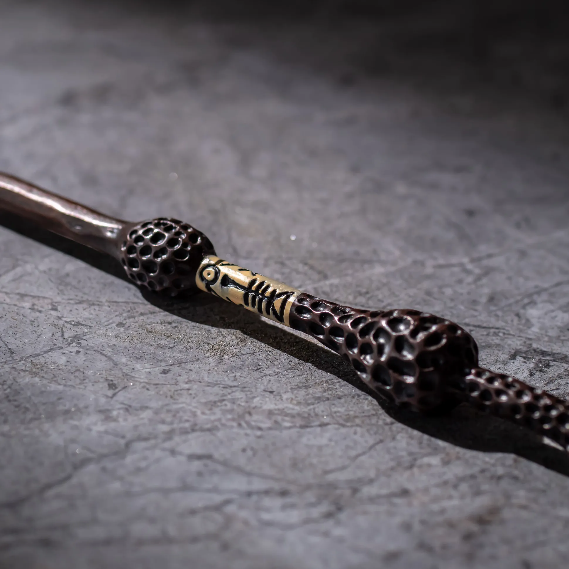 Zoals in de Harry Potter boeken te lezen is, is Perkamentus’ staf de Elder Wand, een Deathly Hallow. Deze toverstok kan alleen echt volledig gebruikt worden door degene die de dood accepteert. In het origineel is hij gemaakt van vlierhout en heeft hij het staarthaar van een thestral in de kern.