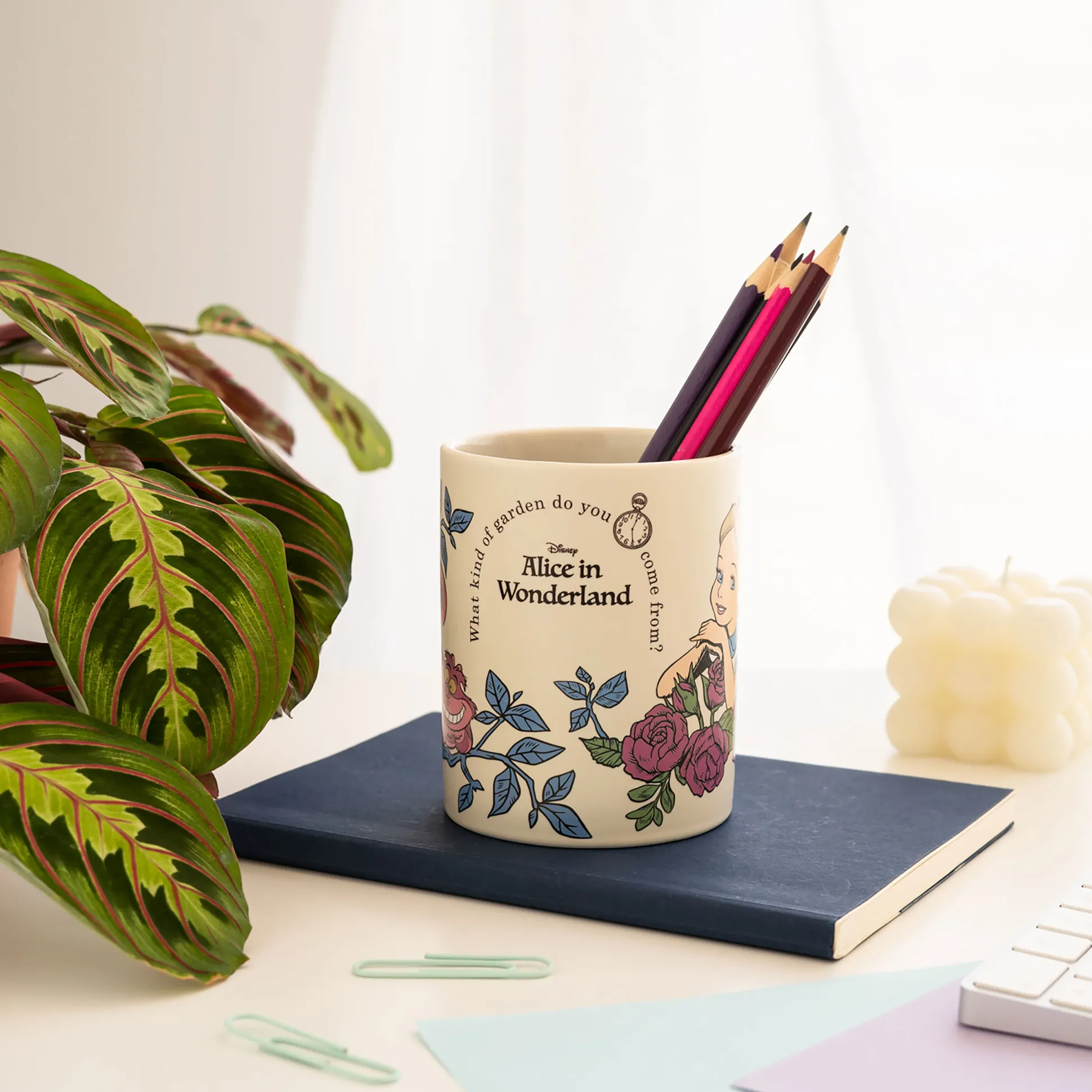 Je bureau heeft een afspraak met Wonderland: de officieel gelicentieerde Disney pennenhouder in Alice in Wonderland Flower-design brengt kleur, fun en orde in je dag. Pennen, markers of kwasten — alles krijgt zijn plek. En als er even geen bureaustrijd woedt, doet hij ook dienst als schattige mini-bloempot (zonder afvoergat, dus je oppervlak blijft droog). Compacte afmetingen van 8,5 x 10,5 x 8,5 cm passen op elke werkplek, nachtkastje of plank. Het ideale cadeau voor iedereen die samen met Alice, de Cheshire Cat & co. door het leven dwaalt — of graag zijn planten hoort groeien. Haal Wonderland-vibes naar je bureau!
