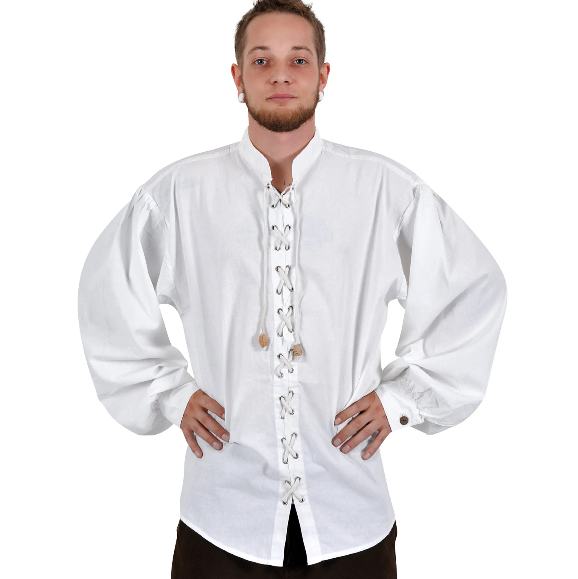 Het hoeft niet altijd de klassieke knoopsluiting te zijn als je voor een overhemd kiest. Veel origineler is de variant met veters, zoals bij dit overhemd, dat zijn middeleeuwse stijl geeft. De blote metalen oogjes schitteren op luchtig wit, dus met dit overhemd maak je de juiste keuze voor de zomer of het volgende middeleeuwse spektakel.