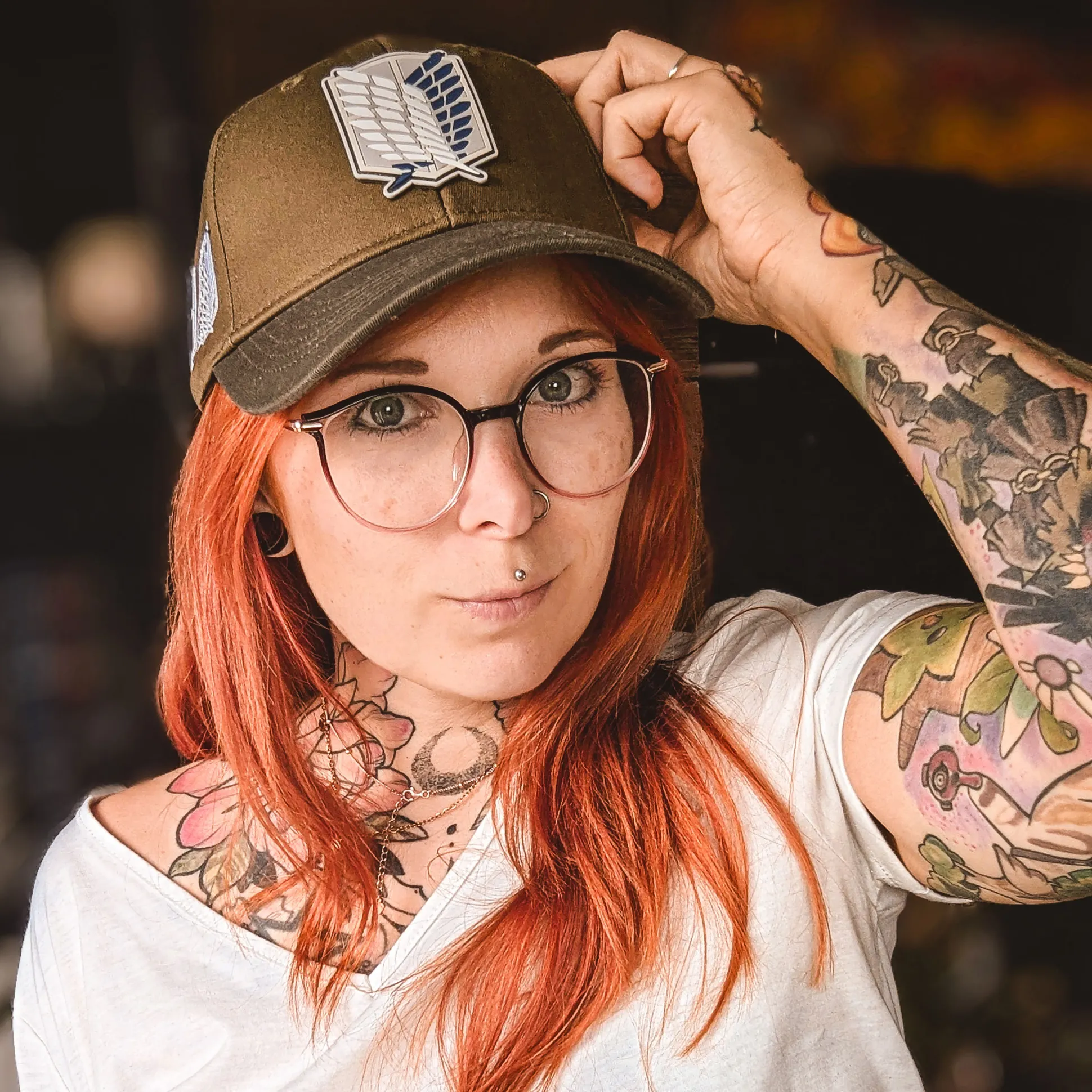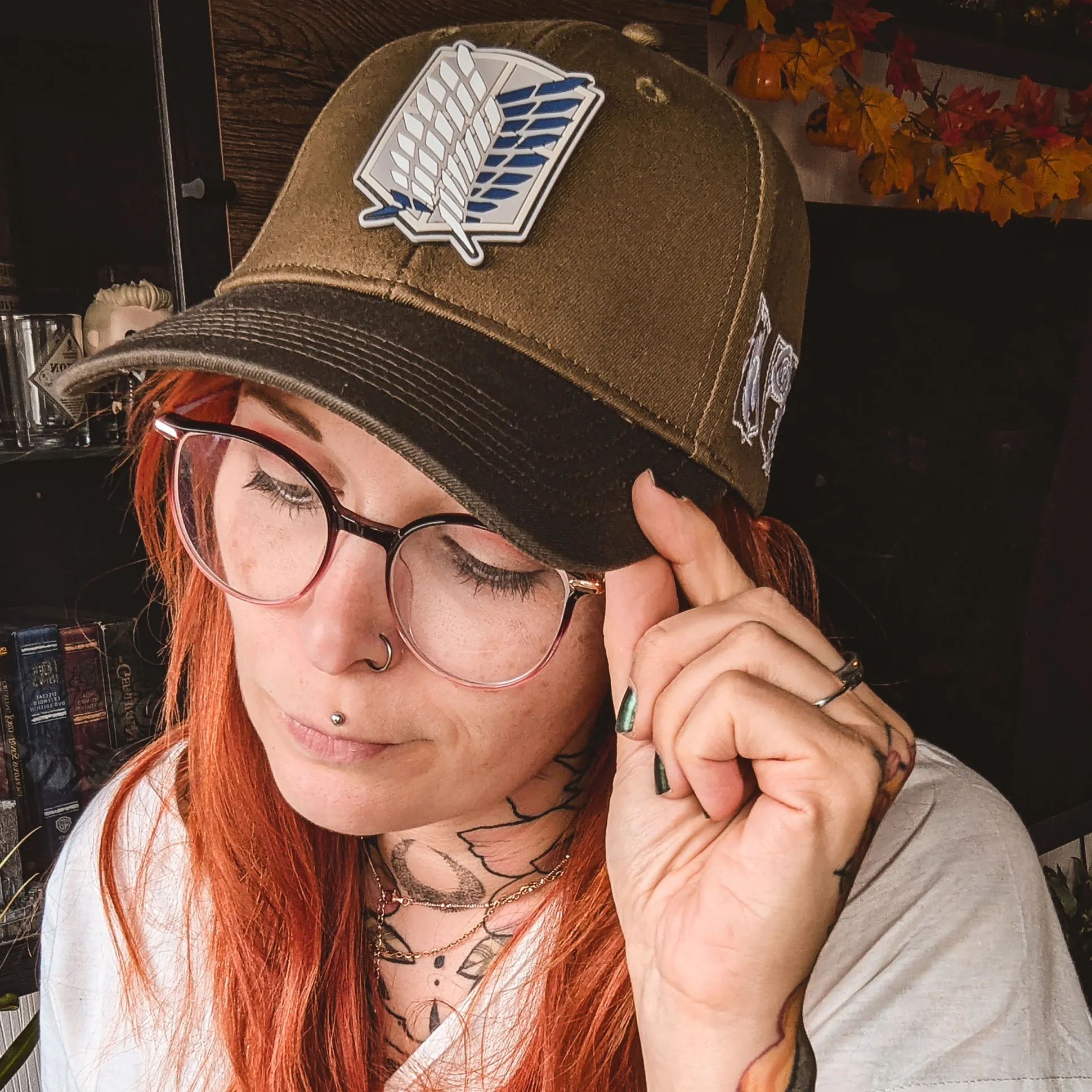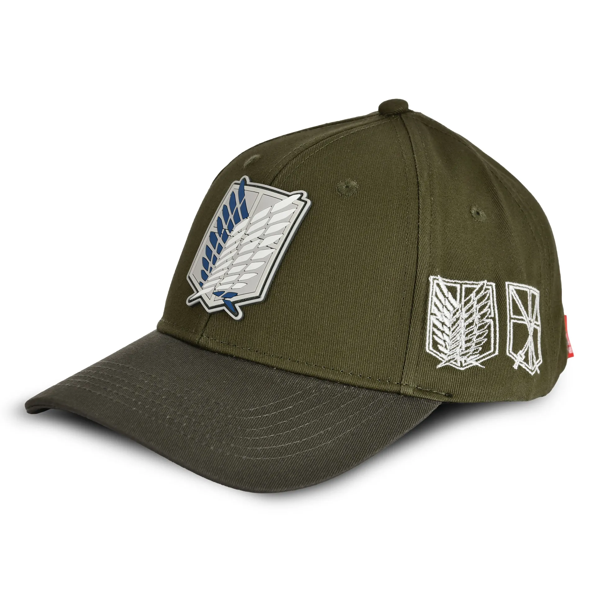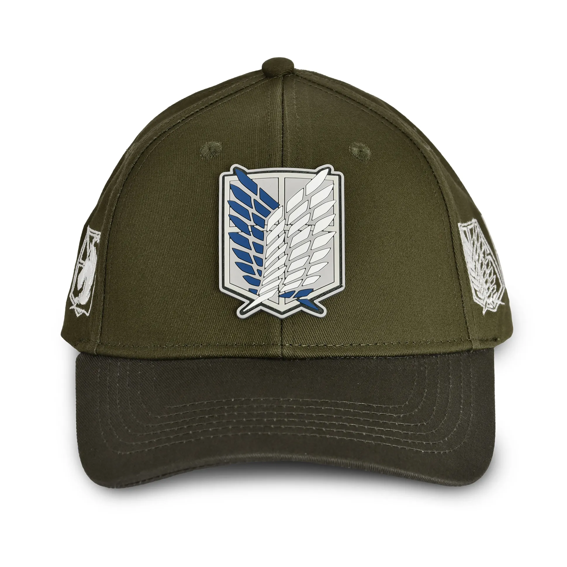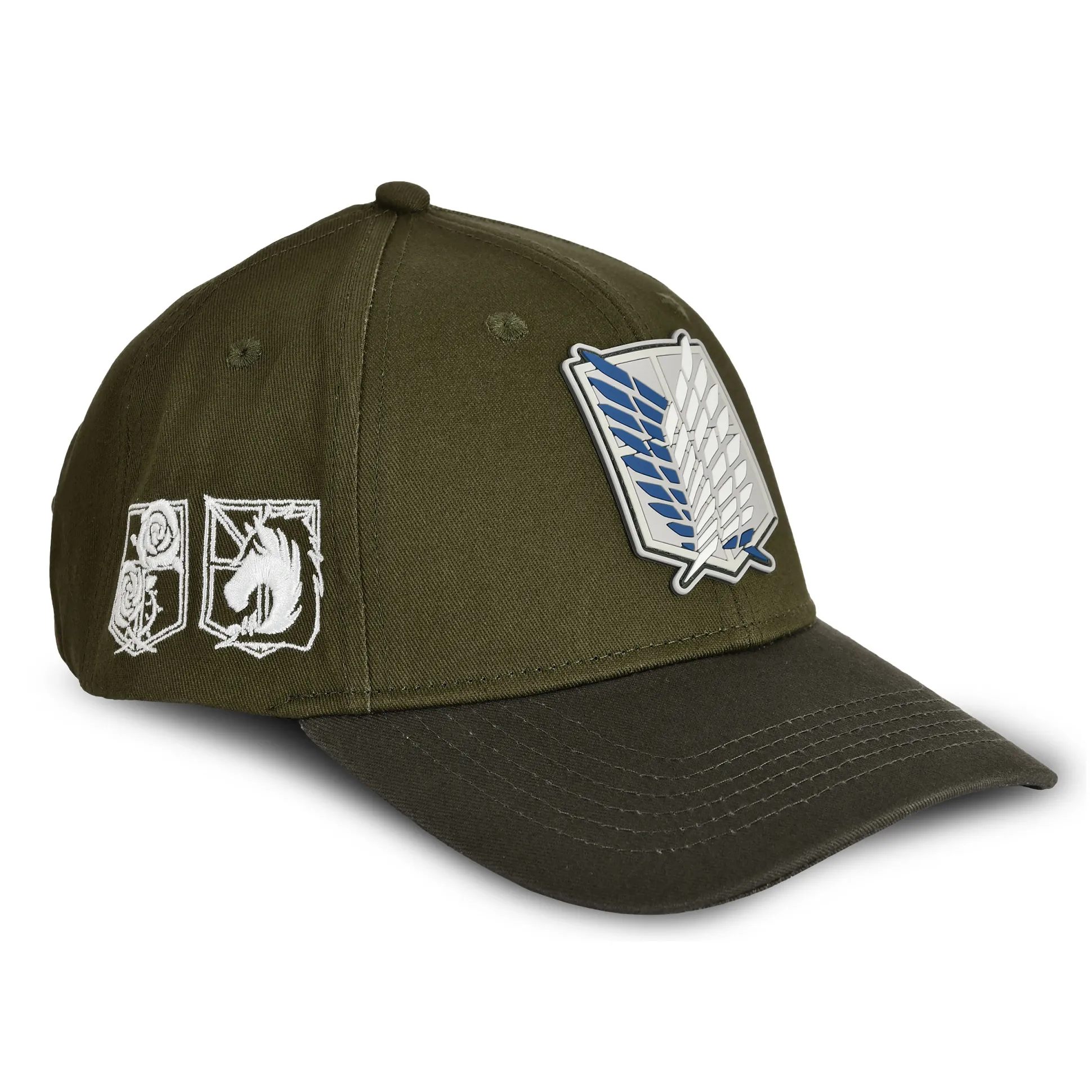 Officieel gelicentieerde Attack on Titan pet in groen – met een siliconen Scout-logo voorop en geborduurde schilden van het Cadet Corps, de Military Police Brigade, het Scout Regiment en het Garrison Regiment.