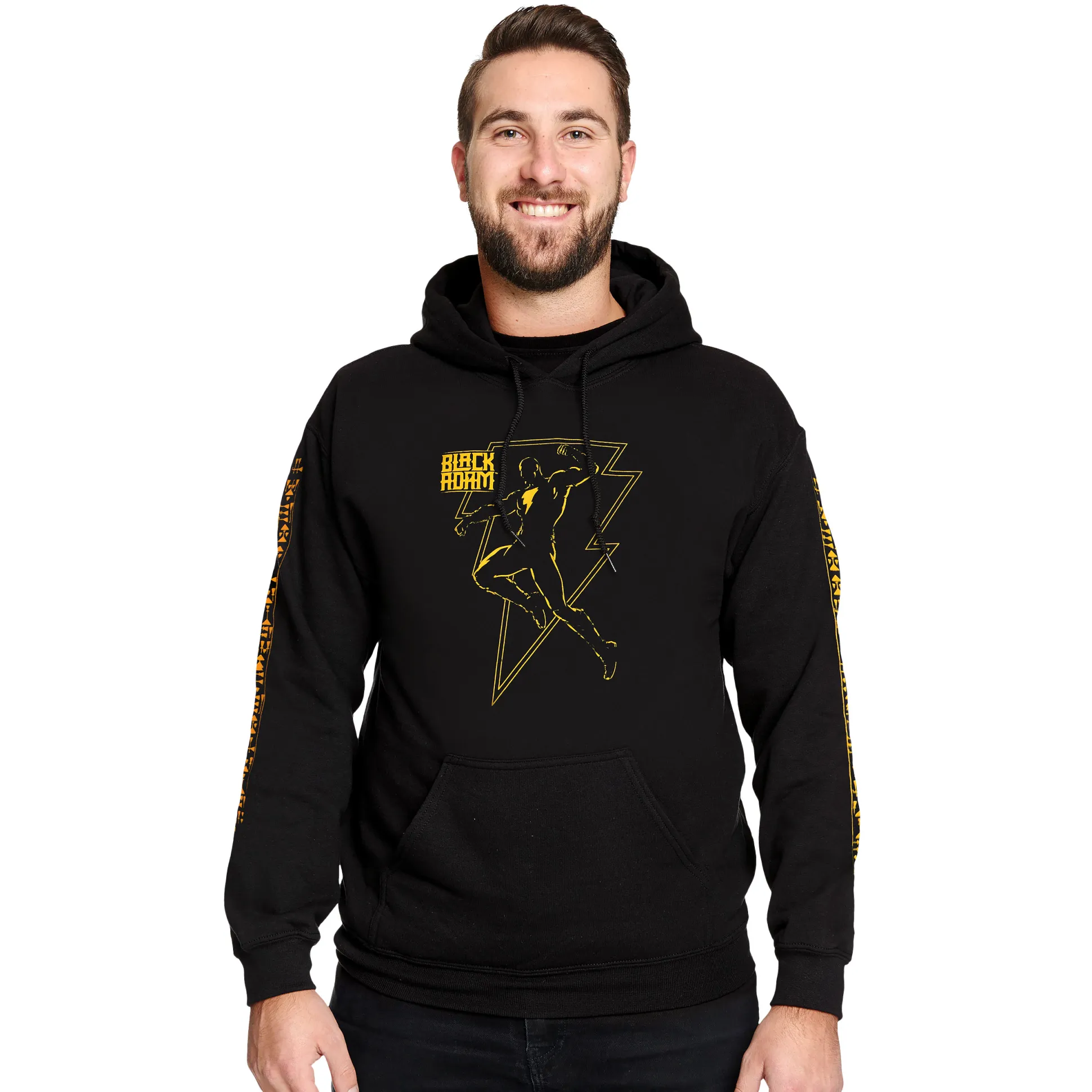 Als de wolken samenpakken, laat jij de donder rollen—comfortabel. Officieel gelicenseerde DC Comics hoodie met groot Black Adam Fight-ontwerp op de voorkant en bedrukte symboolstrepen langs de mouwen. Zacht, warm materiaal met geruwde binnenkant; stevige boorden en een ruime kangoeroezak. Alles in klassiek zwart, want bliksem knalt het hardst tegen een donkere achtergrond. Voor bank, stad of con—Kahndaq-attitude inbegrepen.