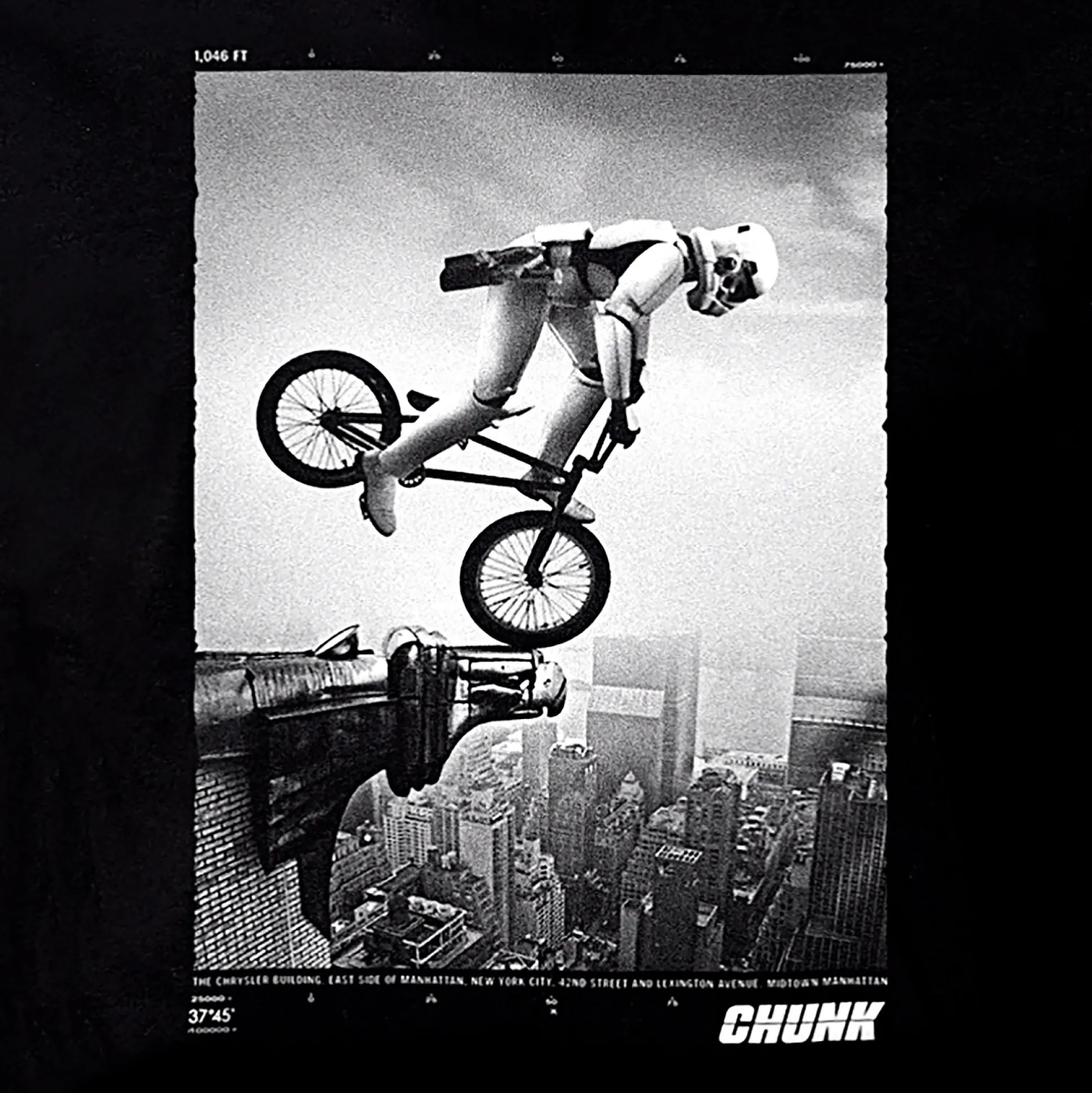Als het Keizerrijk uitklokt, springt de Stormtrooper op zijn BMX – en jij ook. Het BMX Trooper T-shirt van chunk brengt Star Wars-stijl in je dagelijks leven: een zwarte allrounder met grote frontprint, regular fit en comfortabele ronde hals. Hoogwaardige afwerking, zit lekker en afgewerkt met een subtiel chunk-logo. Perfect voor filmavond, de halfpipe of je volgende Kessel Run naar de snackbar. Moge de sprongen met je zijn.