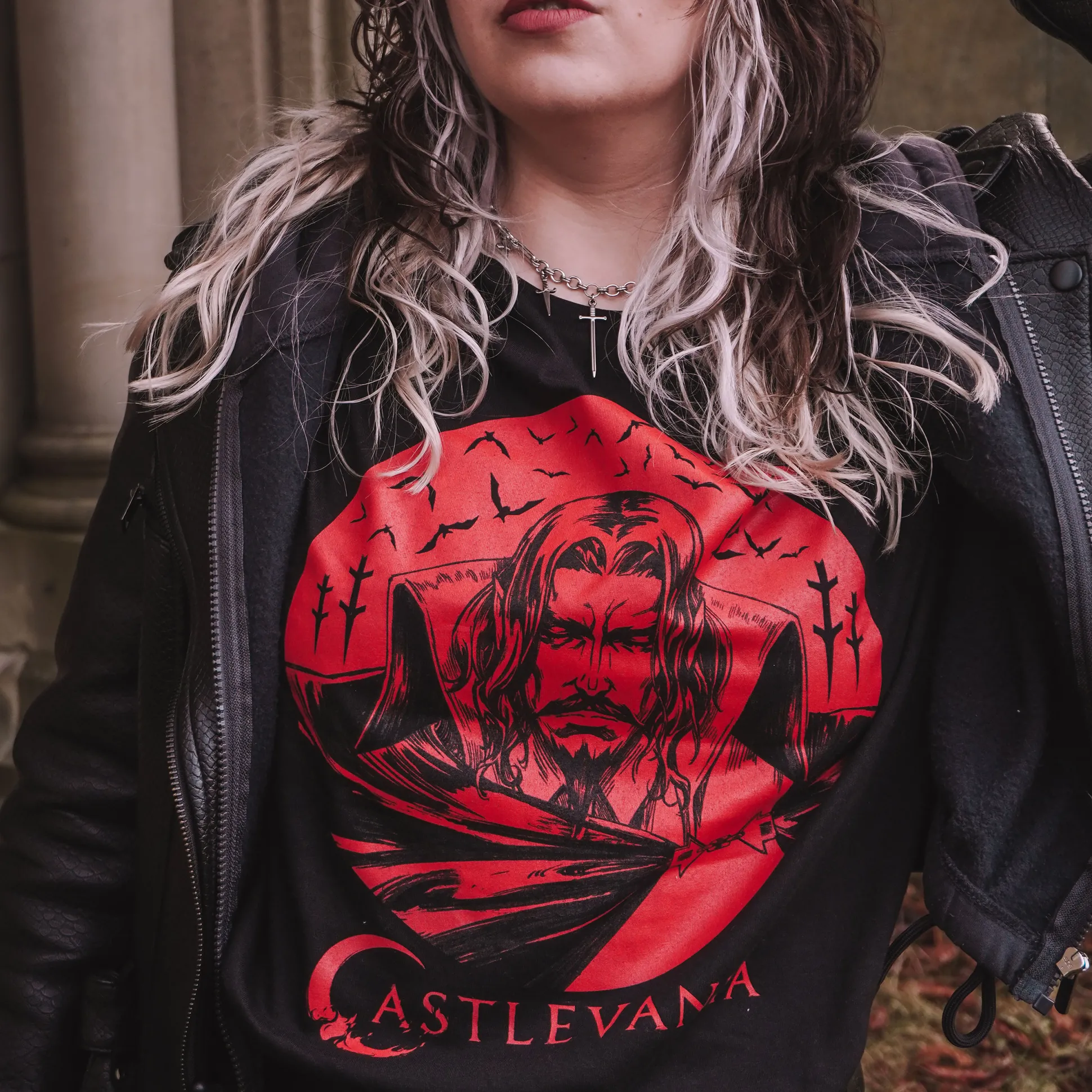 Geen poespas, gewoon pure vampiervibes: zwart, bold design, klaar. Combineer ‘m met jeans, een leren jack of je favoriete jas — cape optioneel. Perfect voor iedereen die van Castlevania houdt, met Dracula meeleeft (of hem jaagt) en de garderobe wil opkrikken met een shot gotische stijl.