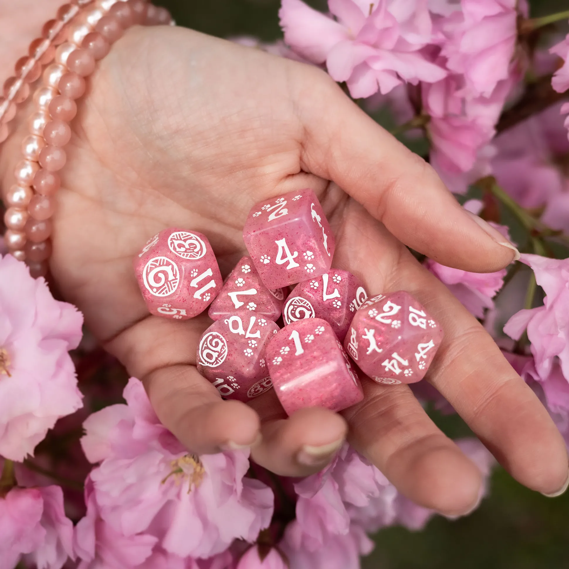 - 7-delig: 1x D4, 1x D6, 1x D8, 2x D10, 1x D12, 1x D20