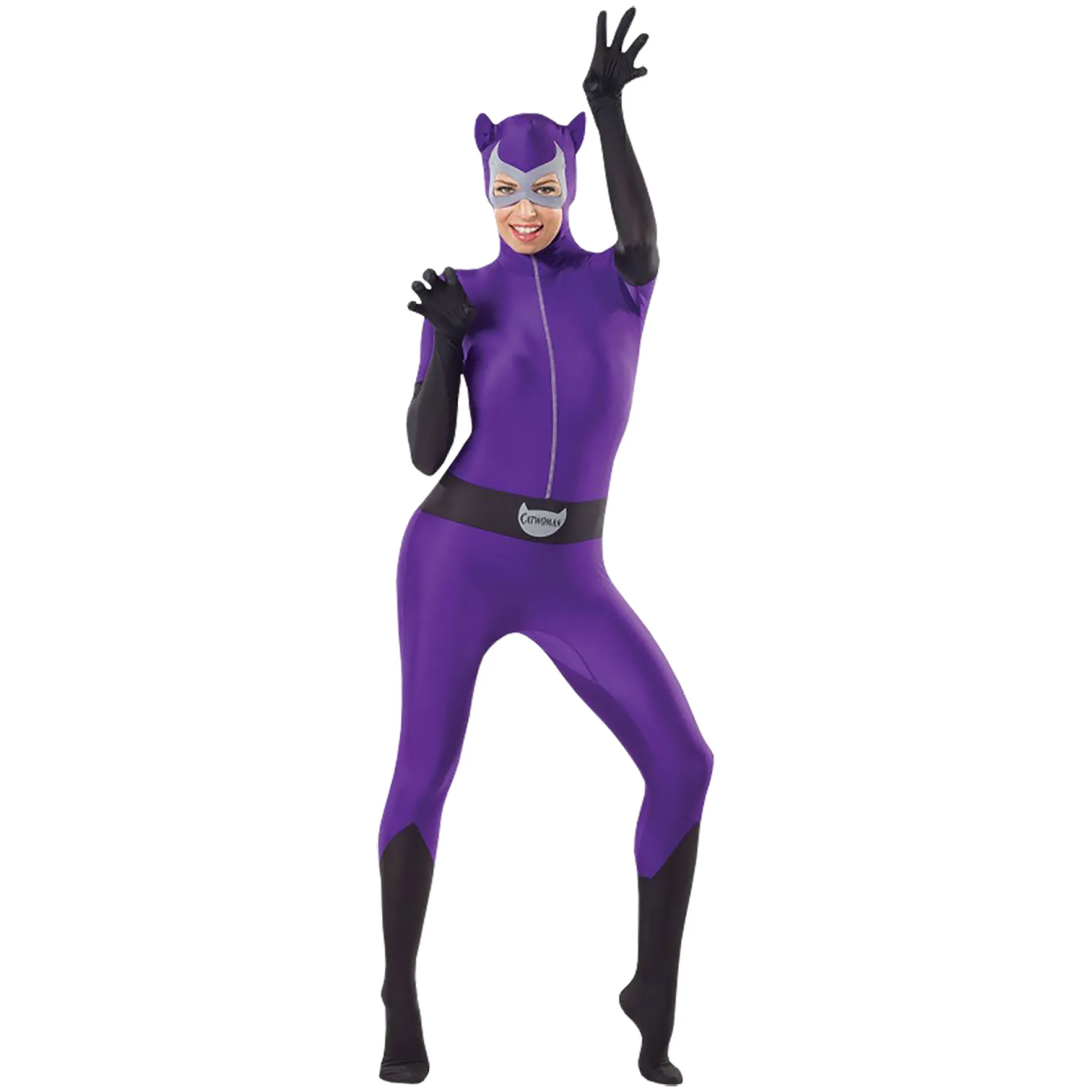 Klaar om door de steegjes van Gotham te sluipen? Met dit officieel gelicentieerde Catwoman Zentai overall steel jij gegarandeerd de show – ja, zelfs van Bruce Wayne! Het strakke, paarse pak vormt zich soepel rondom je lijf, compleet met een capuchon met oogopeningen, een opgedrukte riem met het Catwoman-symbool en zwarte accenten aan armen en benen. Dankzij de lange rits op de rug zit je zo in je rol (en ook weer eruit, mocht dat nodig zijn). Perfect voor een epische cosplay, een superheldenfeestje of om gewoon in stijl de nacht in te gaan. Miauw! Officiële DC merch – grijp ‘m voordat Batman ‘m opmerkt.