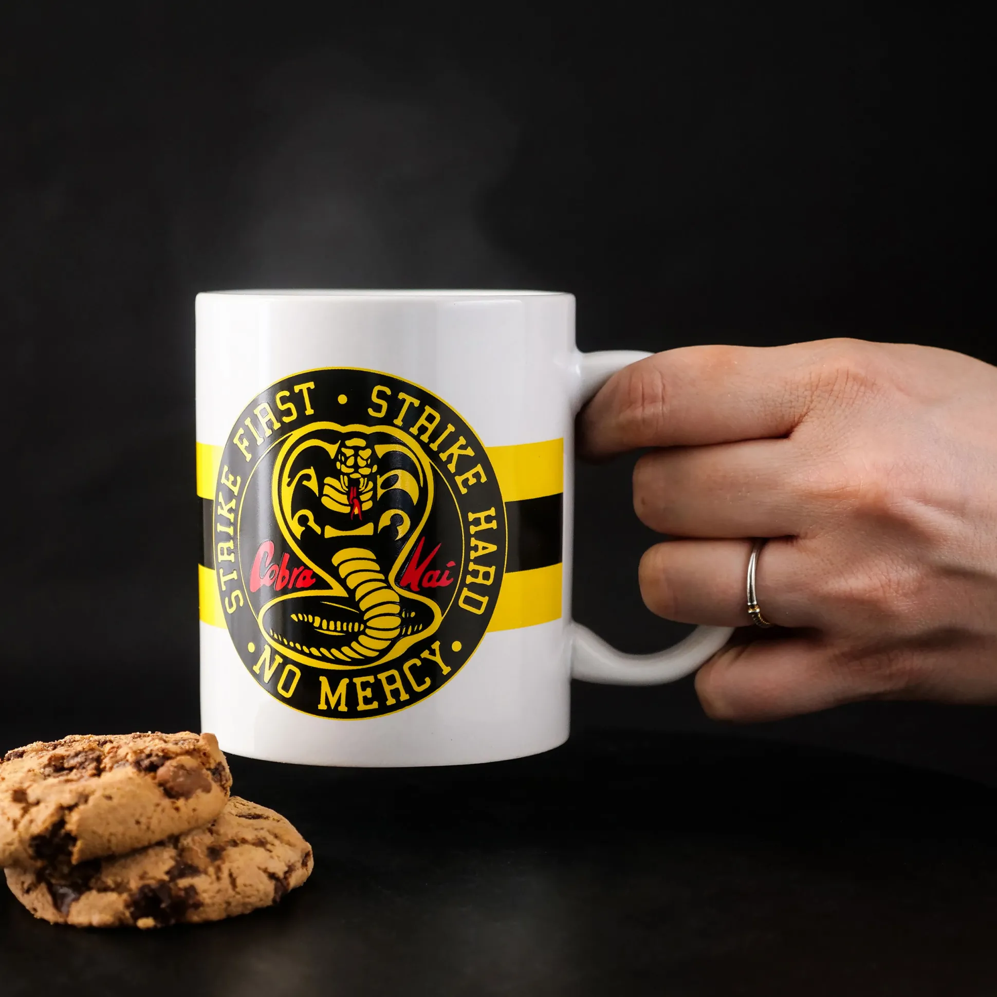 Begin je dag op de Cobra Kai‑manier: Strike First. Strike Hard. No Mercy — voor ochtendmoeheid. Deze witte mok is officieel gelicentieerd en heeft aan beide kanten het logo van de serie Cobra Kai, zodat je dojo‑spirit vanuit elke hoek te zien is. Met een inhoud van 320 ml is hij klaar voor koffie, thee of wat jouw training ook voedt. Vaatwasser‑ en magnetronbestendig, want zelfs door de sensei goedgekeurde mokken mogen handig zijn. Een knaller van een cadeau voor fans en de ultieme desk‑flex voor iedereen die volgens het motto leeft: No Mercy.