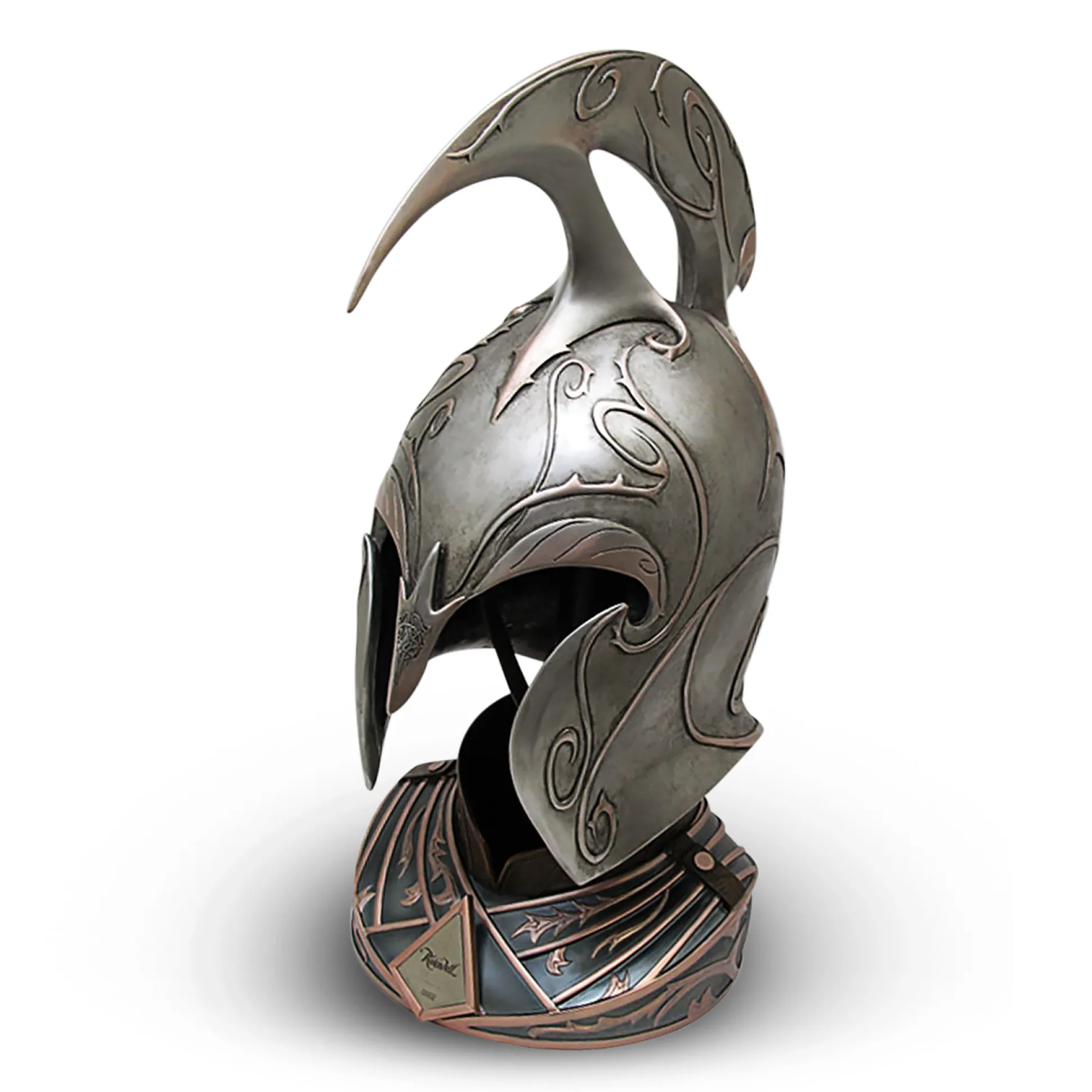 Ooit gewenst dat een elvensmid in Rivendel je toeknikt en zwijgend een helm naar je schuift? Dit is dat moment. Onze 1:1-replica van een elfenhelm uit Rivendel haalt een stukje Midden-aarde zo je plank op. Officieel gelicentieerde In de Ban van de Ring-replica — en ook perfect voor fans van De Hobbit. Het oppervlak heeft een verweerde, intaglio-geëtste structuur met een zwartgeblakerde staallook, alsof het al een paar Tijdperken heeft meegemaakt.