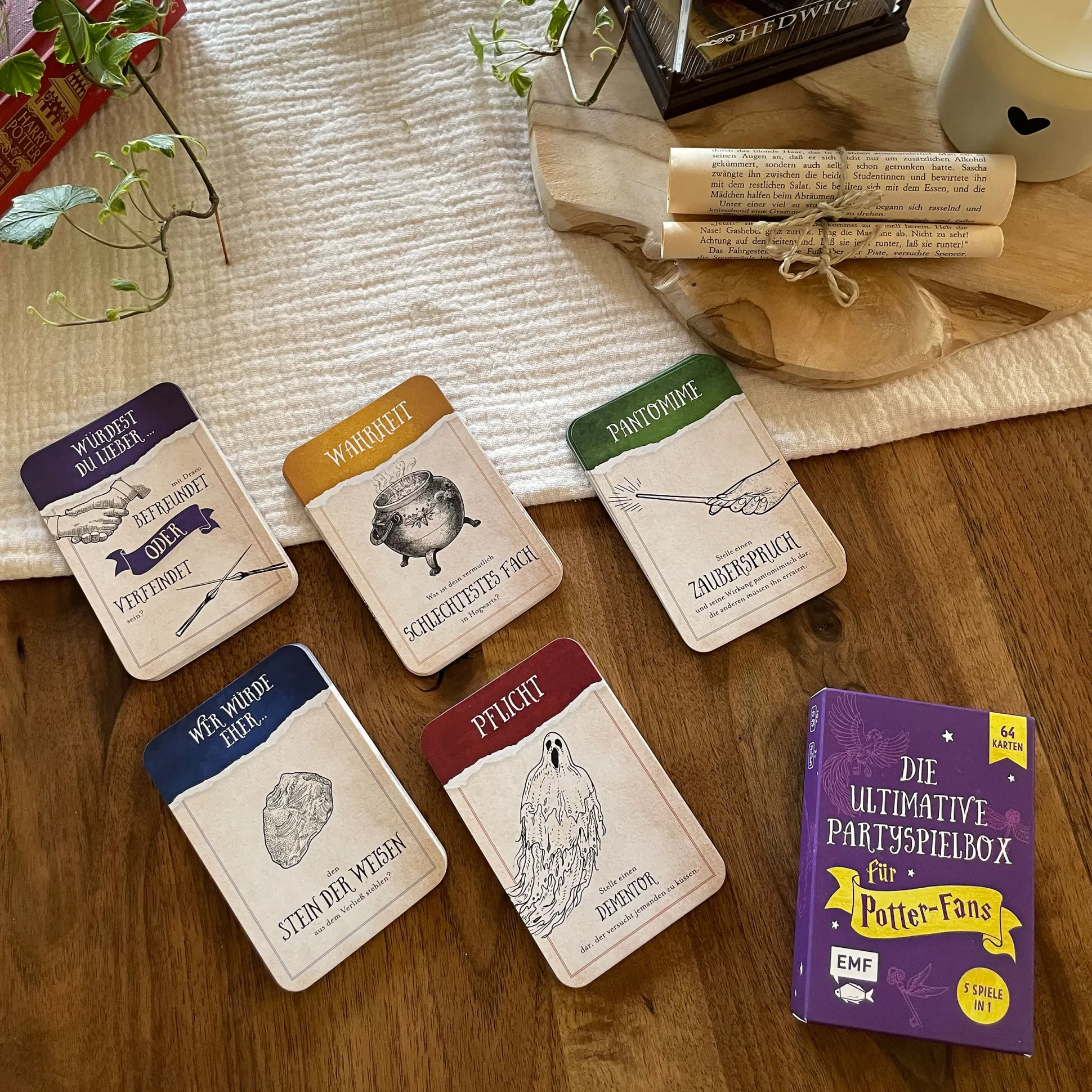 Accio party vibes! Deze ultieme partybox voor Harry Potter-fans bundelt vijf klassiekers: Waarheid, Durven, Charades (uitbeelden), Wie zou het eerder doen? en Zou je liever…? Meer dan 60 kaarten vol uitdagingen, vragen en lachbuien op Zweinstein-niveau — van “Bedenk een nieuwe toverspreuk” tot “In welk huis zit je en waarom?”. Perfect voor verjaardagen, filmmarathons of een Boterbier-avond met je crew. Duitstalige editie; aanbevolen vanaf 10 jaar. Toverstokken optioneel, teamspirit verplicht.