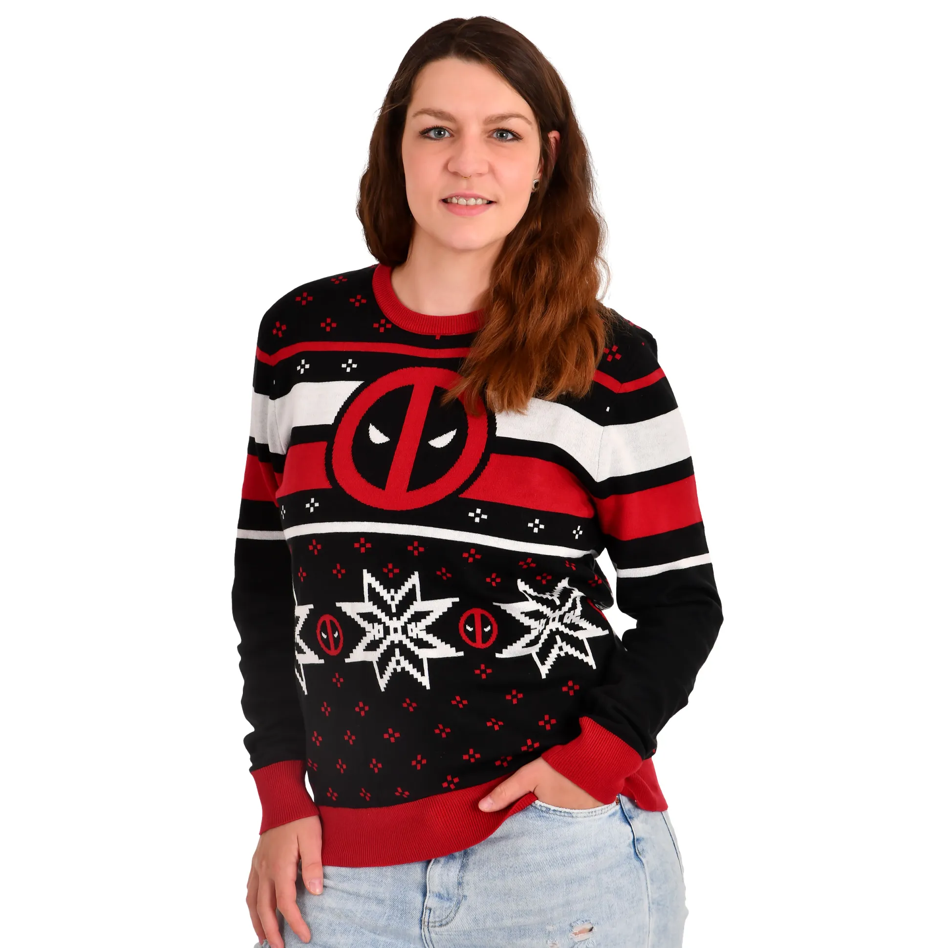 Voorop staat een groot Deadpool-logo; achterop het Deadpool-woordmerk plus de iconische quote “Merc With A Mouth”—zodat ook iedereen achter je het weet. Een rondomlopend Noors patroon in zwart en rood geeft feestelijke vibes met pure Wade-Wilson-energie.