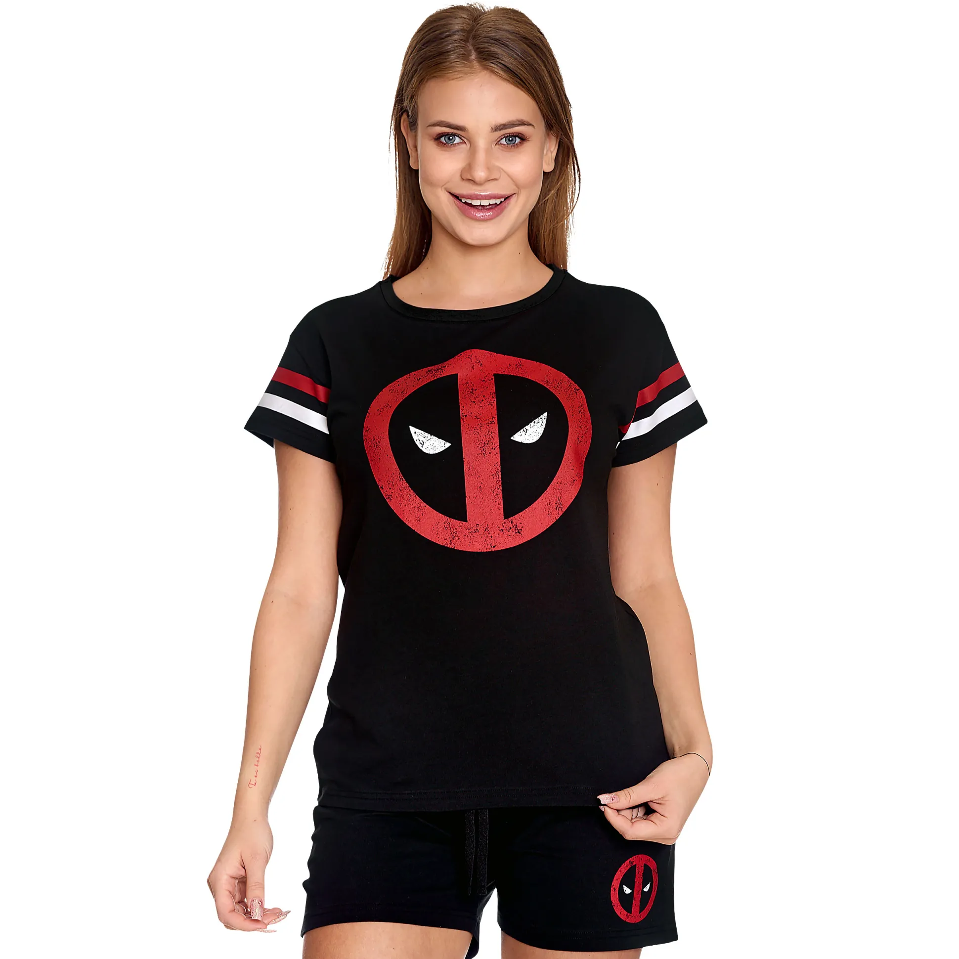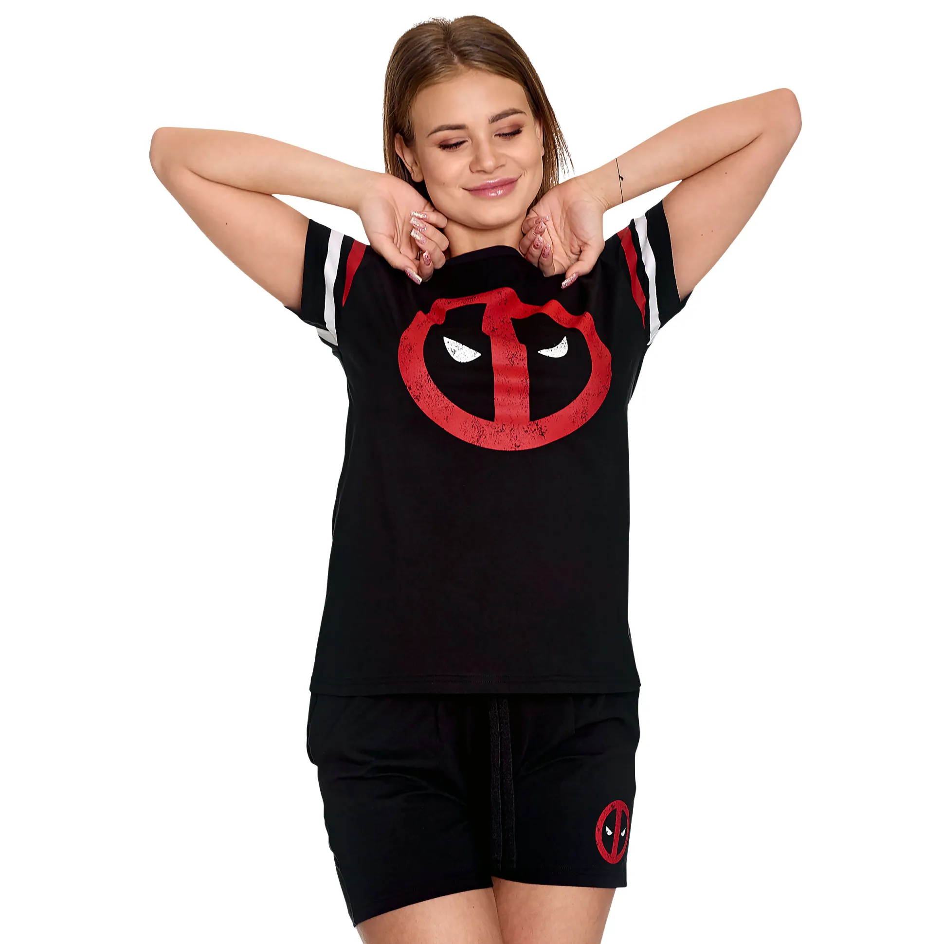 Slaap als een antiheld met de Deadpool Logo korte pyjama voor dames. 2-delig set met T-shirt met ronde hals en korte mouwen en short met elastische taille – beide met Deadpool-logo in verweerde print. Zwart, comfortabel en officieel gelicentieerd door Marvel. Perfect voor bingewatchen, middernachtse chimichanga’s en sarcastische dromen. Upgrade je slaaphol – voor fans van superhelden en antihelden.