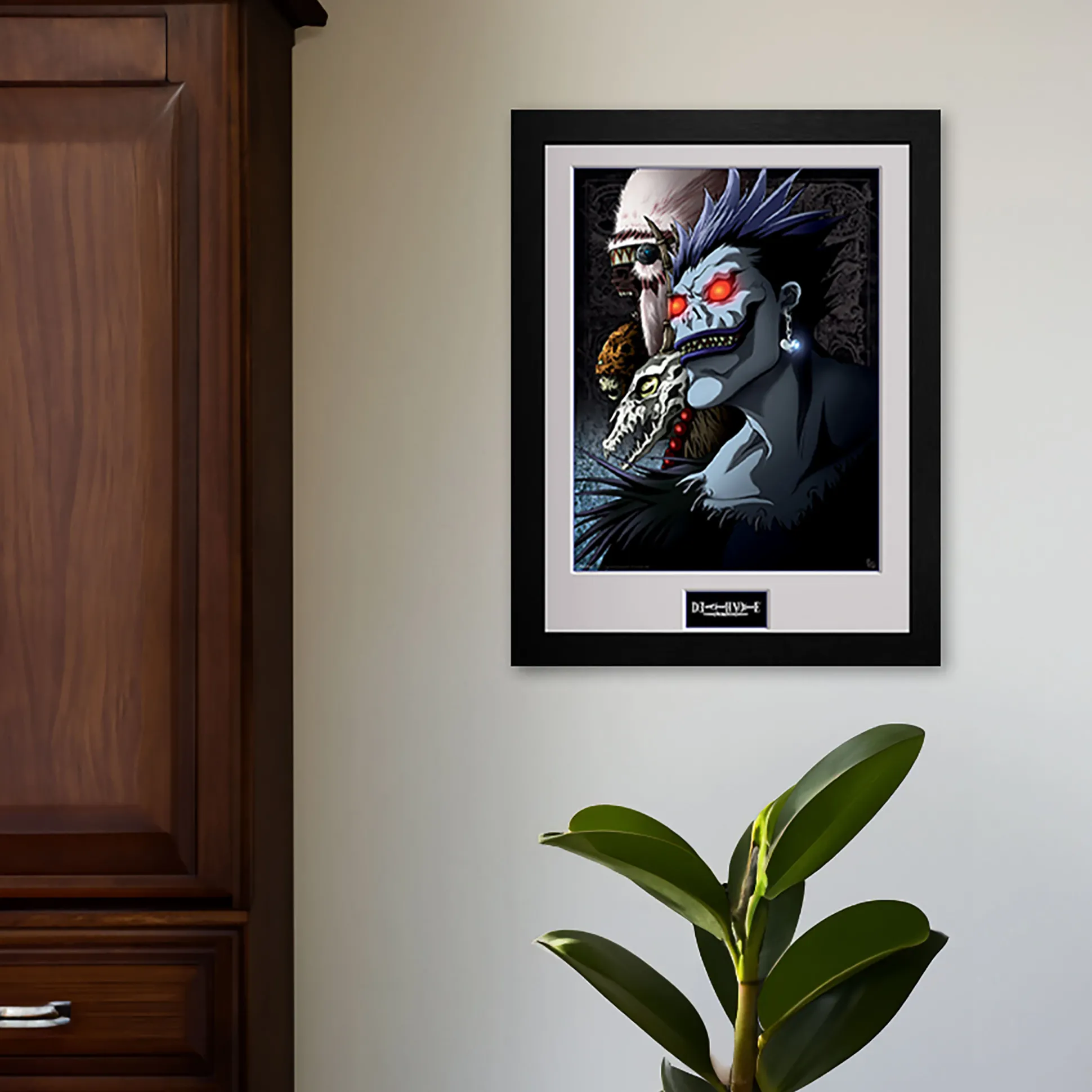 Geen zorgen, deze Shinigami‑wanddecoratie schrijft je naam niet op — hij hangt alleen stijlvol boven je bureau en herinnert je eraan dat Ryuk altijd een oog (en zin in appels) op je heeft. Officieel gelicentieerd door Death Note en geleverd met lijst, is de illustratie met de Goden van de Dood klaar voor je altaar — eh, je woonkamerwand. Met 34 x 1,5 x 44,5 cm valt hij op zonder de rest van je collectie te verslinden. Ophangen? Gaat makkelijk met schroeven — die moet je alleen zelf regelen. Perfect voor iedereen die zijn liefde voor Death Note niet alleen in een notitieboek, maar ook aan de muur wil laten zien.