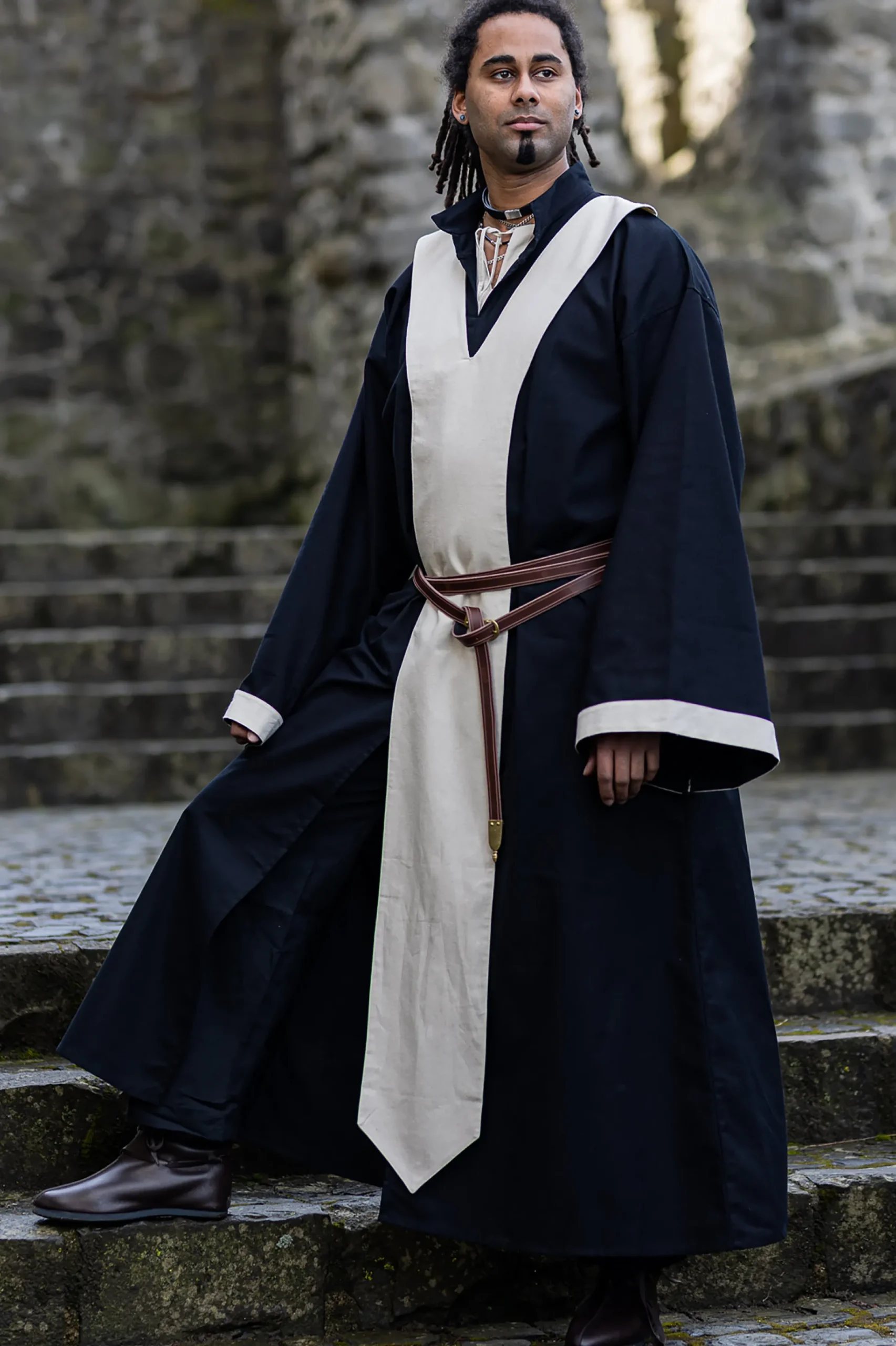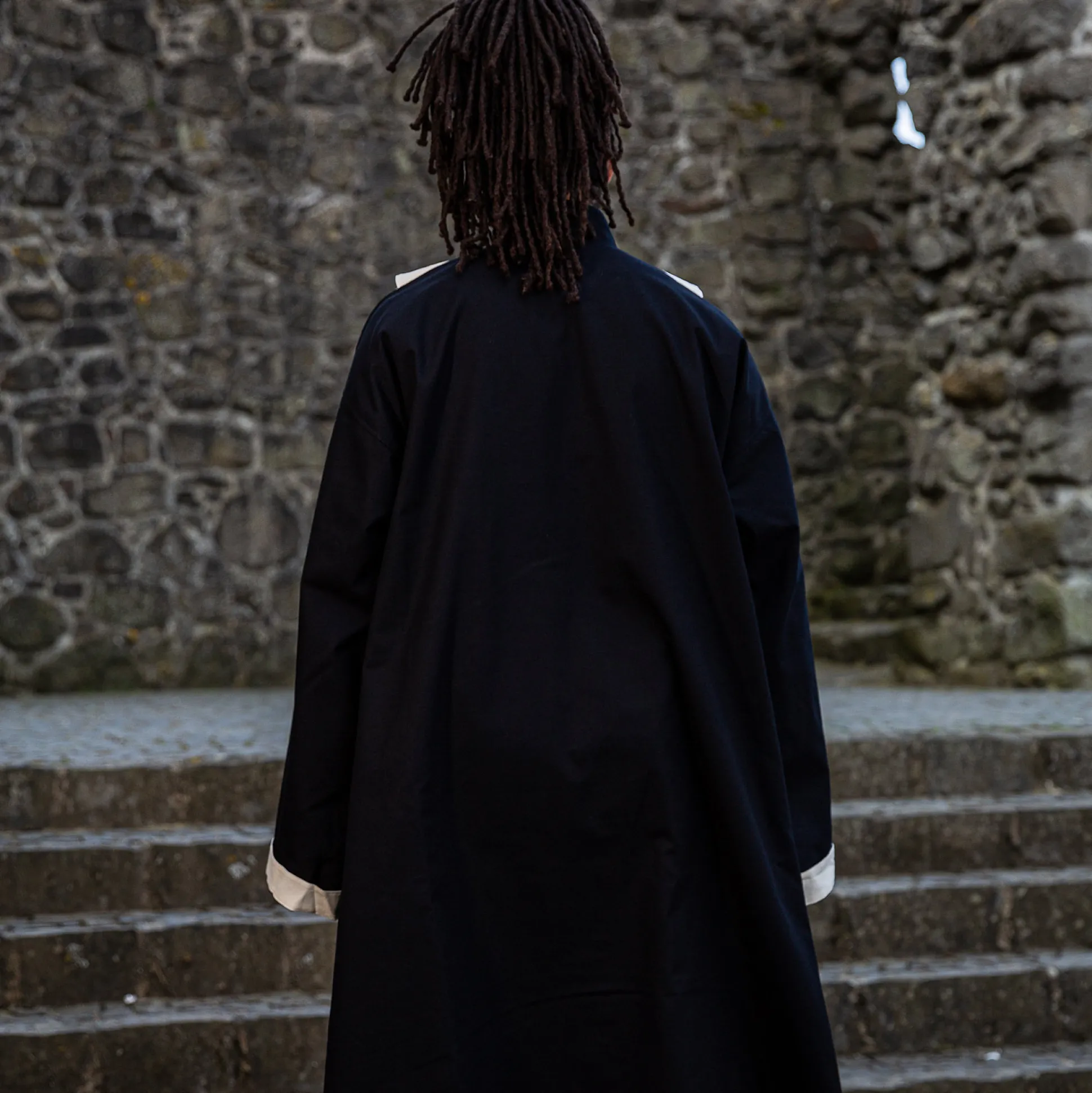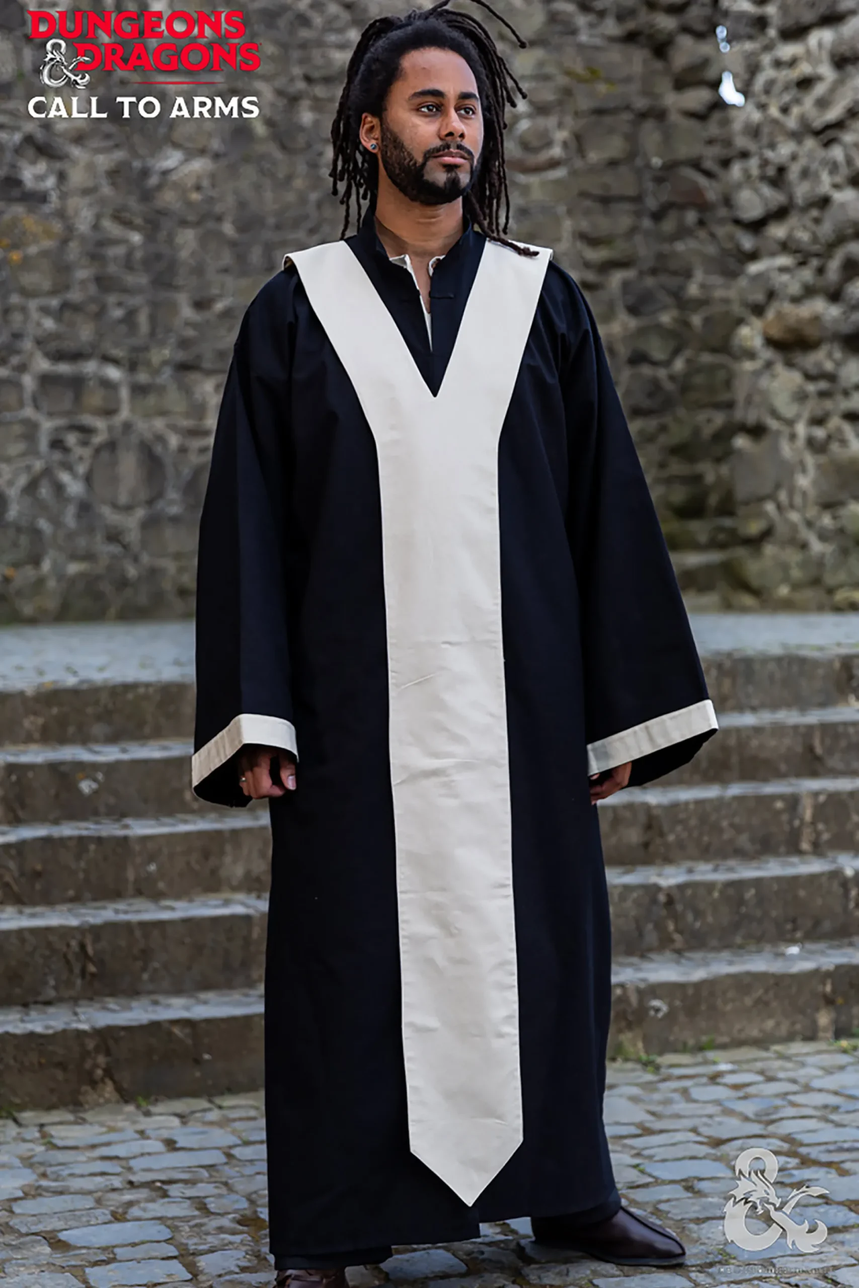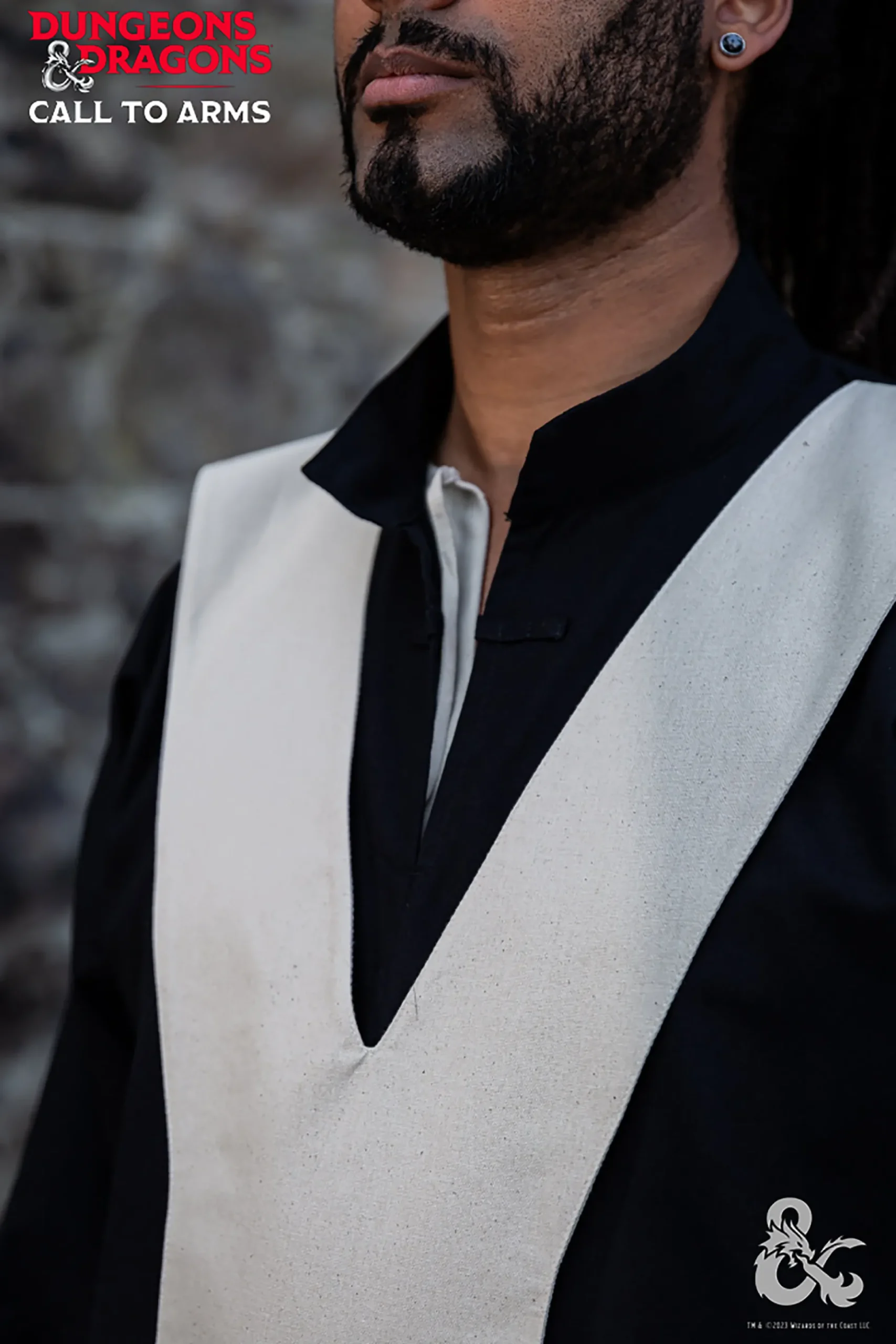 Je volgende sessie belt: dit tovenaarsgewaad in middeleeuwse stijl uit de ‘D&D Call to Arms’-collectie haalt Dungeons & Dragons zo je kledingkast in. Zwart/naturel, clean en klaar voor avontuur — en ja, ook zonder spreukenboek staat ’ie fantastisch. De opstaande kraag heeft een split en lusjes zodat je ’m kunt sluiten of je favoriete broche kunt vastmaken. De brede band aan de voorkant kan op de schouder worden bevestigd en de contrasterende mouwzoom maakt het af. Perfect voor pen-en-paper-avonden, cons, LARP of je dagelijkse tocht naar de taverne: aantrekken, episch ogen, initiatief gooien.