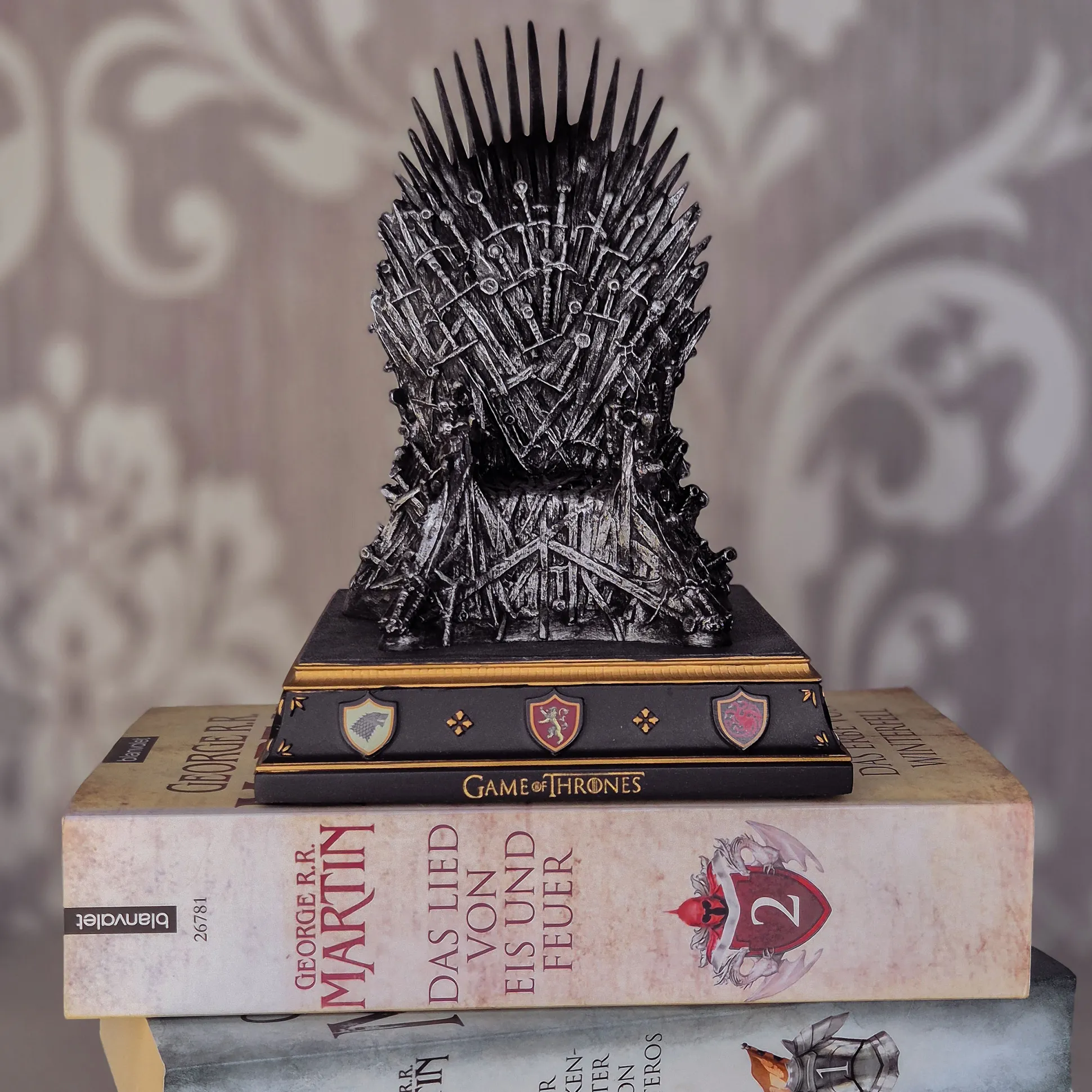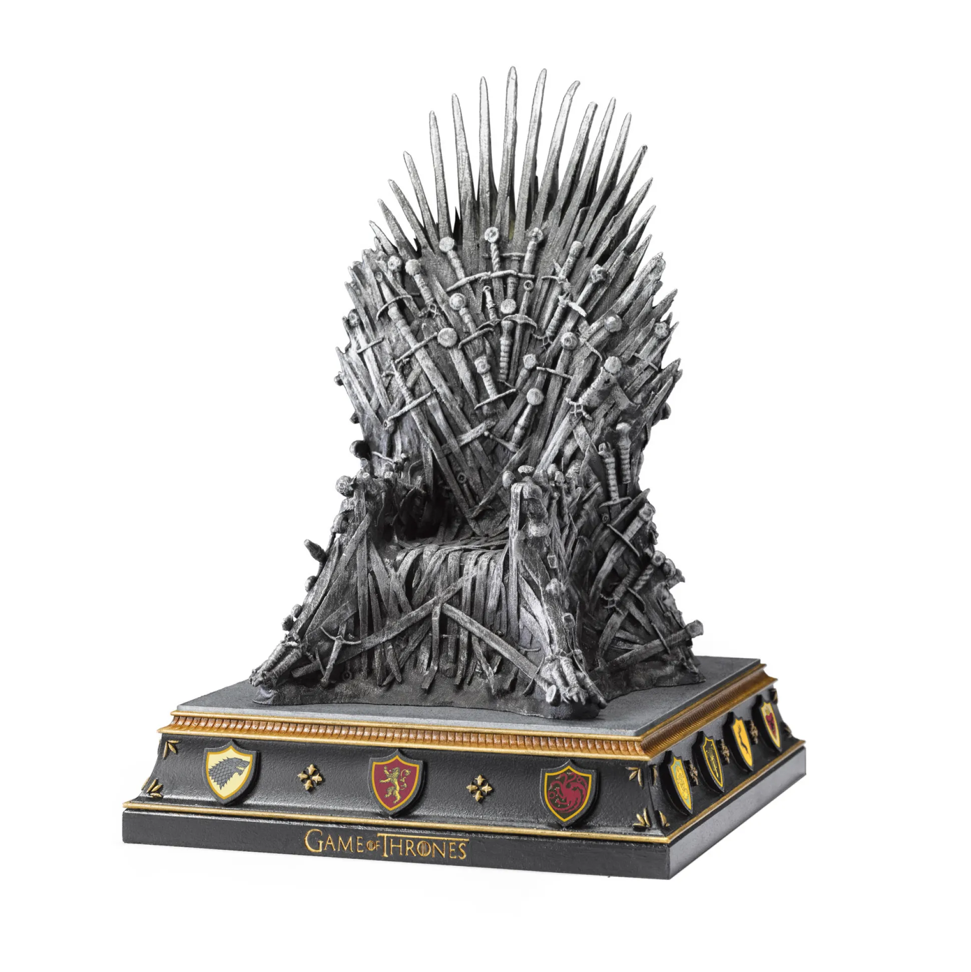 De “IJzeren Troon” als boekensteun, een gedetailleerde replica van de succesvolle fantasy tv-serie “Game of Thrones”. Het spectaculaire beeldje is 20,5 cm hoog en handgeschilderd.