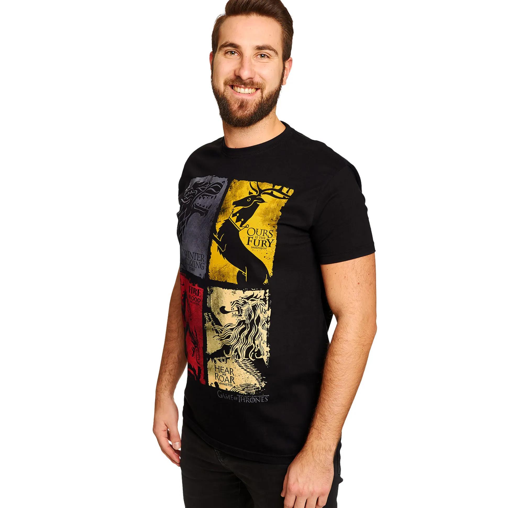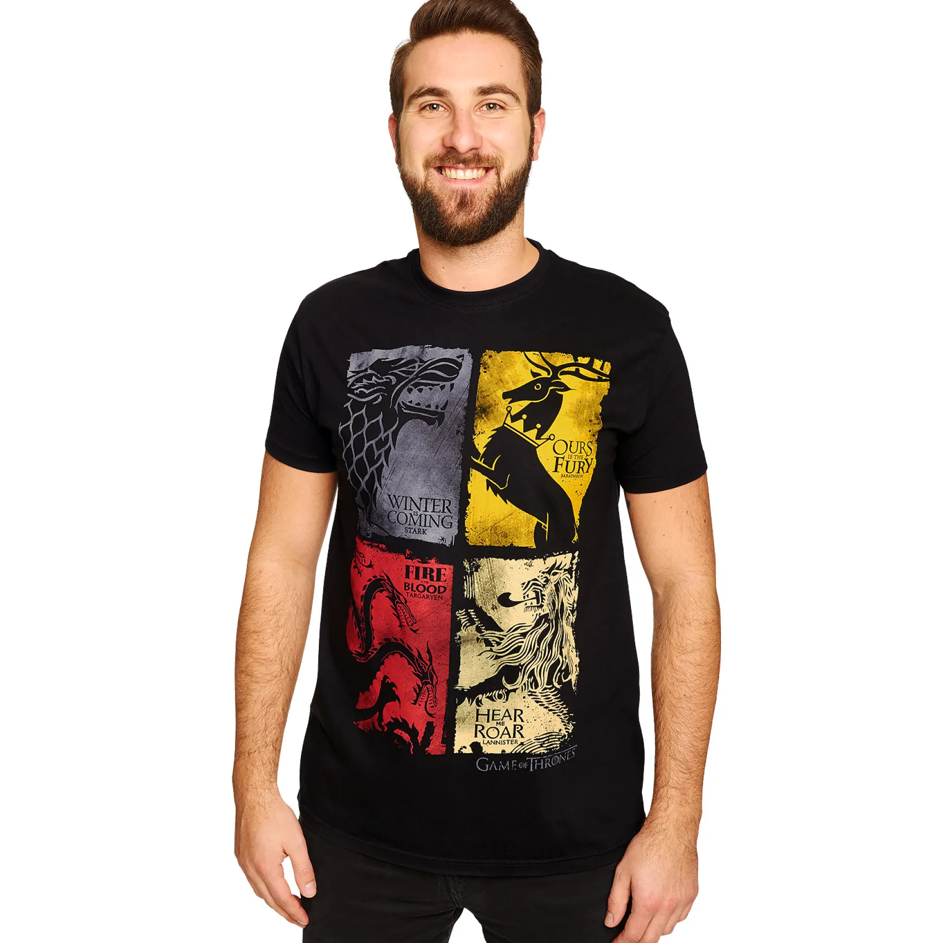 Je hoeft niet te kiezen, want hier krijg je ze allemaal tegelijk: de grootste en belangrijkste huizen uit de hitserie ‘Game of Thrones’. Gepresenteerd door hun expressieve wapenschilden met de bijbehorende motto’s. De schaduwwolf van de Starks blijft heel rustig naast het gekroonde hert van de Baratheons, de driekoppige draak van het huis Targaryen kan (nog) heel goed opschieten met de trotse leeuw van de Lannisters.