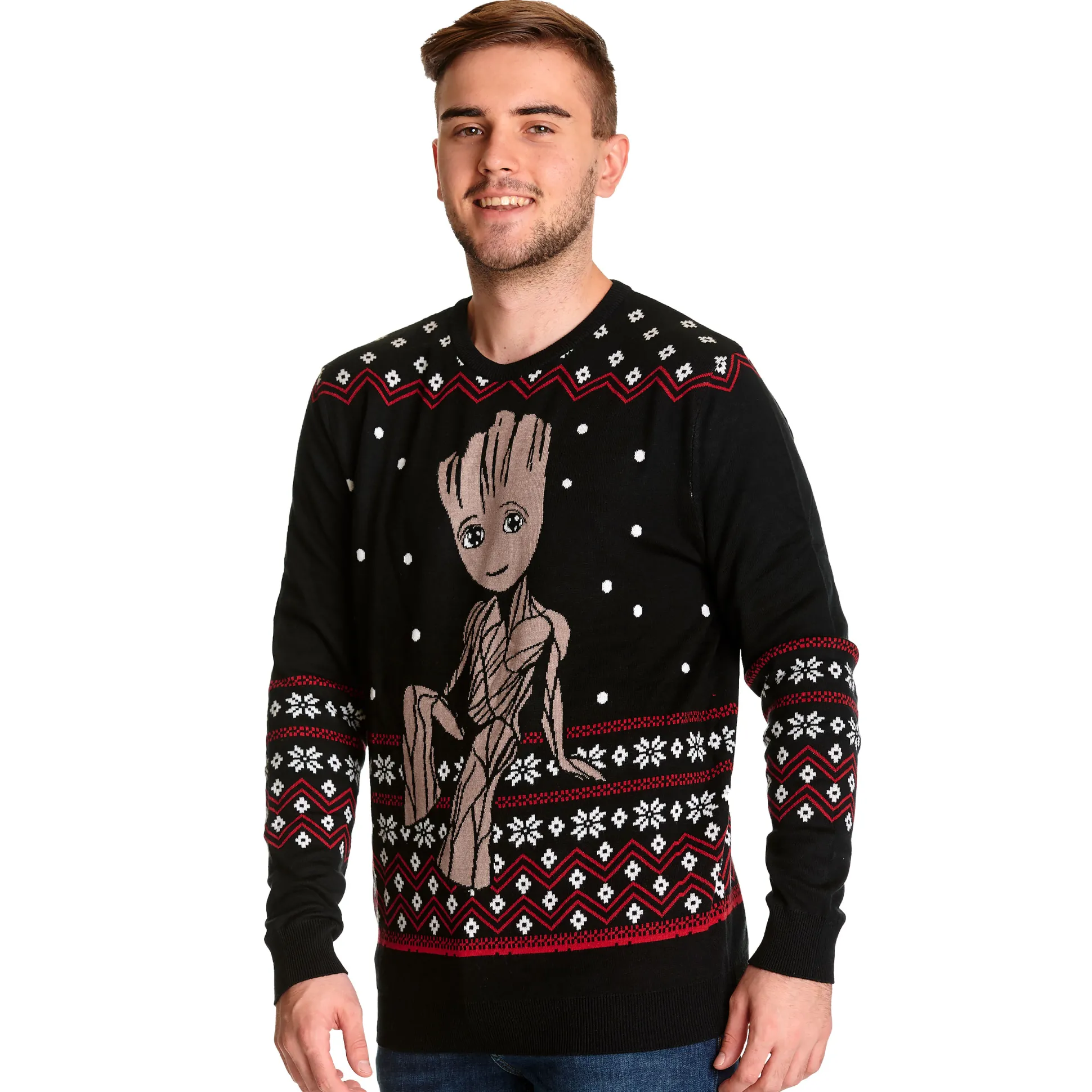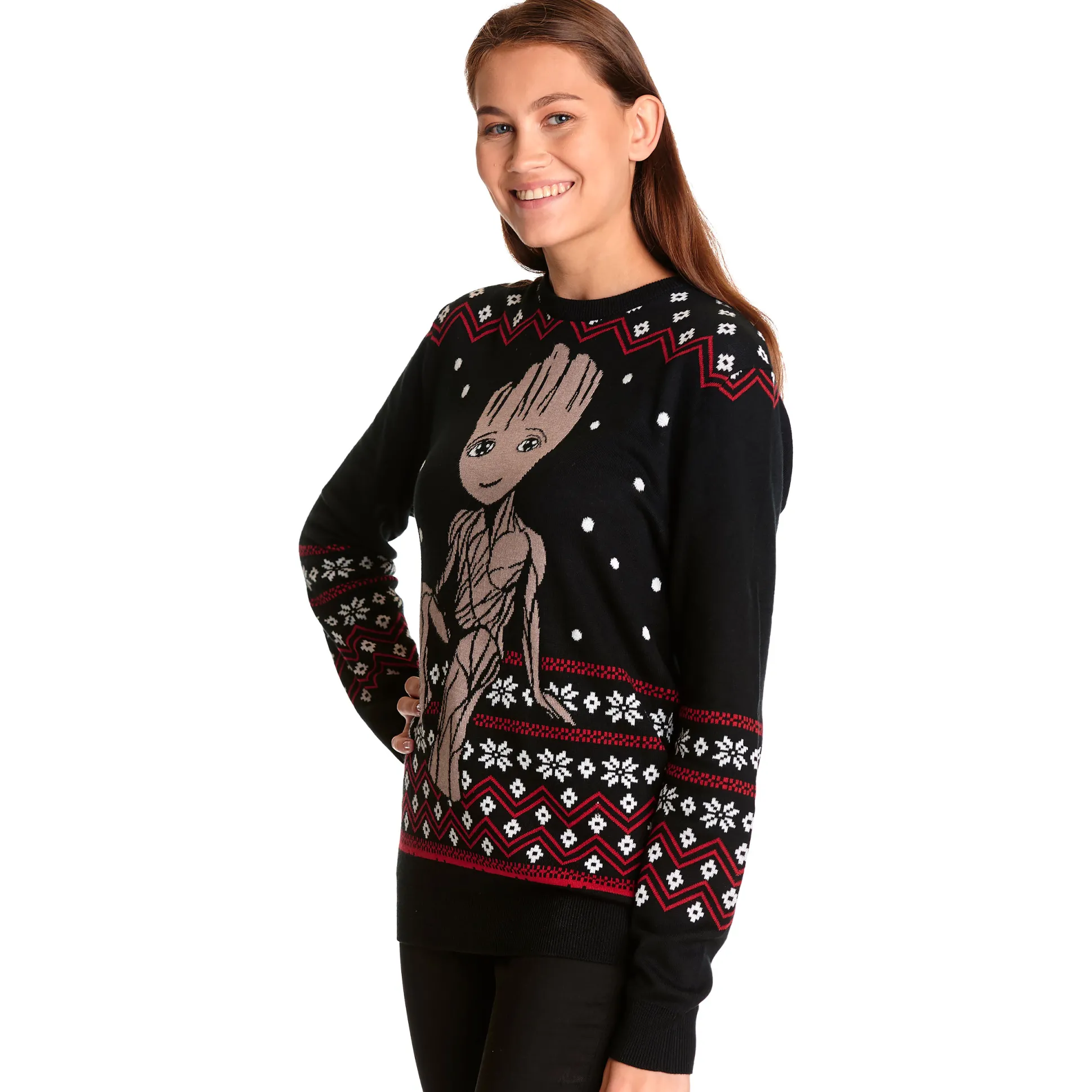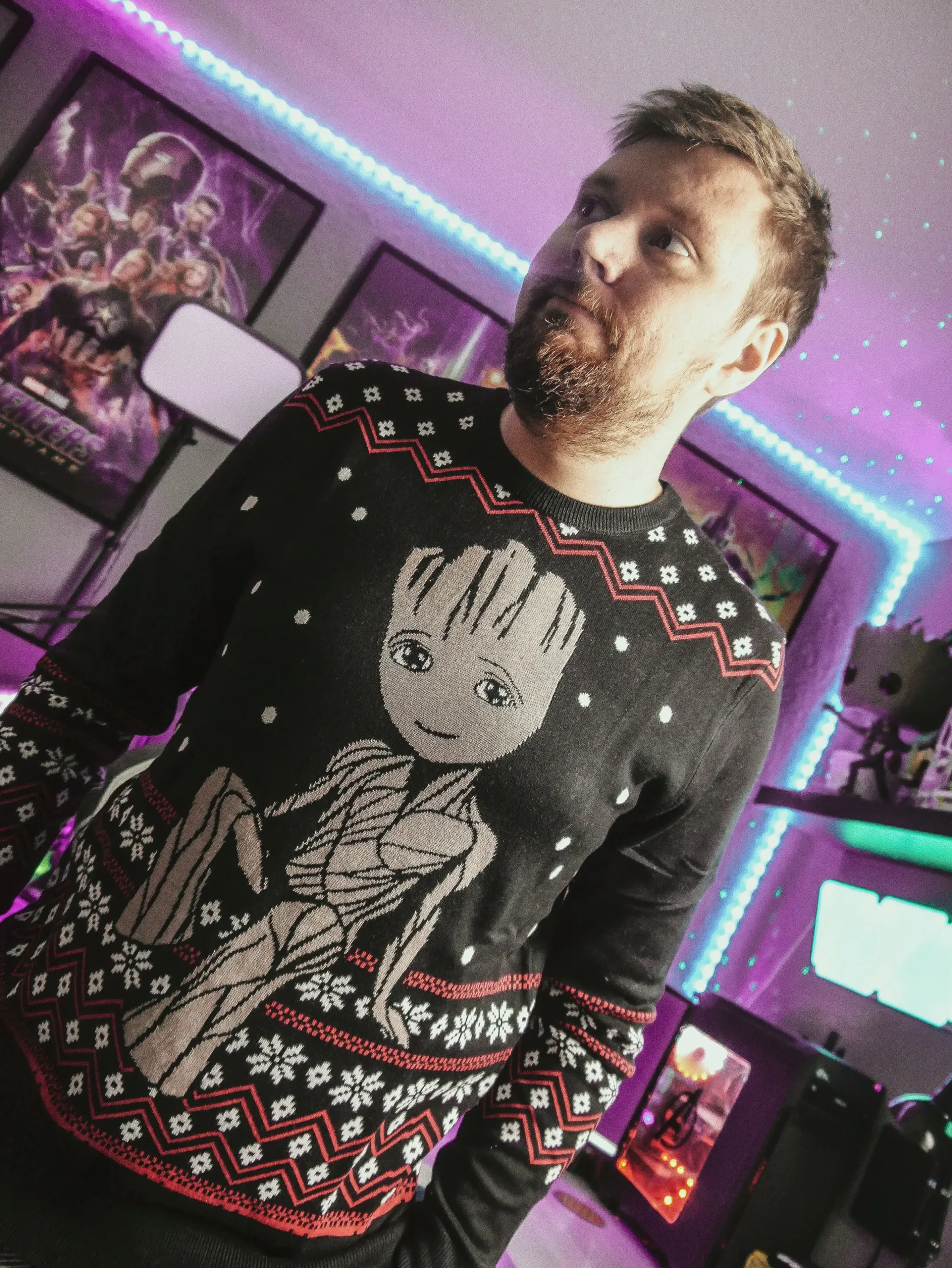 Officieel gelicenseerde Marvel-trui die de Guardians of the Galaxy zo onder je kerstboom dropt — met Groot in een winters Noors patroon, voor én achter. Een foute kersttrui (Ugly Christmas Sweater) die je wél wilt dragen. Zwarte, knusse gebreide trui met ronde hals en rechte pasvorm, plus brede, stevige boorden. Perfect voor kerstborrels, de boom versieren of intergalactisch bingewatchen op de bank. Groot zegt ‘I am…’, jij zegt ‘warm’. Pak ’m en maak je winter lekker Groot.