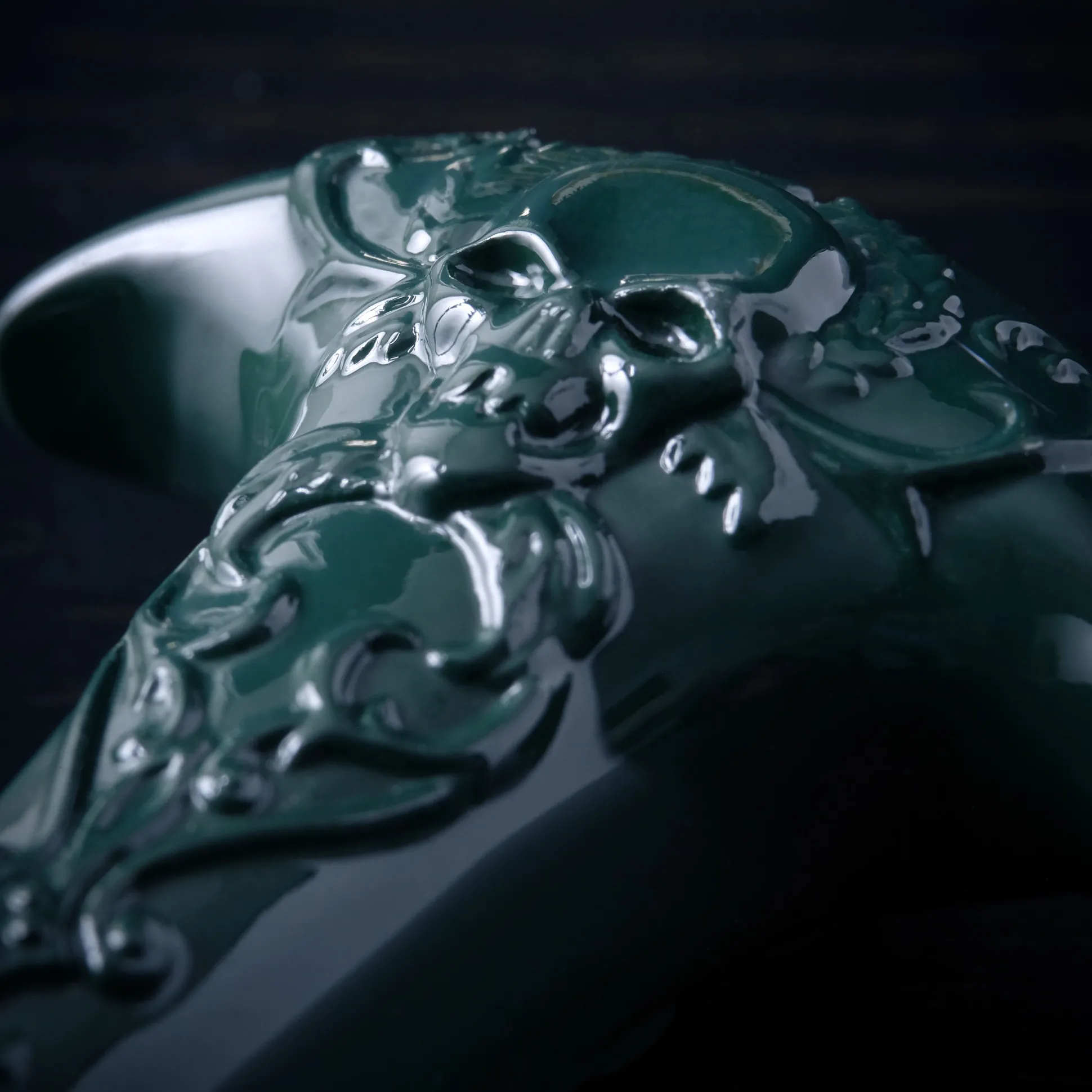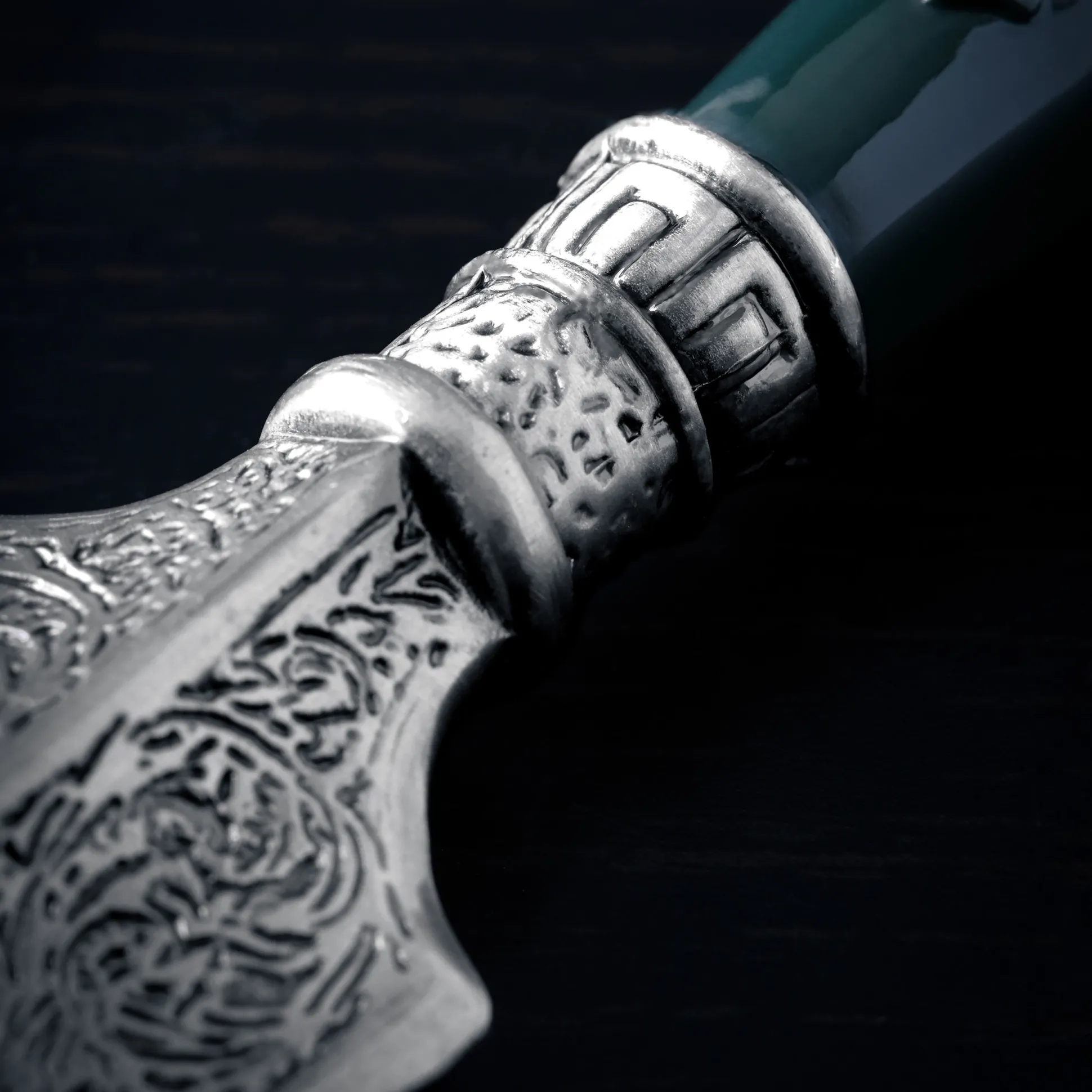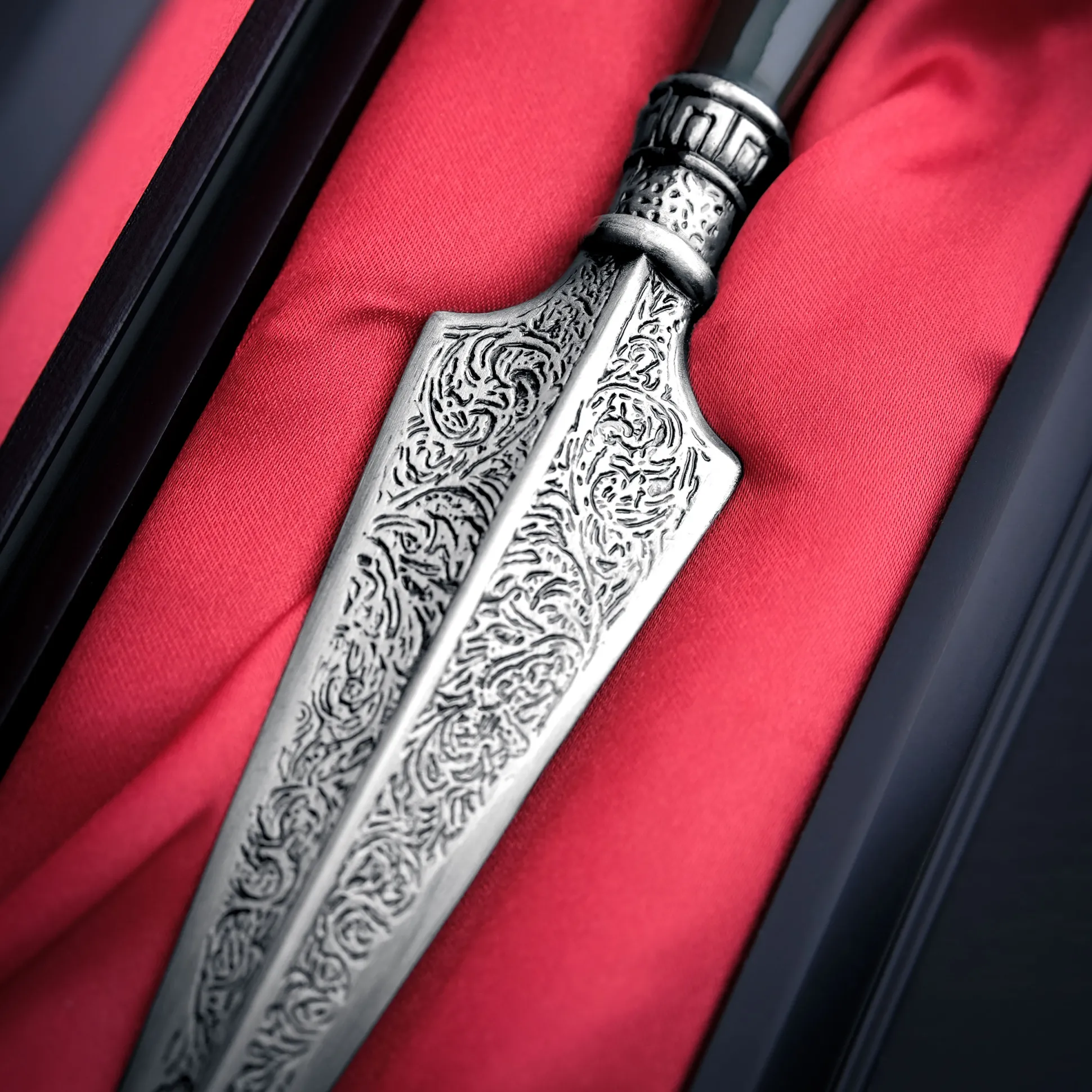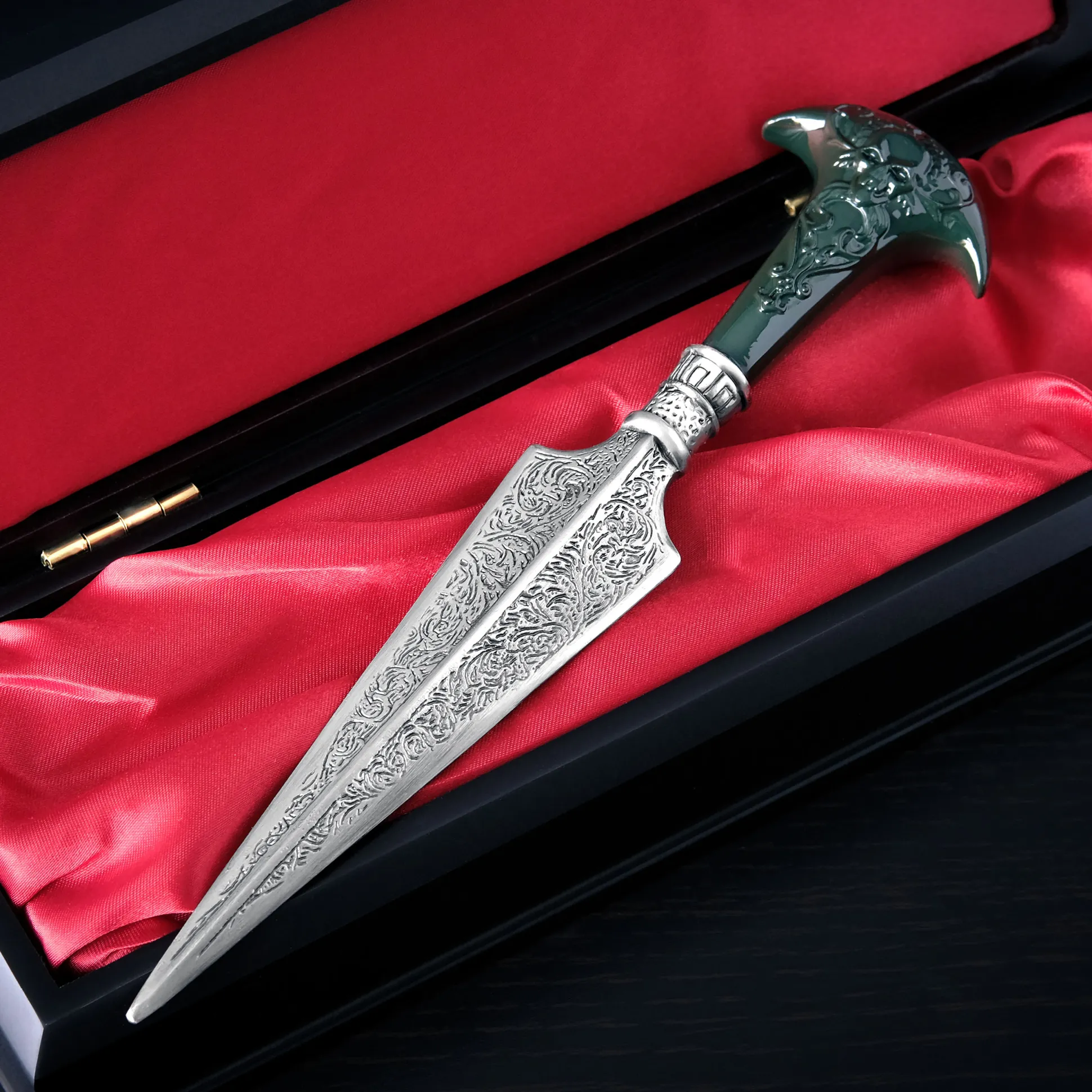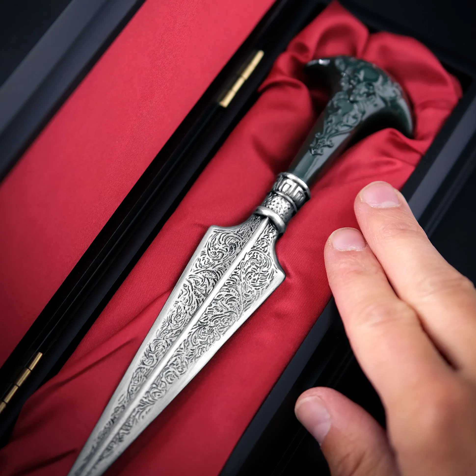 Het is vervaardigd in een spuitgietproces en rijkelijk versierd met ornamenten. Het handvat van de dolk is donkergroen en voorzien van een schedel. Het wordt geleverd in een hoogwaardige verzamelaarsdoos van mat zwart gelakt hout. Binnenin bevindt zich een bijpassende uitsparing bekleed met rood satijn voor de dolk. Op deze manier kan het perfect worden gepresenteerd en is het ook ideaal als cadeau voor Harry Potter fans.
