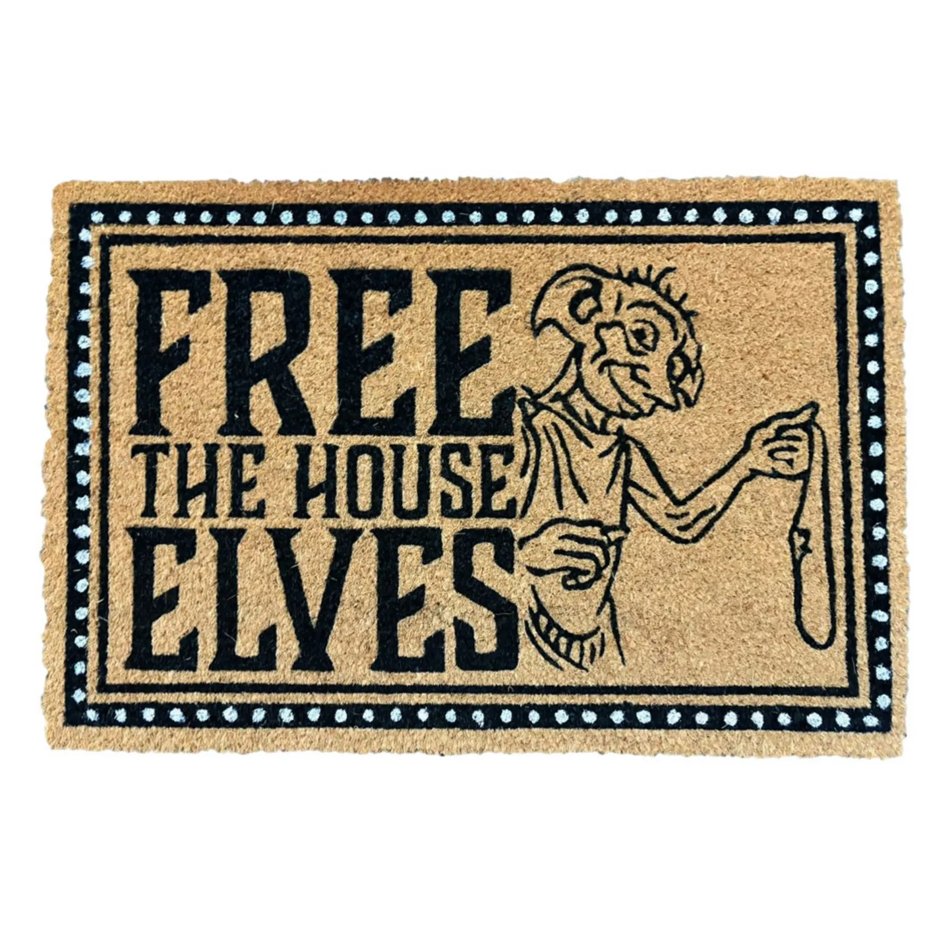 Maak van je voordeur een sokvriendelijke zone voor huiselfen: deze officieel gelicentieerde Harry Potter-deurmat toont Dobby met zijn iconische sok en de oproep “Free the House Elves”. Hij heet je gasten welkom, houdt vuil tegen en blijft keurig liggen dankzij de met kunststof gecoate, antislip-onderzijde. Licht- en waterbestendig, zodat hij er na talloze bezoeken nog steeds uitziet alsof hij net uit de Wegisweg komt. Met 60 x 40 x 1,7 cm past hij voor bijna elke deur – van een Dreuzelappartement tot de Griffoendor-gemeenschappelijke ruimte. Subtiel je liefde voor Zweinstein tonen? Laat Dobby de wacht houden – en je vloeren schoon.