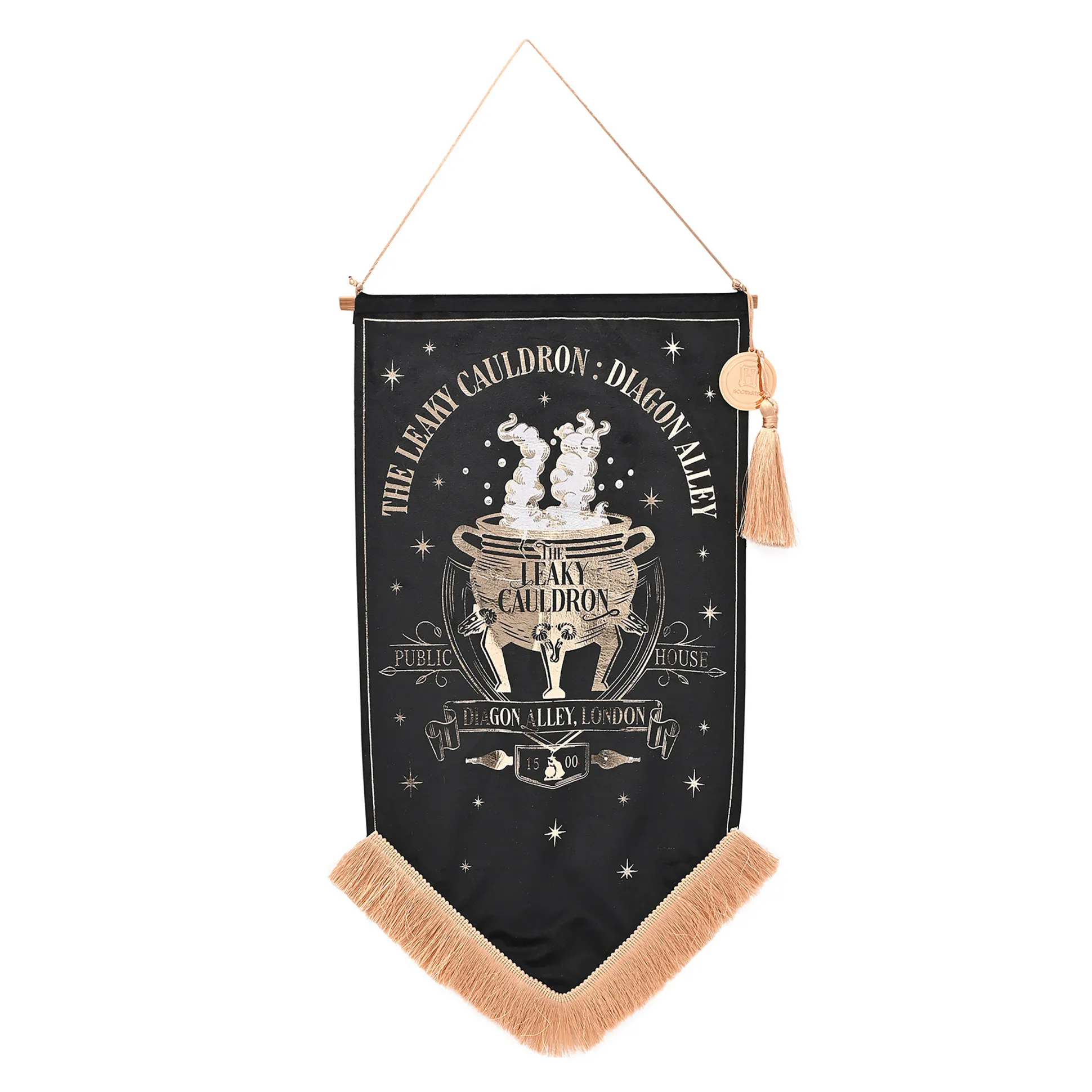 Open je eigen doorgang naar de Wegisweg — zonder op bakstenen te tikken. Deze officieel gelicentieerde Harry Potter-banner haalt De Lekke Ketel zo je muur op: een fluwelen banner met een reliëfmotief van De Lekke Ketel en een goudkleurig ophanglint. Hij hangt aan een houten stang met zwierige kwastjes en een Hogwarts-embleem — alsof hij zo uit de tovenaarswereld je woonkamer is binnengelopen. Met 25,5 x 61 cm past hij perfect in de keuken, thuisbar, hal of knusse leeshoek. Maakt elke Dreuzelwand meteen magisch en gaat uitstekend samen met boterbier (echt of ingebeeld). Lekt niet echt — ziet er alleen legendarisch uit.