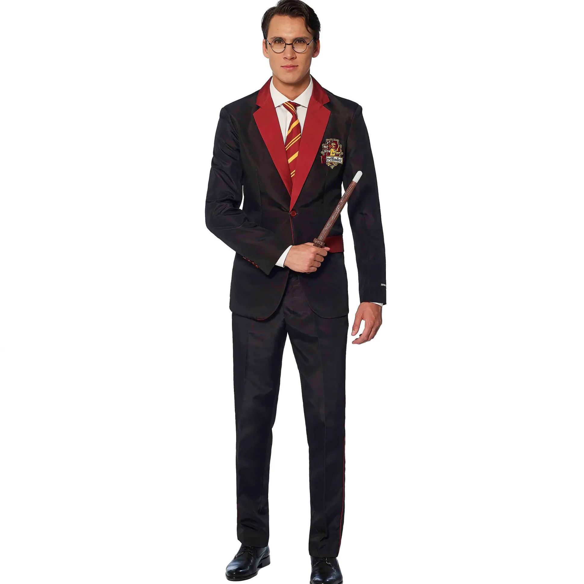 De broek zit comfortabel, met rits- en knoopsluiting en twee steekzakken – ideaal voor een paar Galjoenen of je Sluipwegwijzer. En natuurlijk wordt er een bijpassende stropdas meegeleverd om je Griffoendor look compleet te maken.
